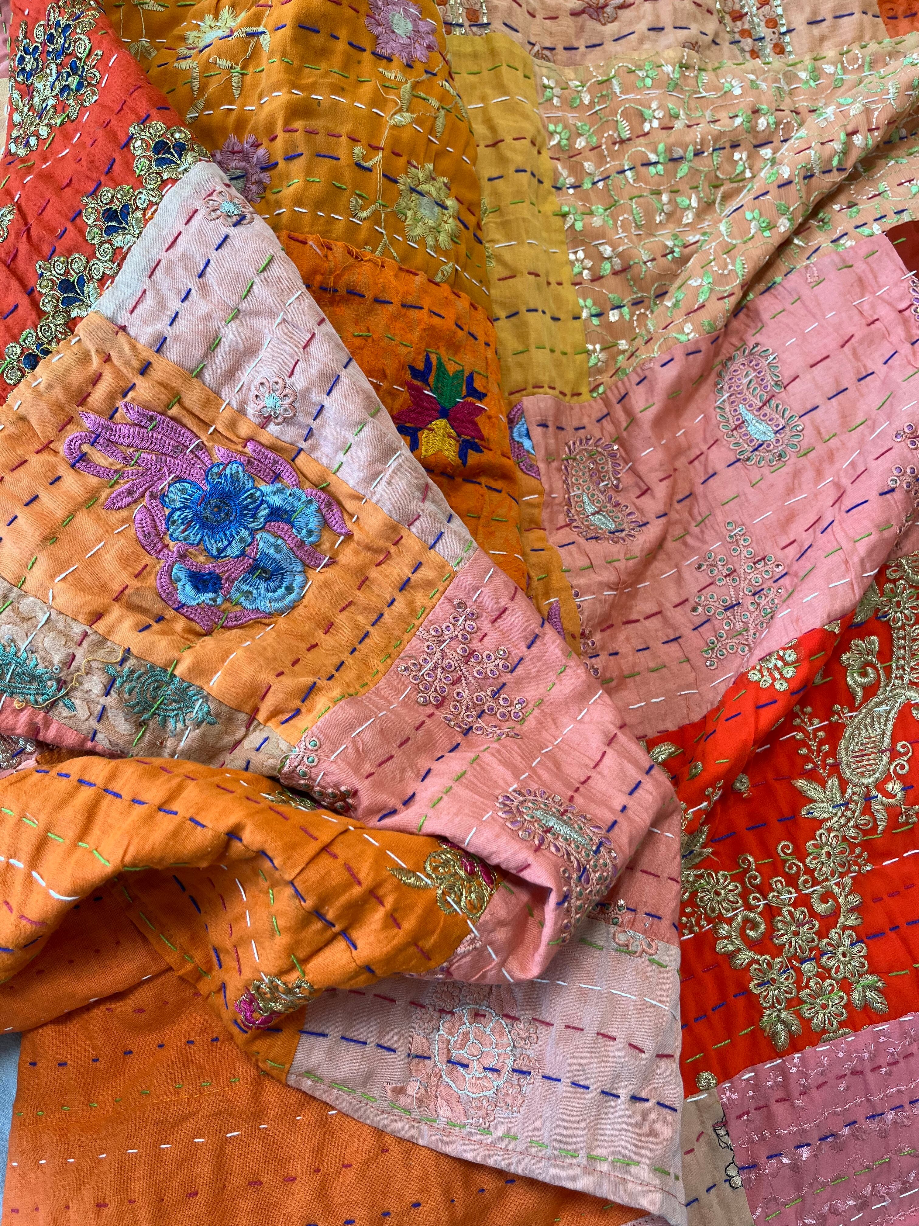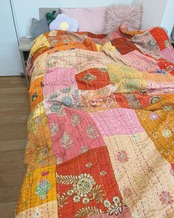 繋ぎ合わせたパッチワークキルトはとても華やか。