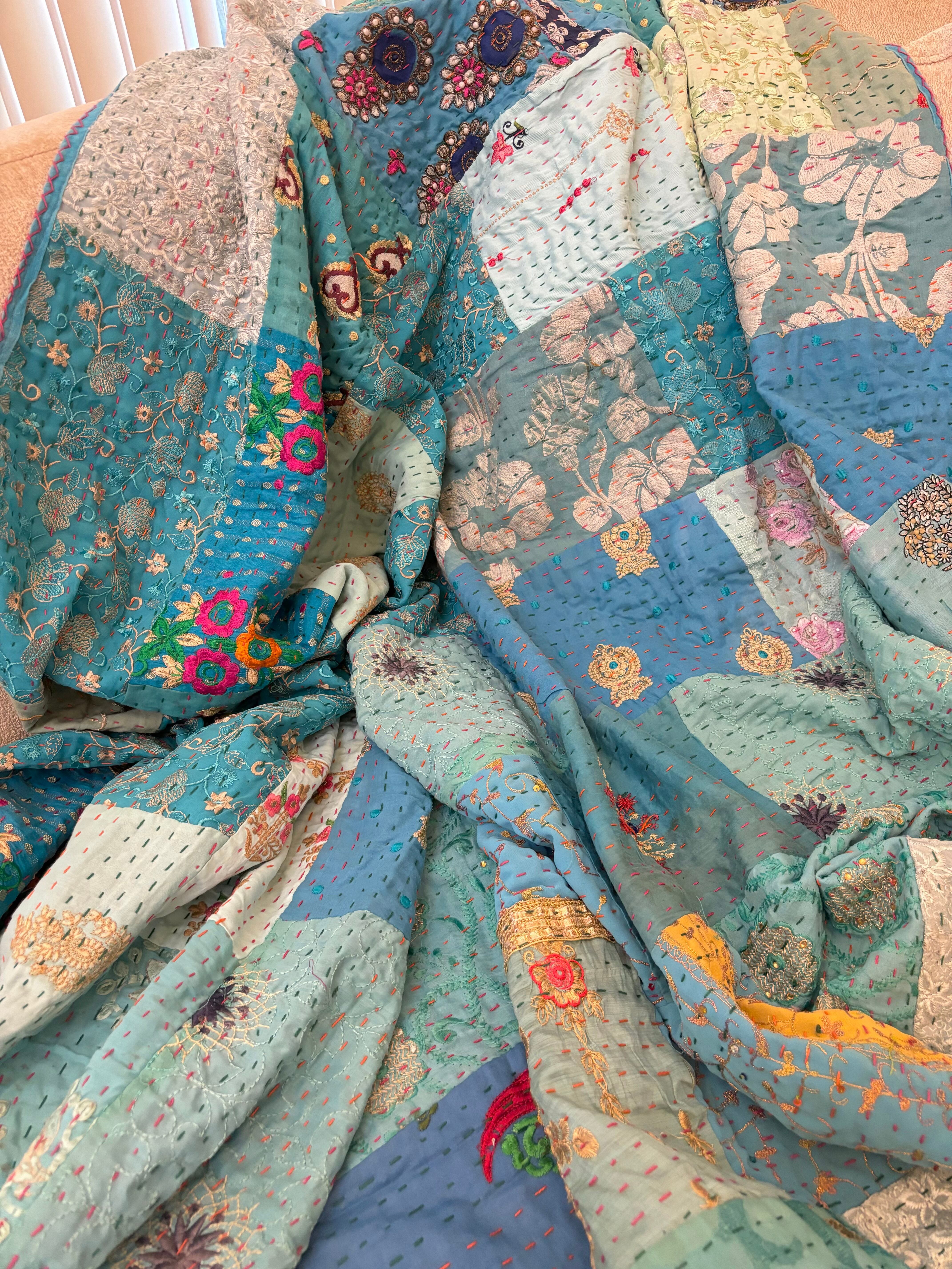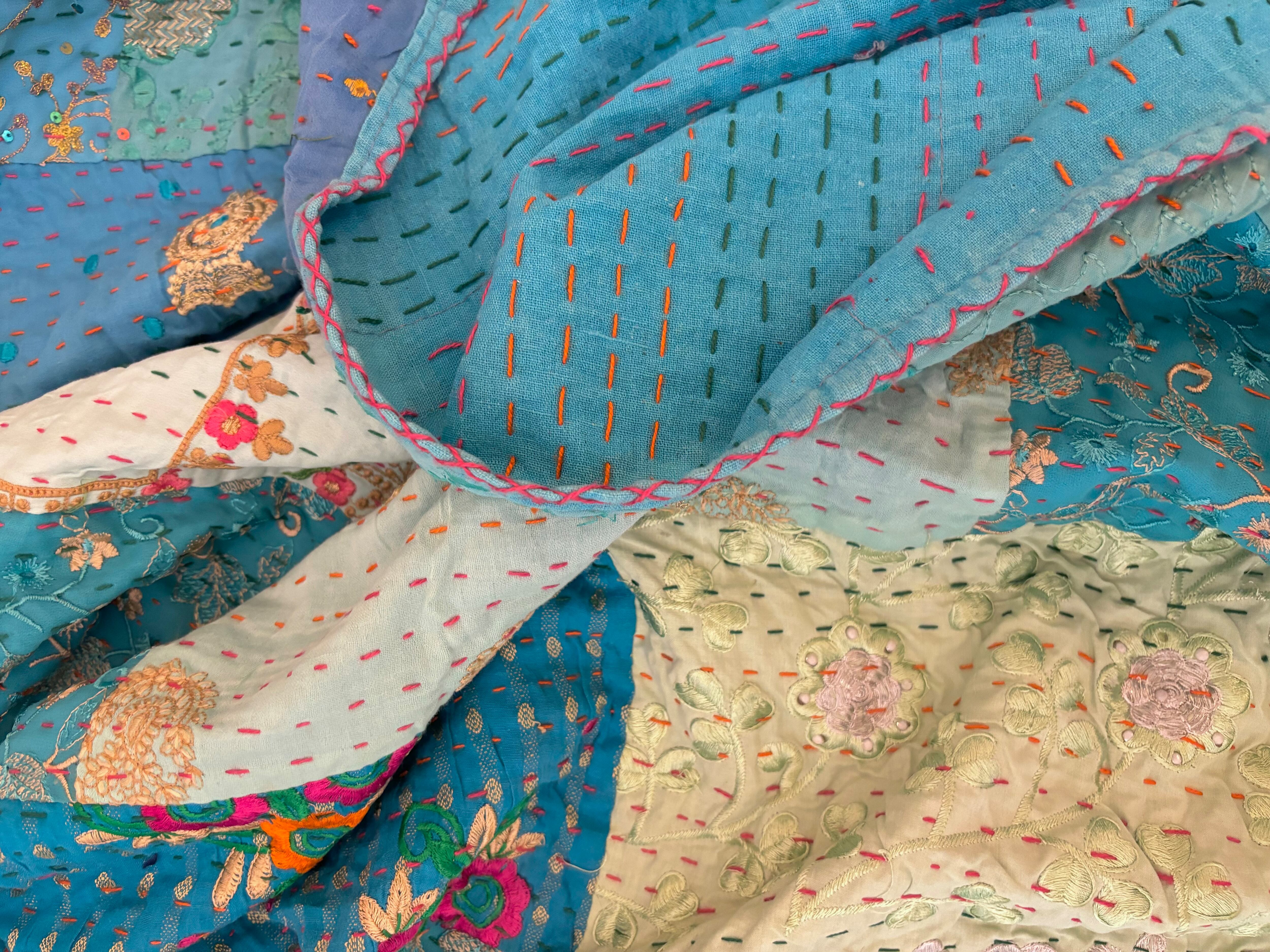 繋ぎ合わせたパッチワークキルトはとても華やか。