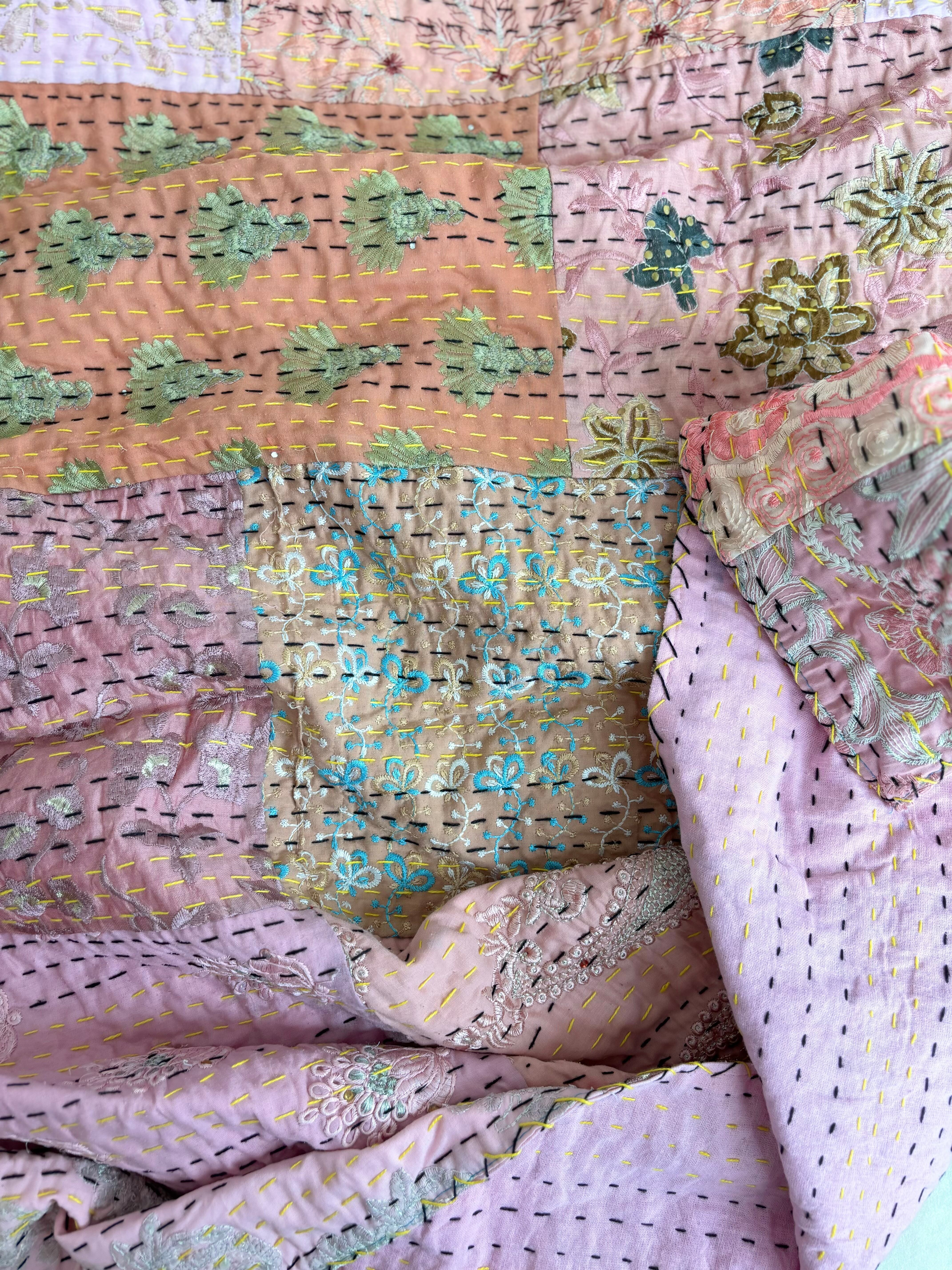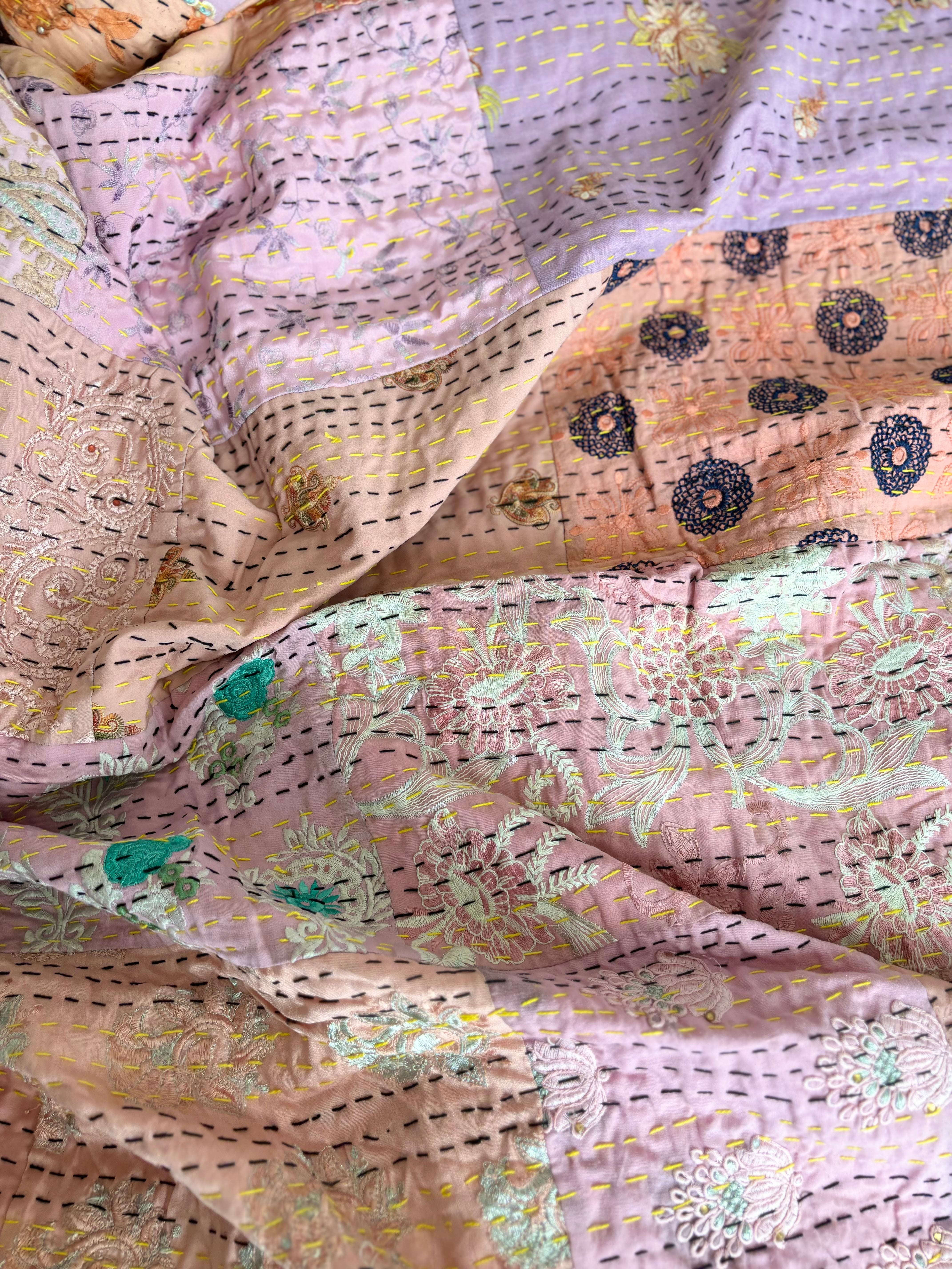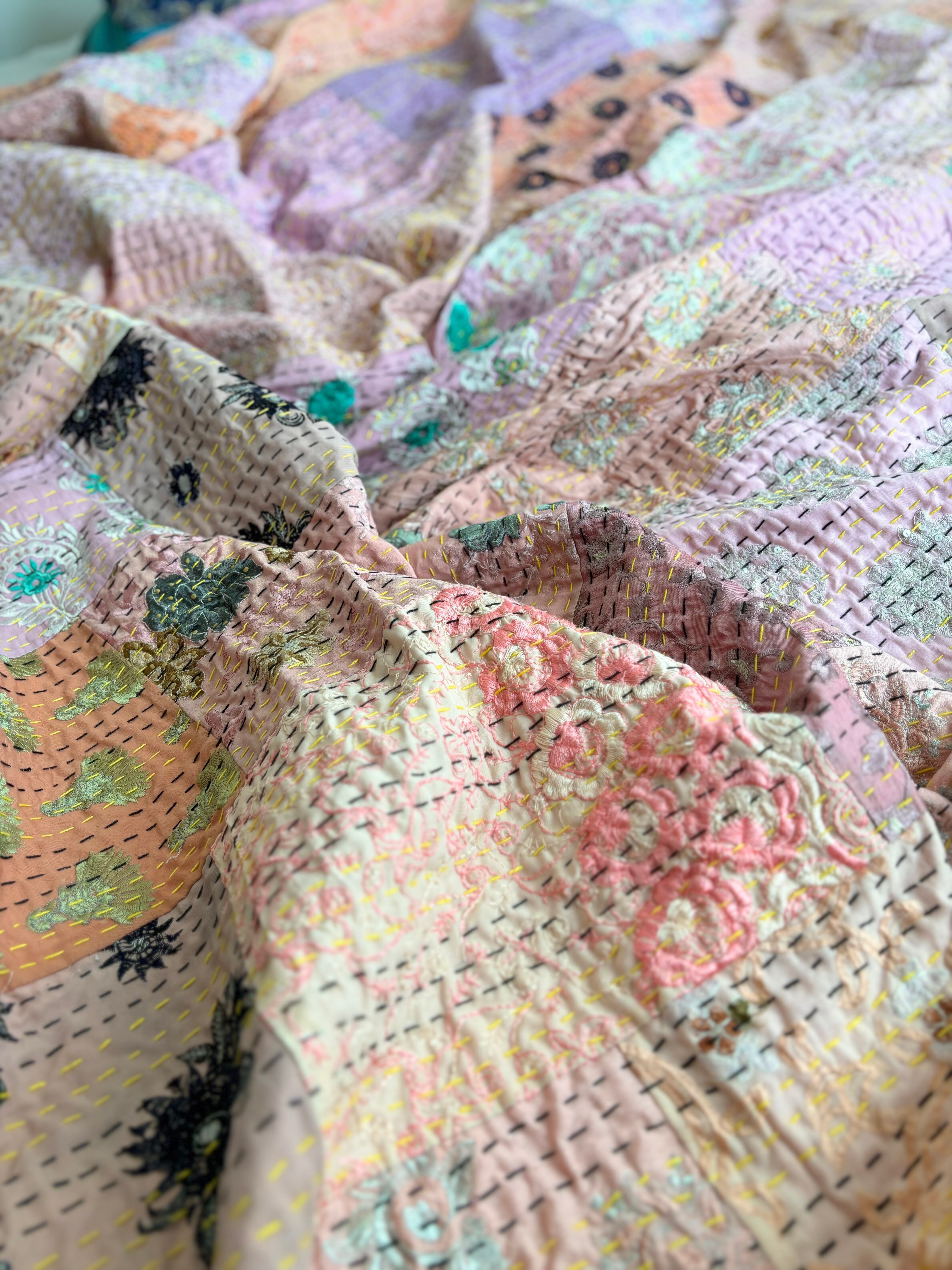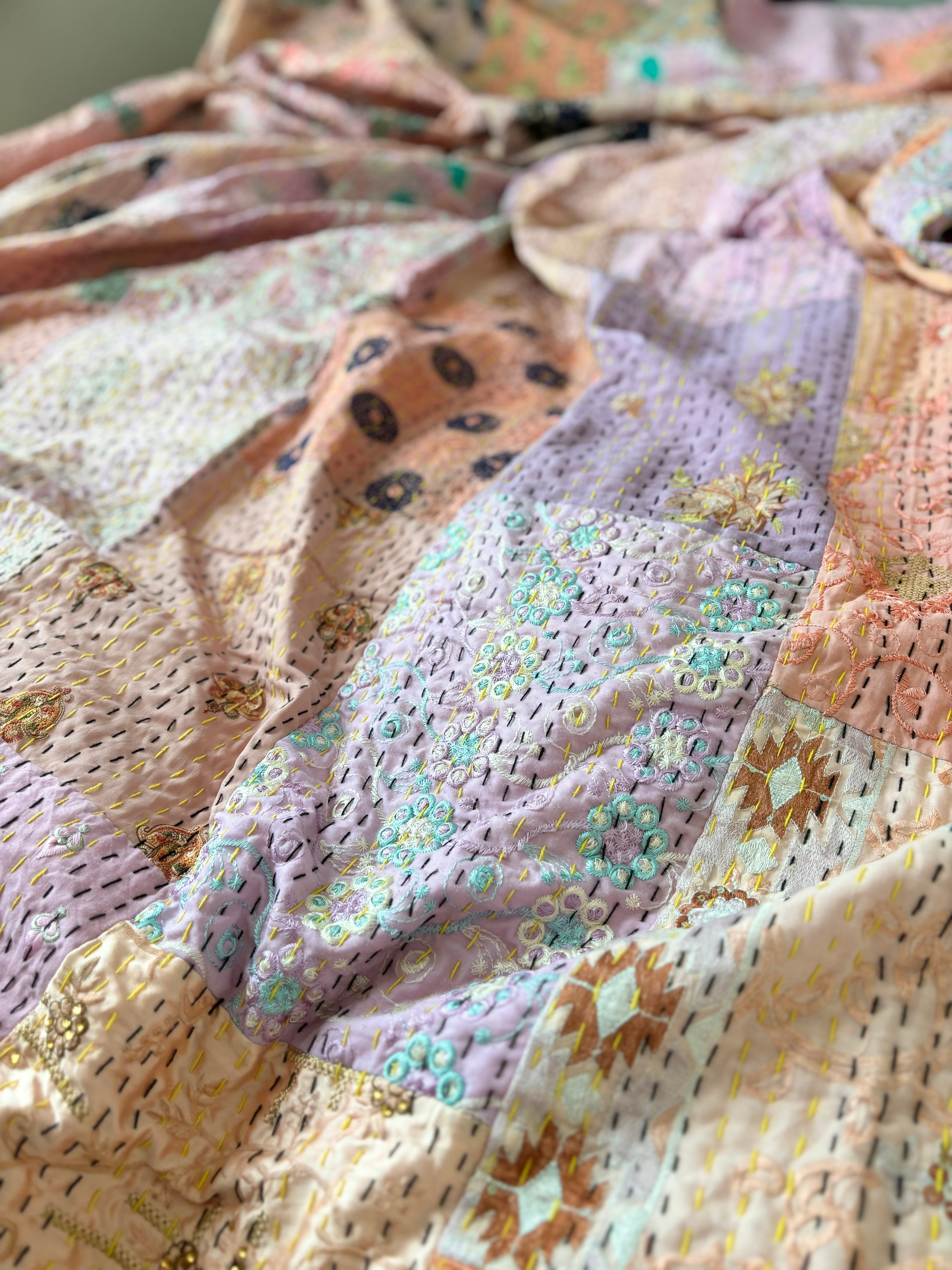繋ぎ合わせたパッチワークキルトはとても華やか。