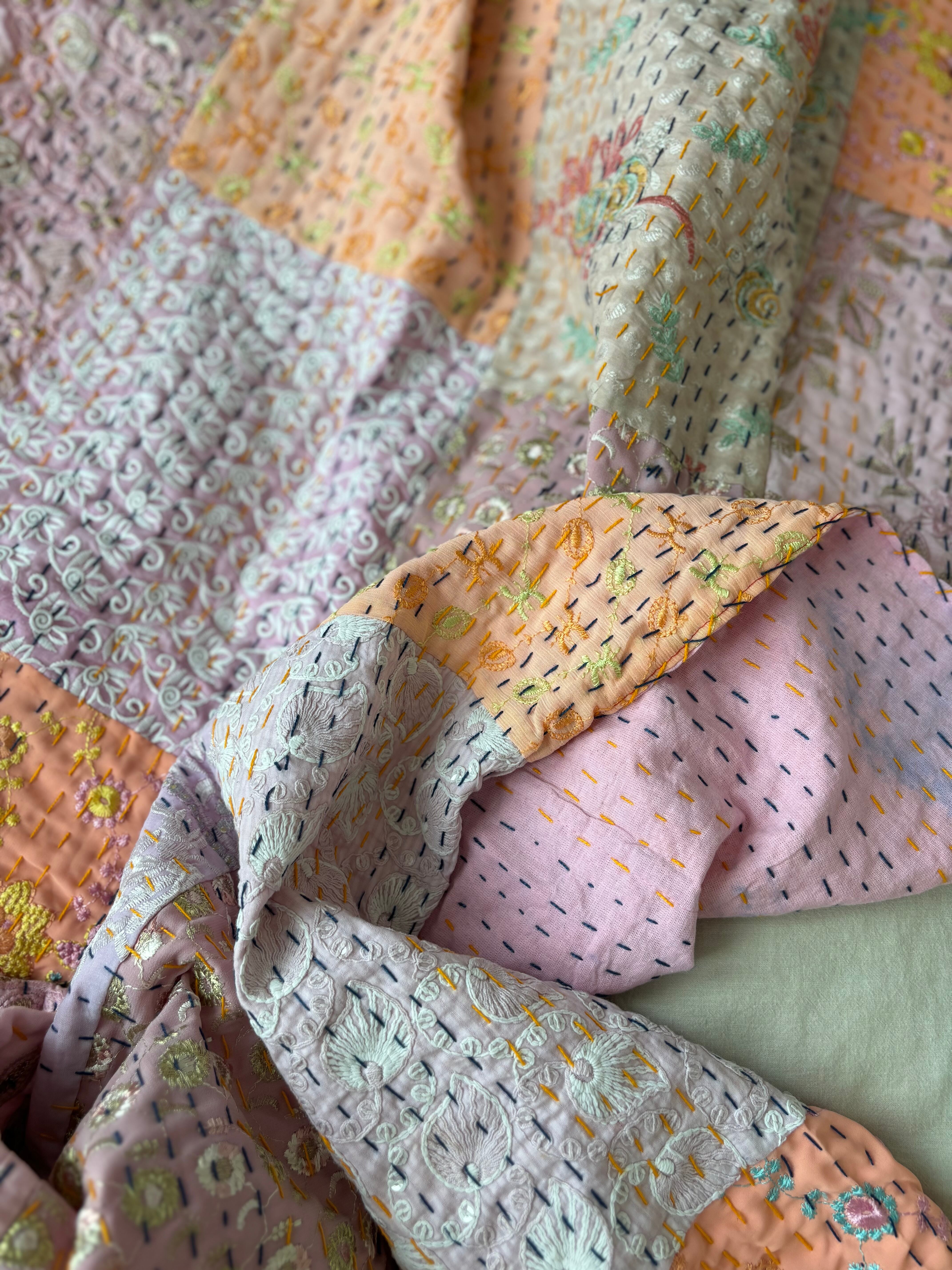 繋ぎ合わせたパッチワークキルトはとても華やか。