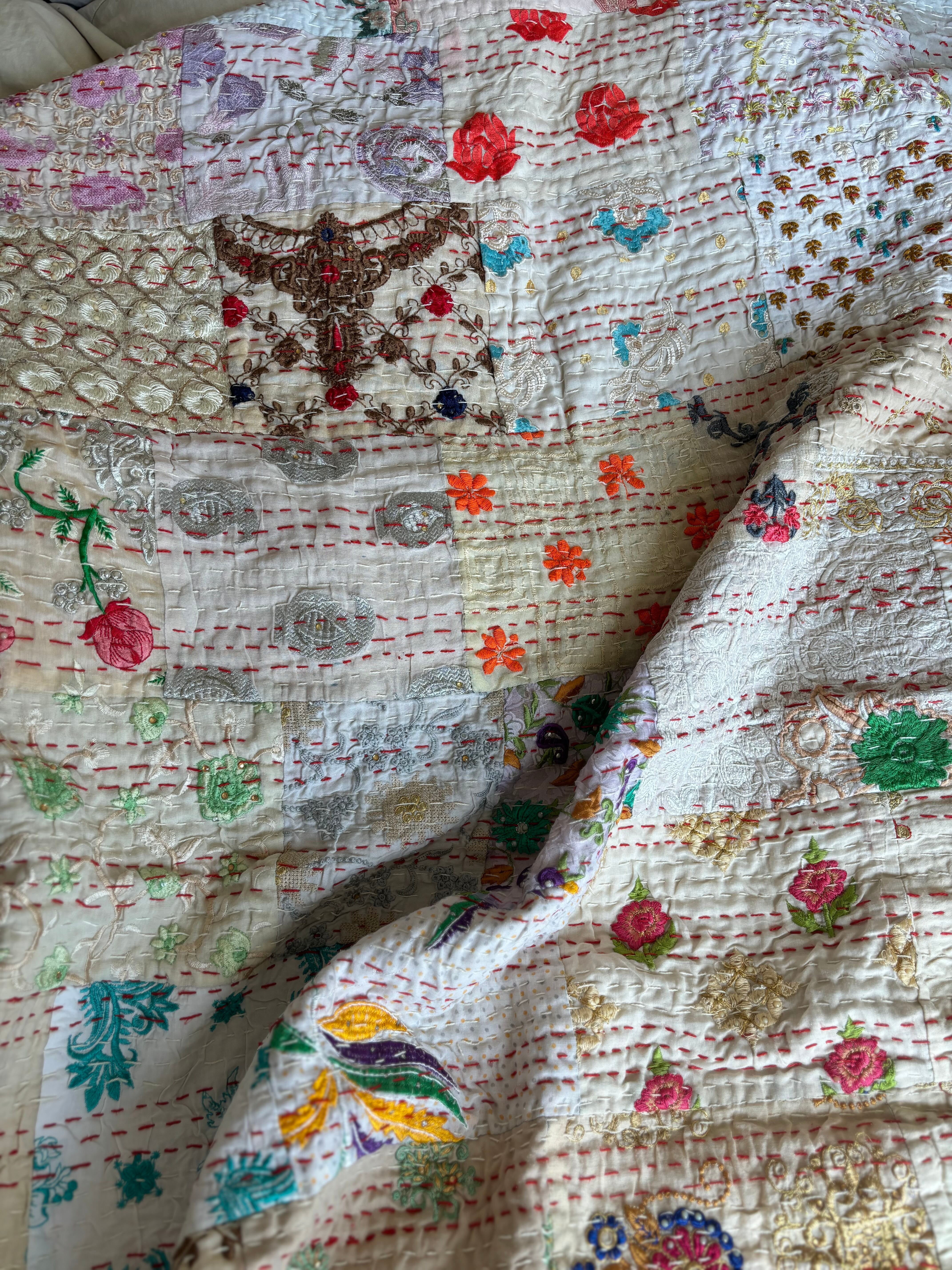 繋ぎ合わせたパッチワークキルトはとても華やか。