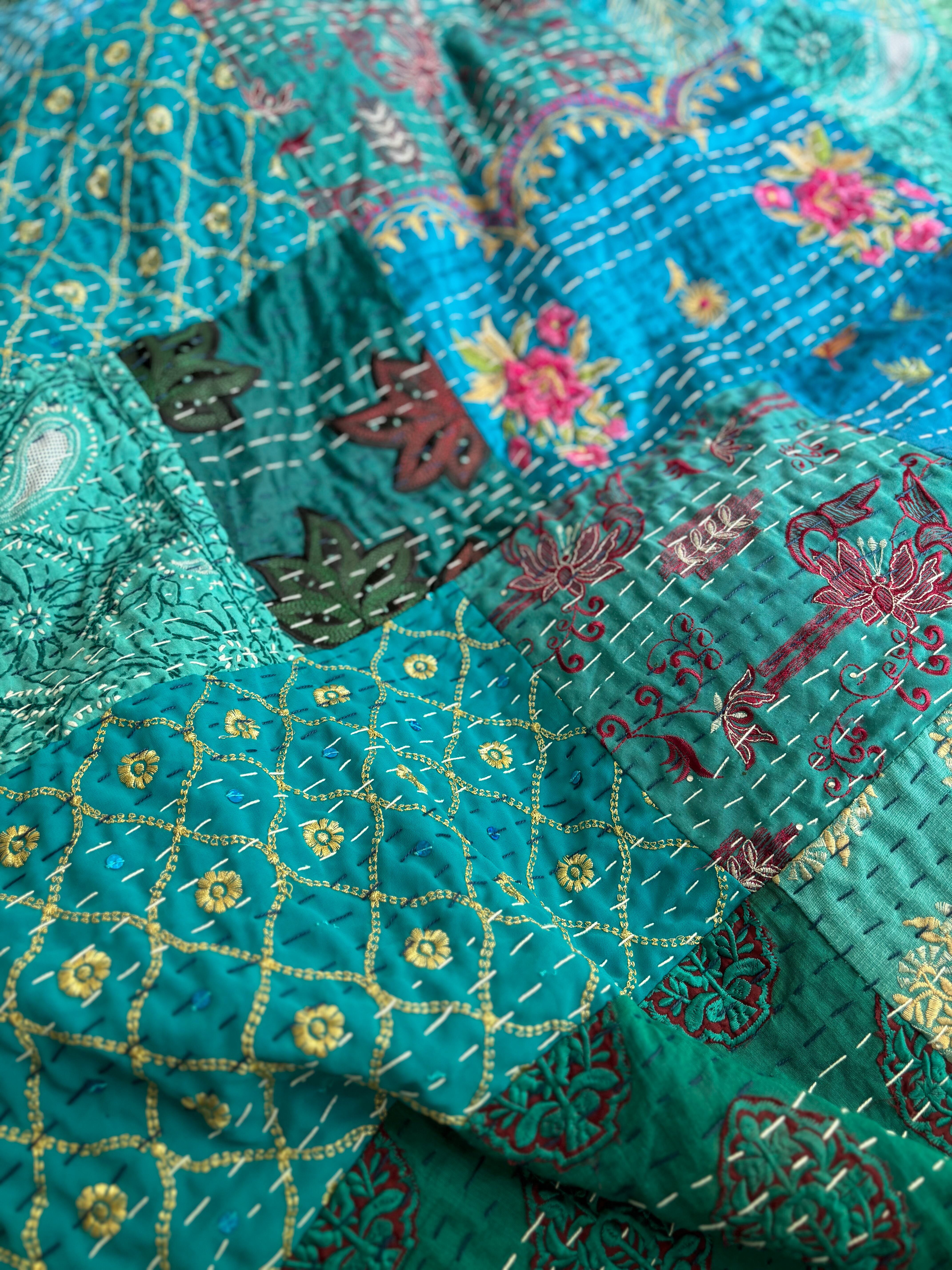 繋ぎ合わせたパッチワークキルトはとても華やか。