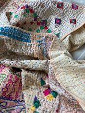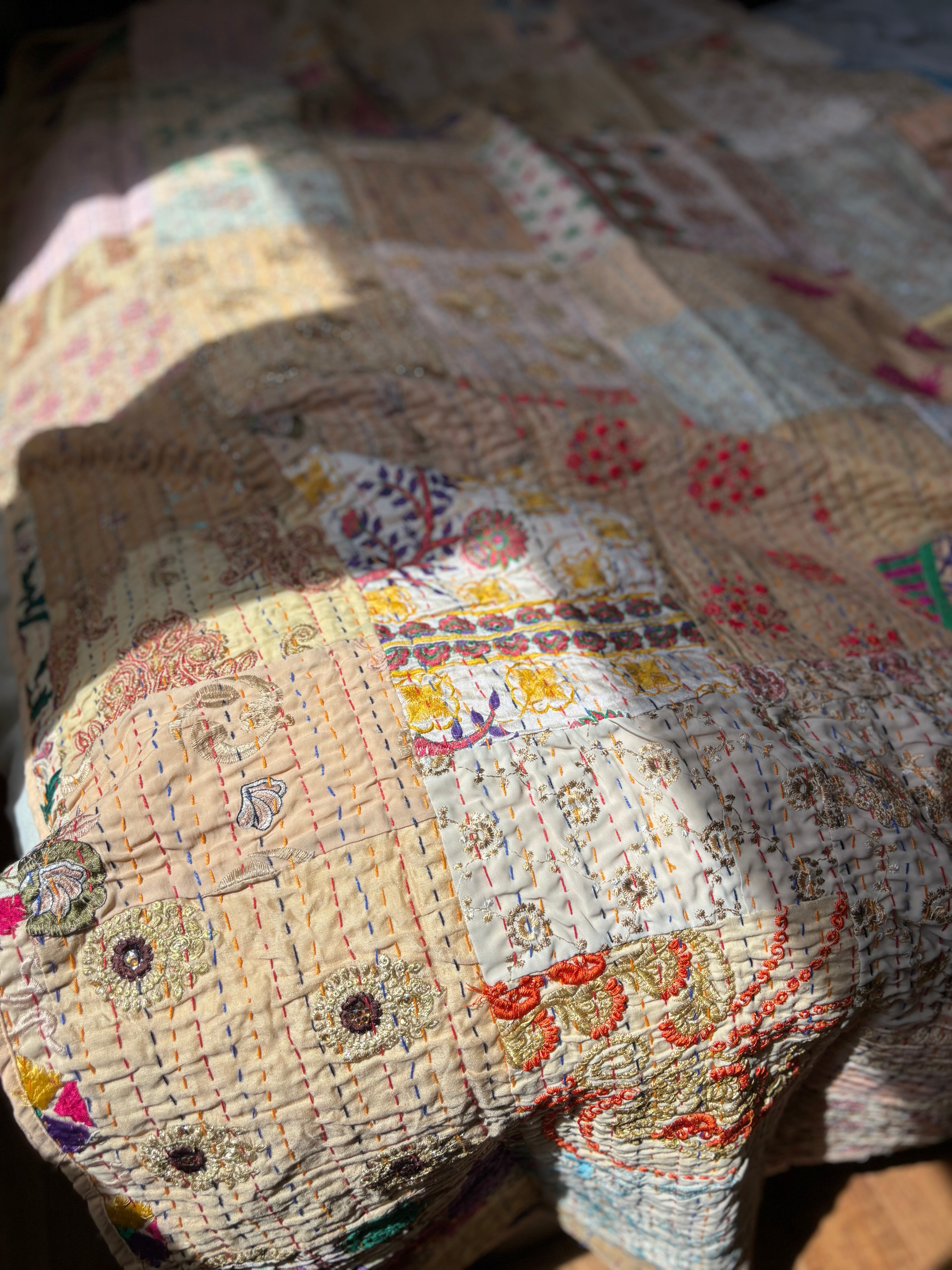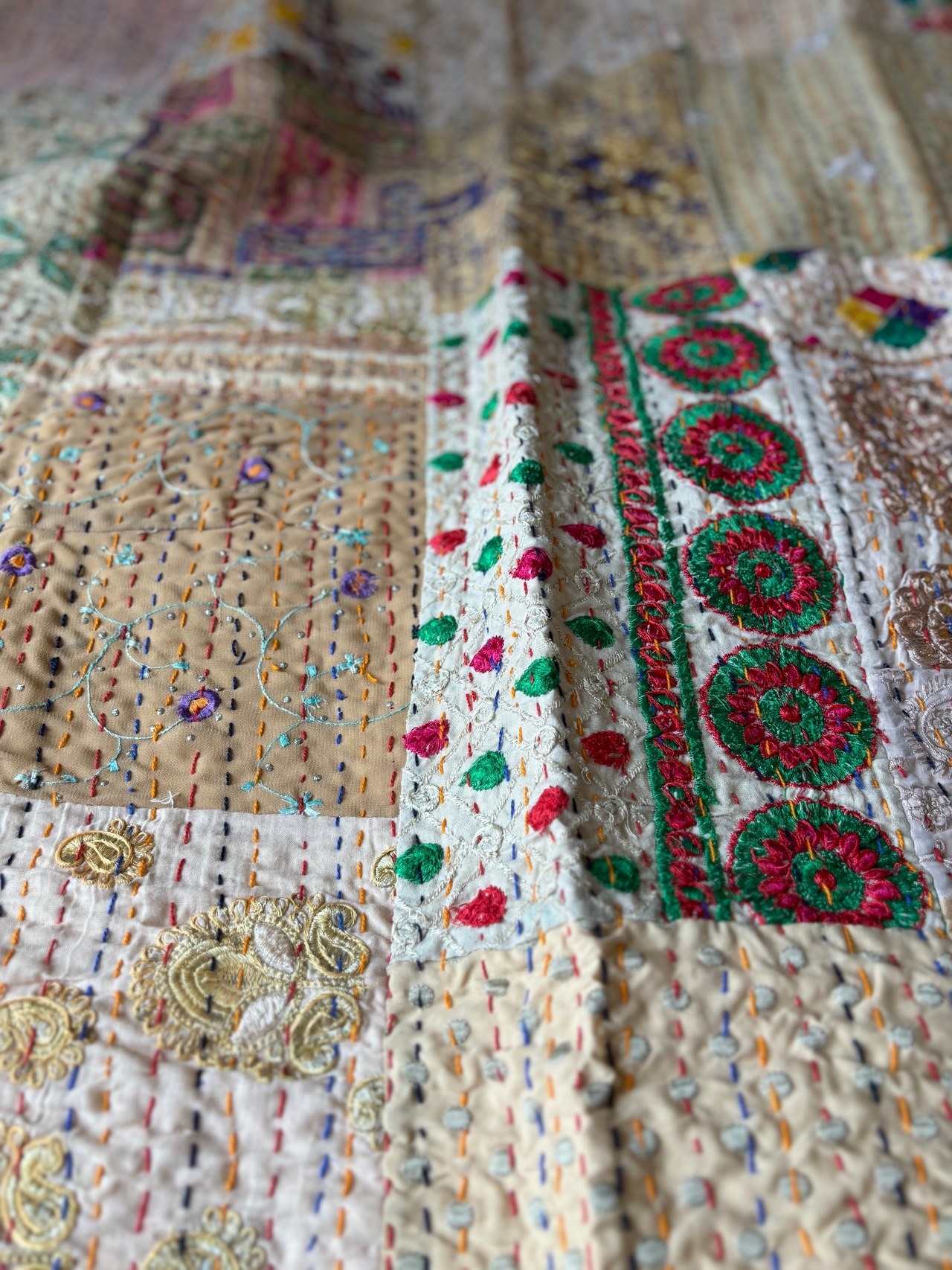 繋ぎ合わせたパッチワークキルトはとても華やか。