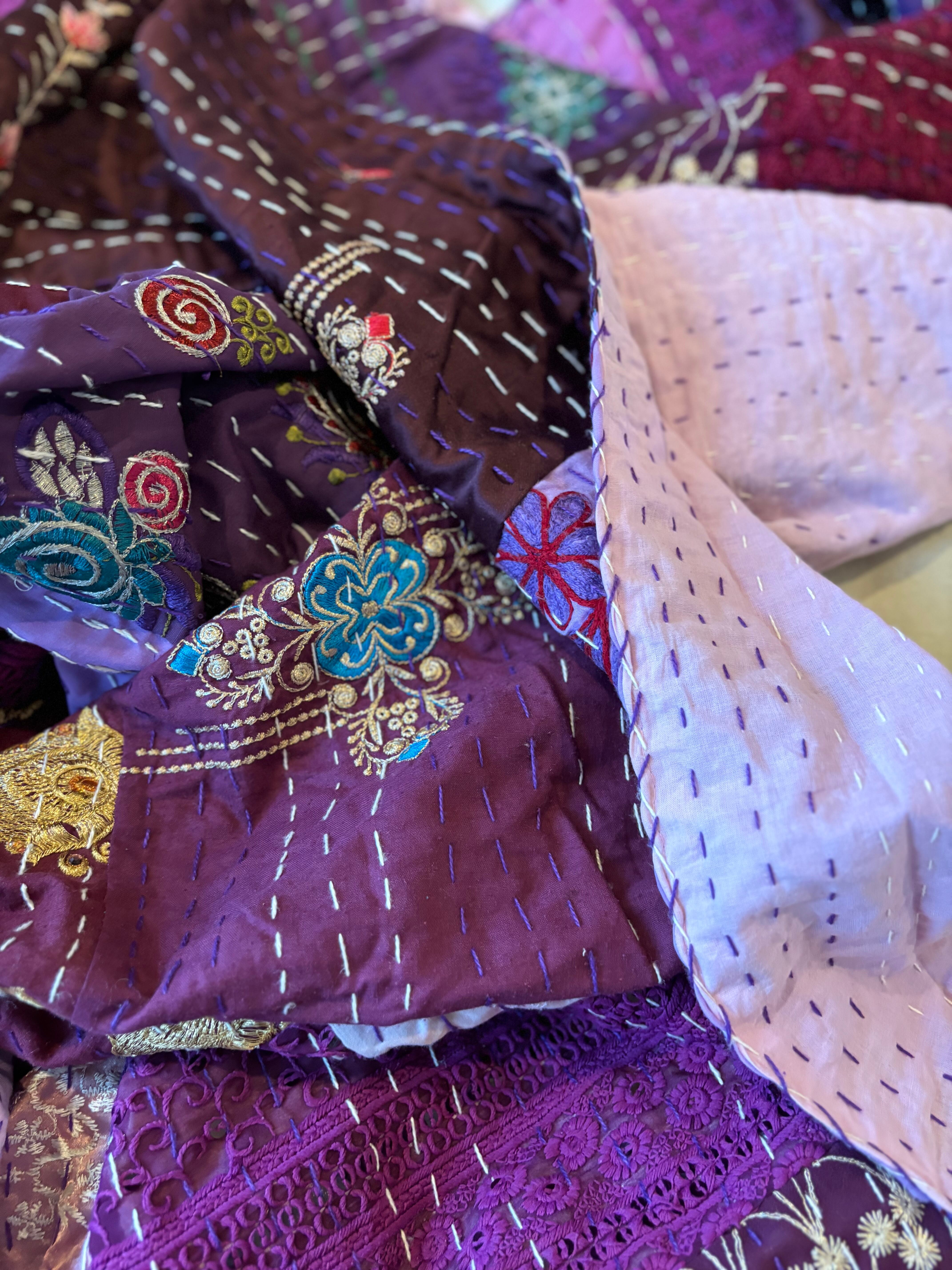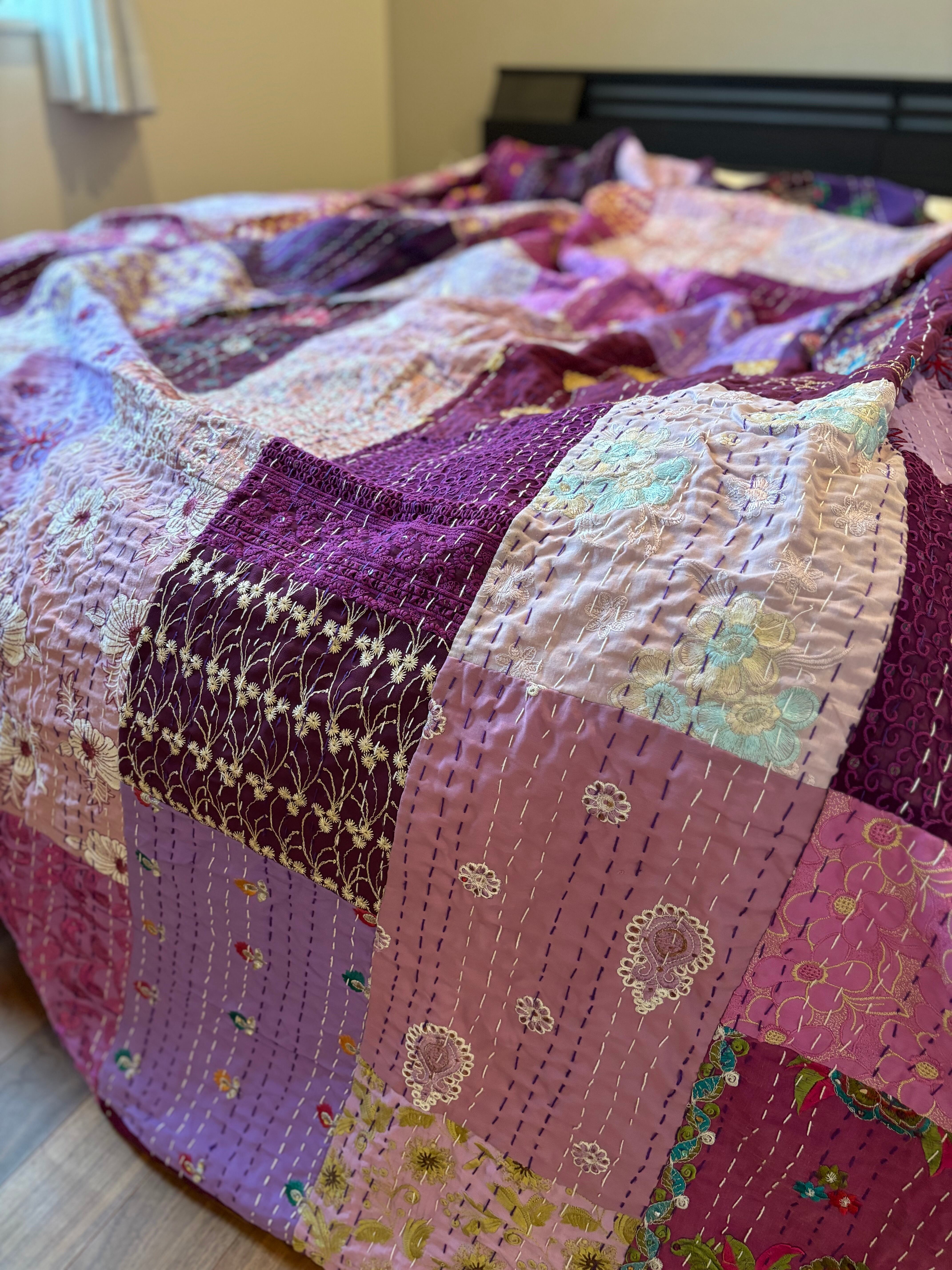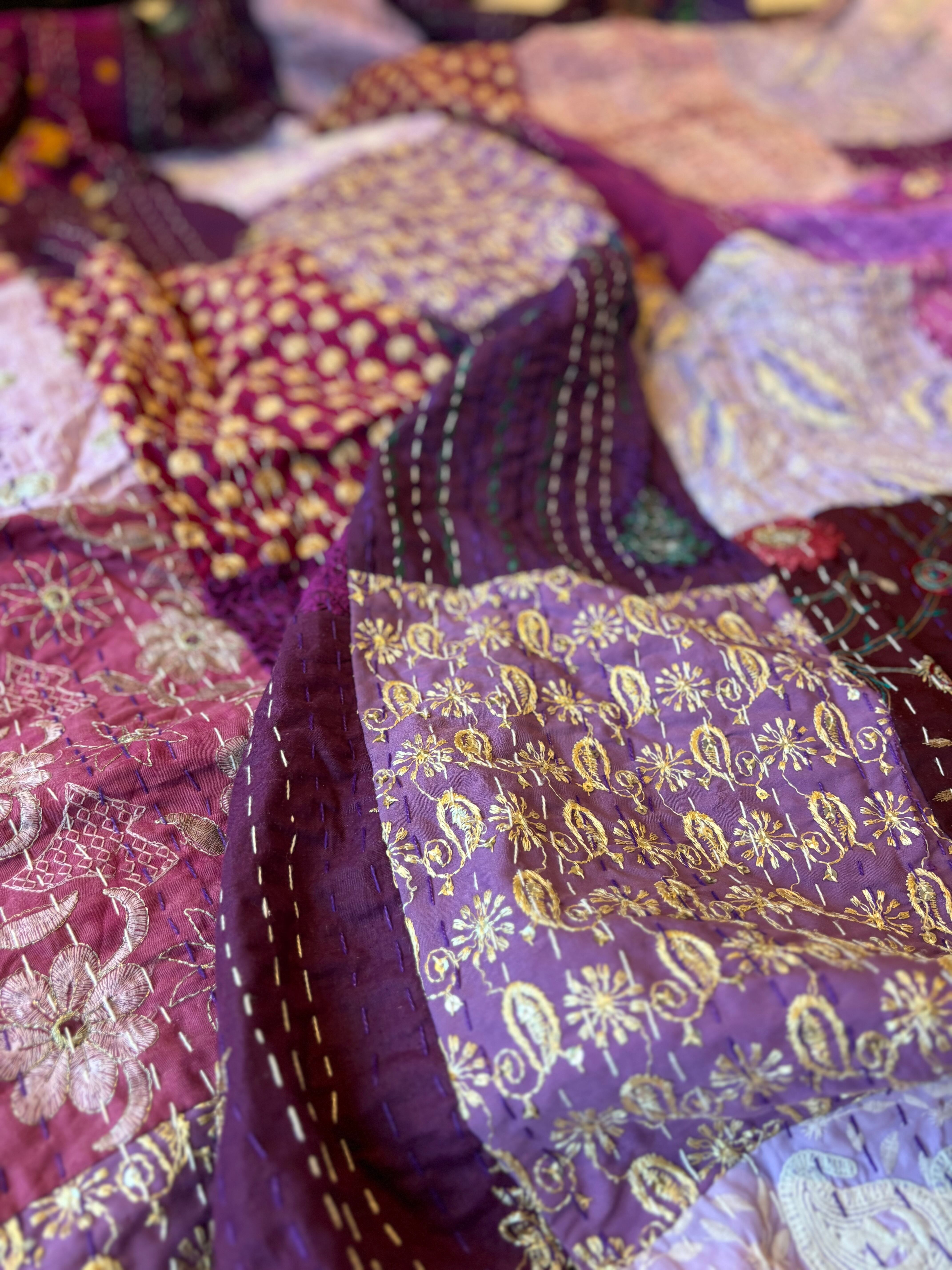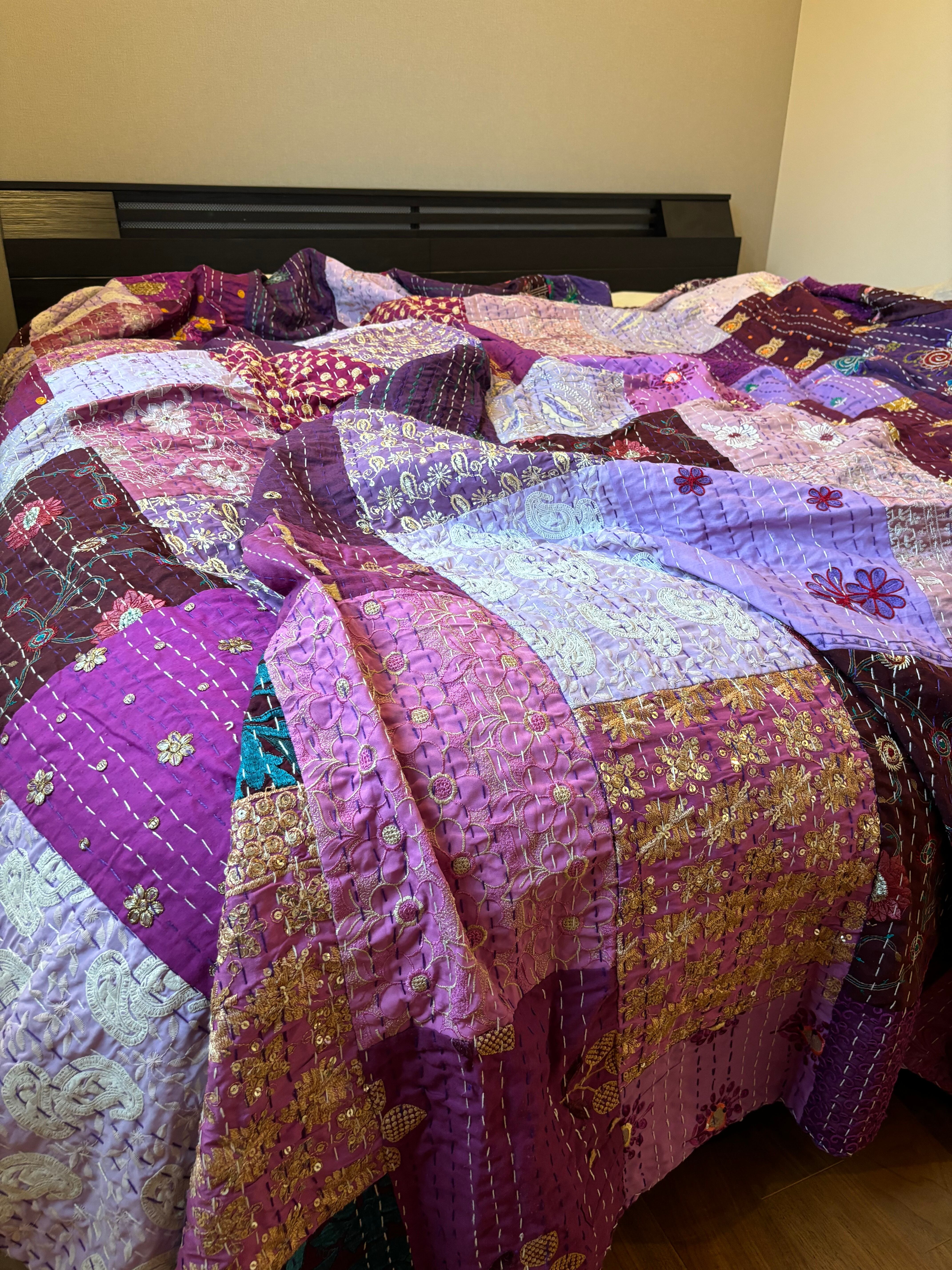 繋ぎ合わせたパッチワークキルトはとても華やか。