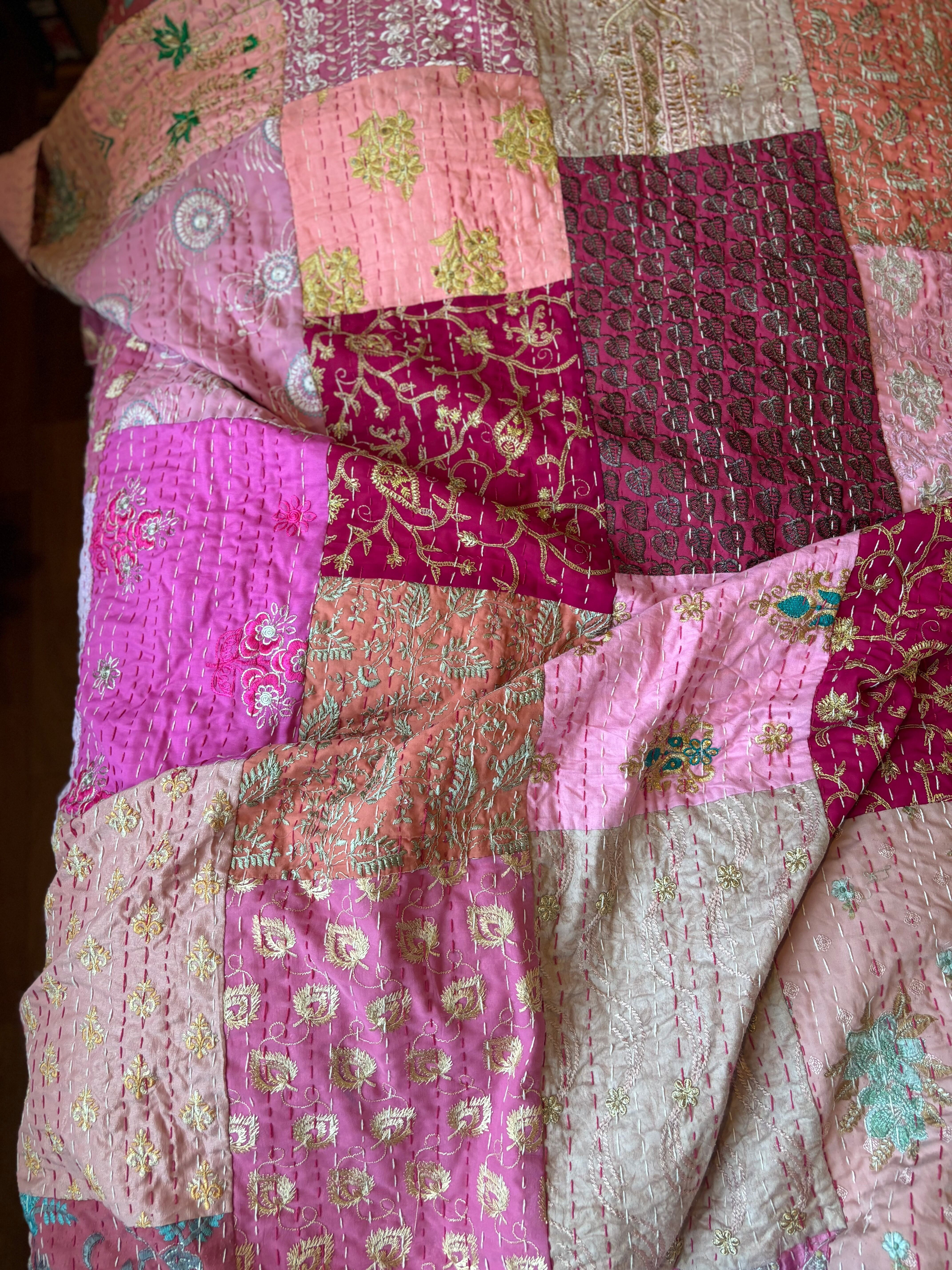 繋ぎ合わせたパッチワークキルトはとても華やか。