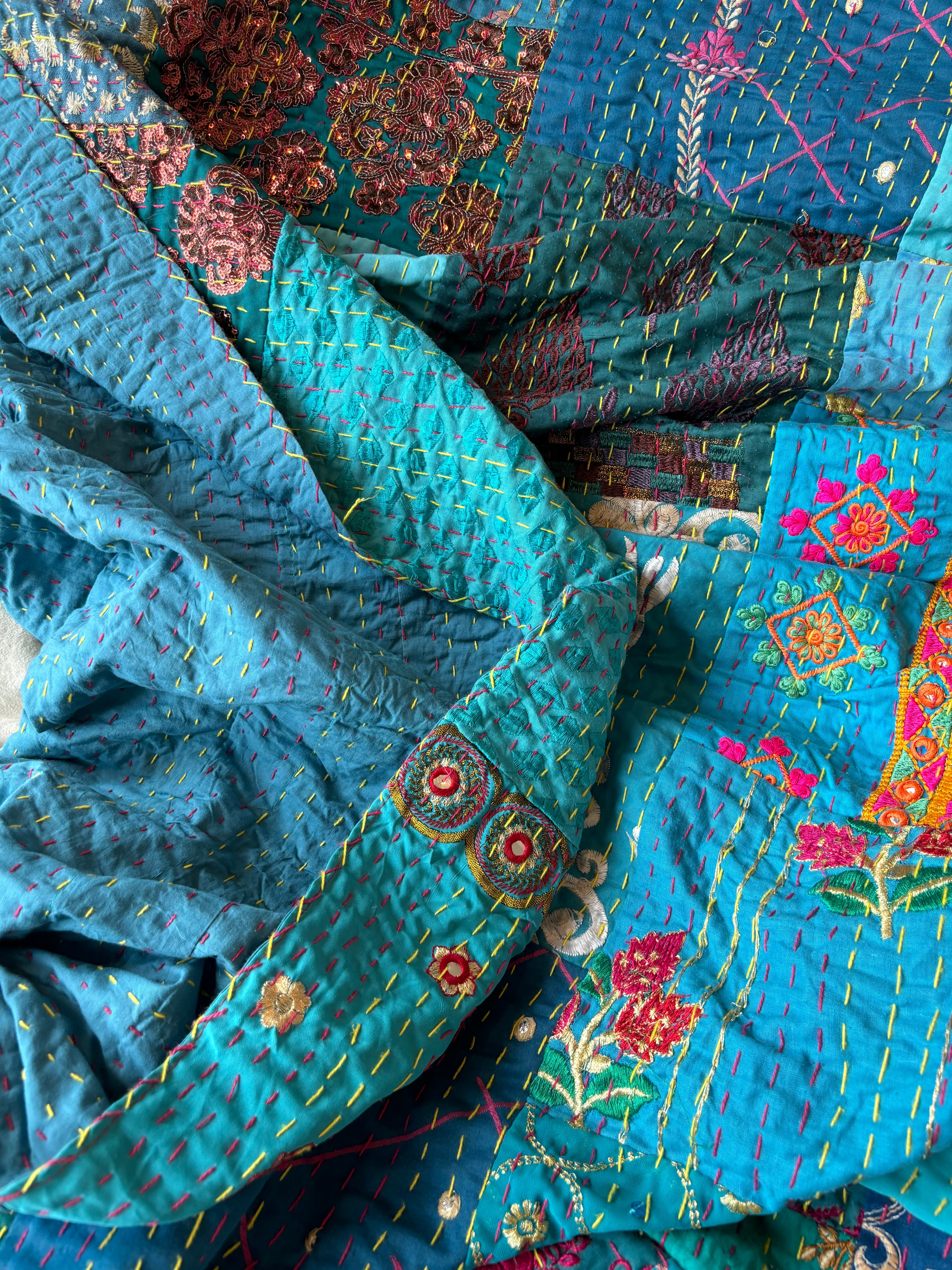 繋ぎ合わせたパッチワークキルトはとても華やか。