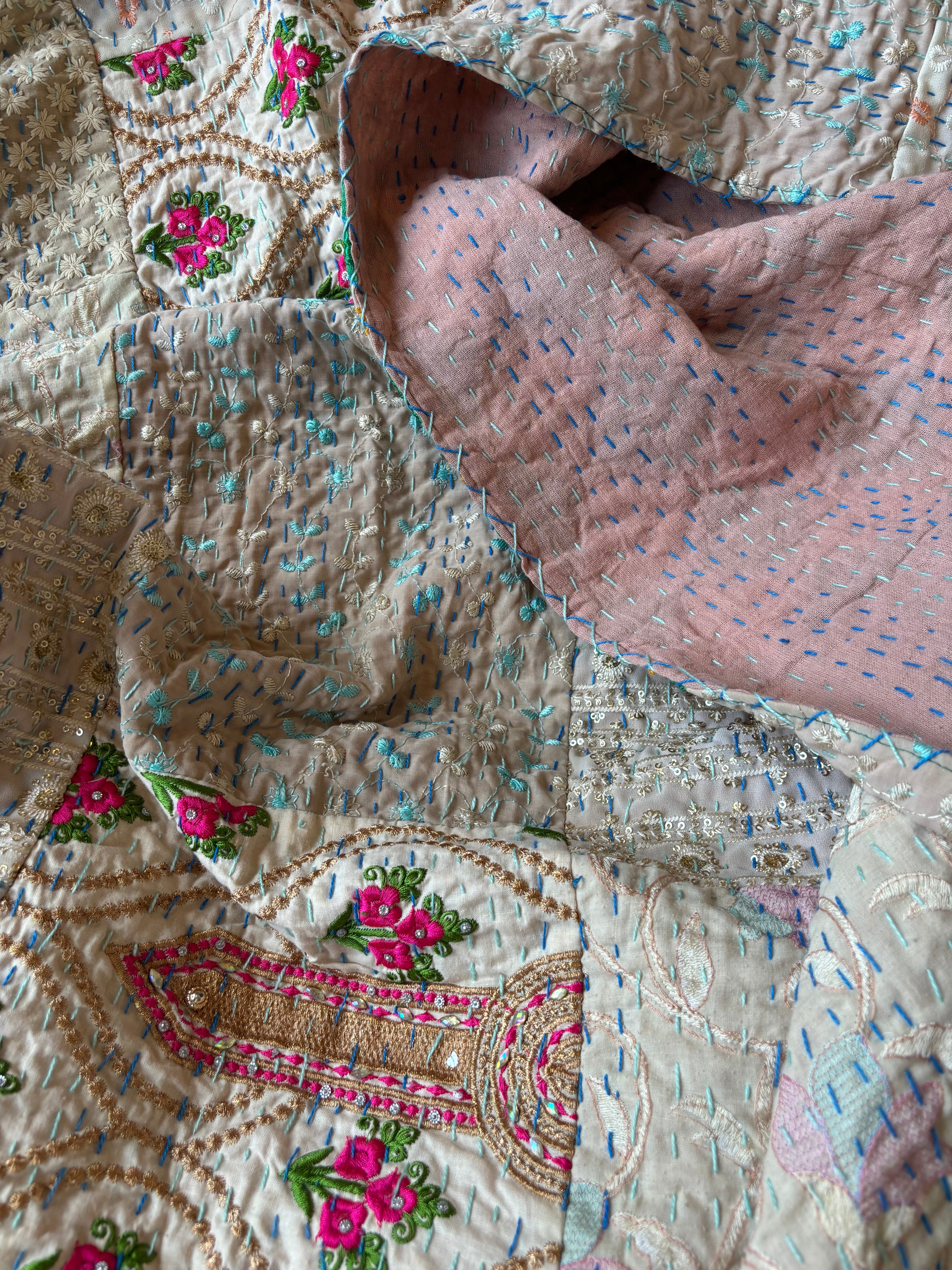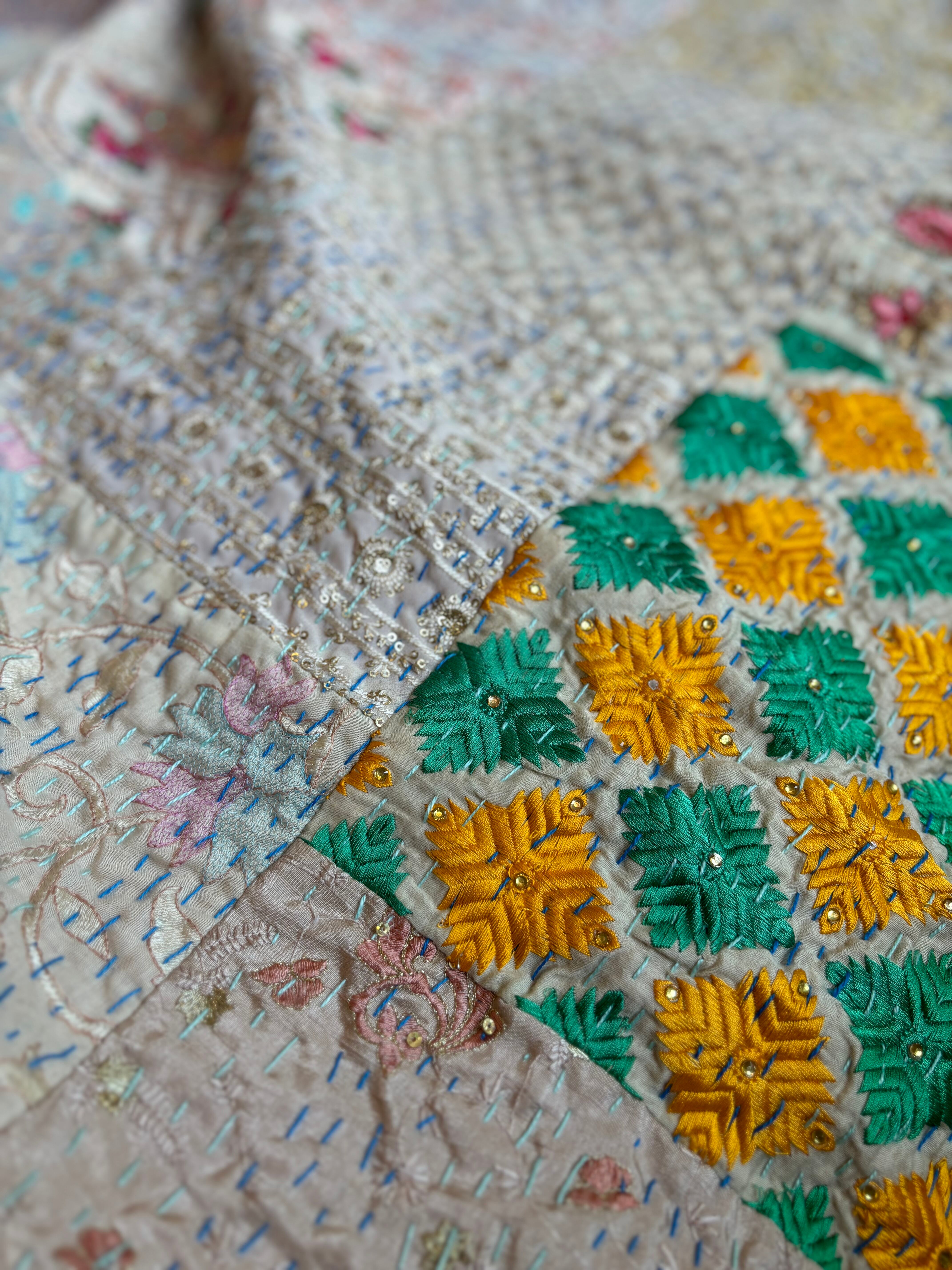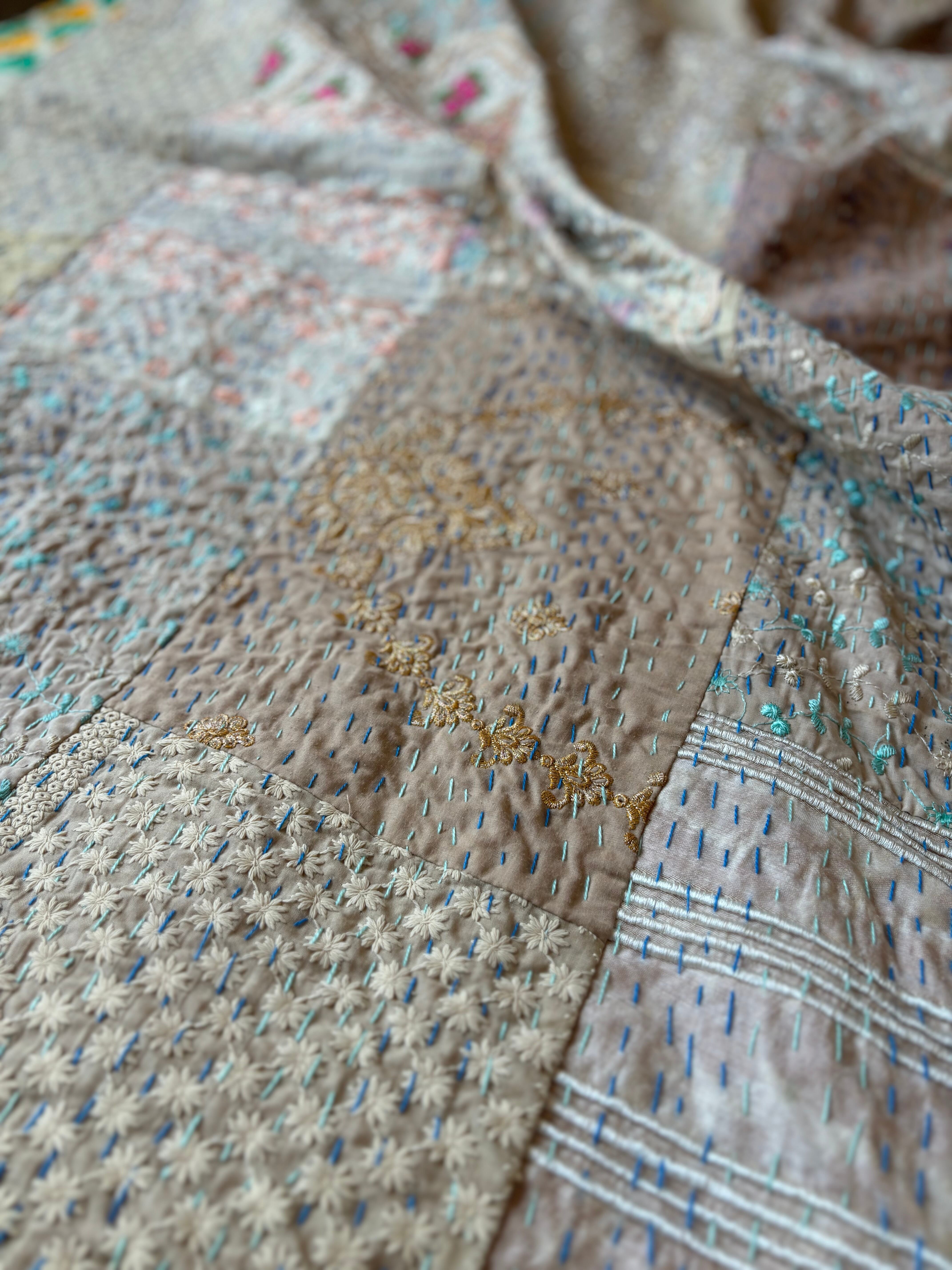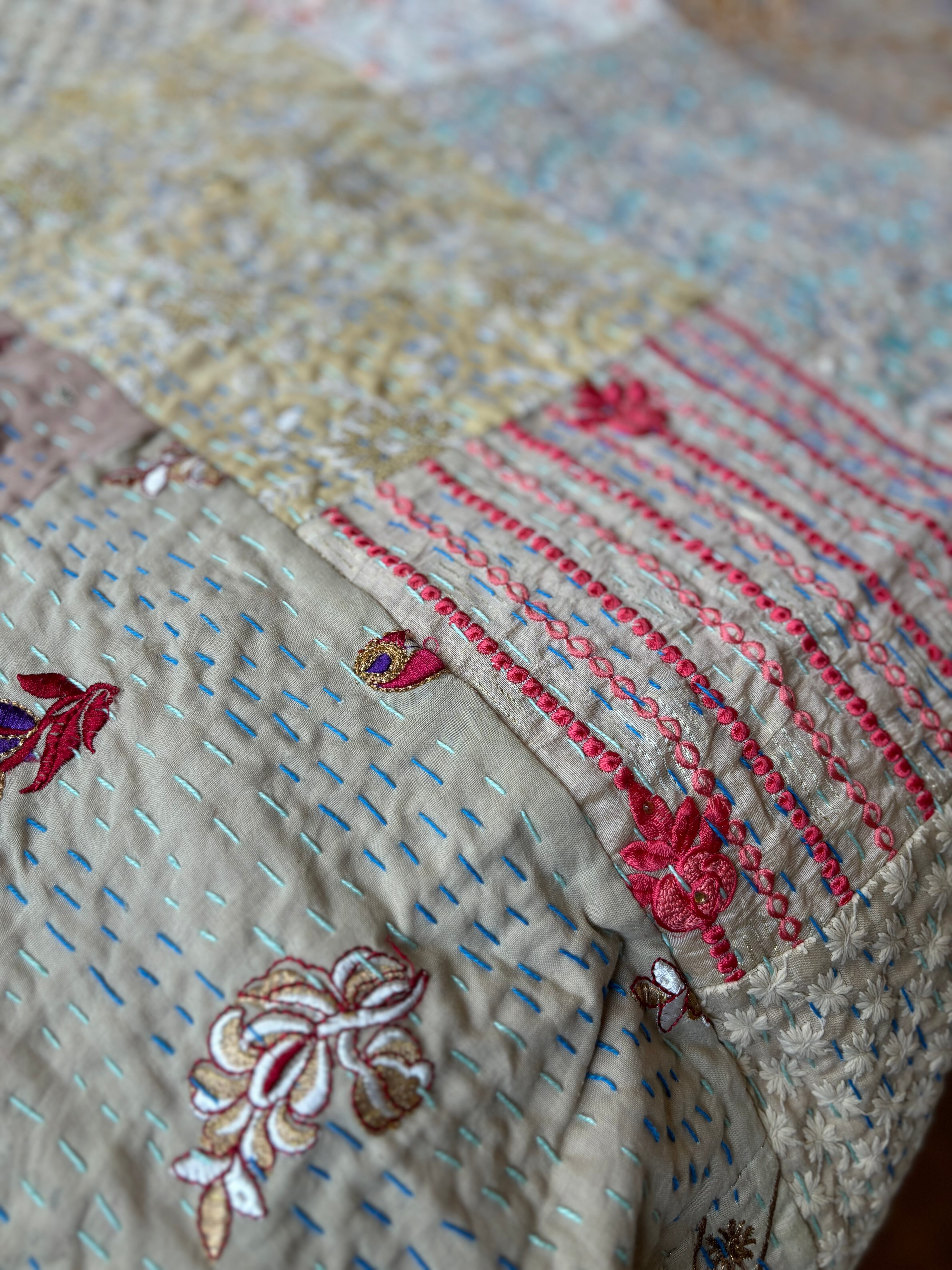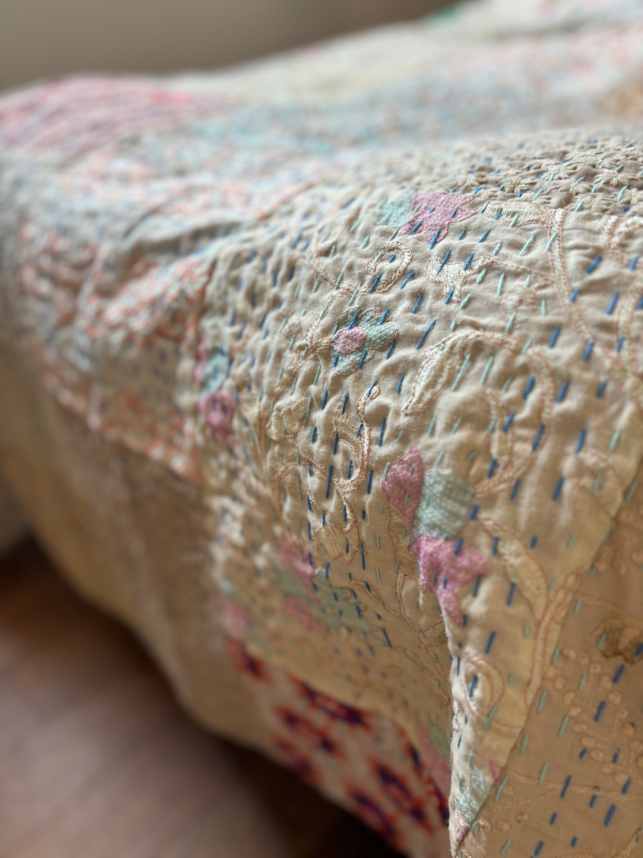 繋ぎ合わせたパッチワークキルトはとても華やか。