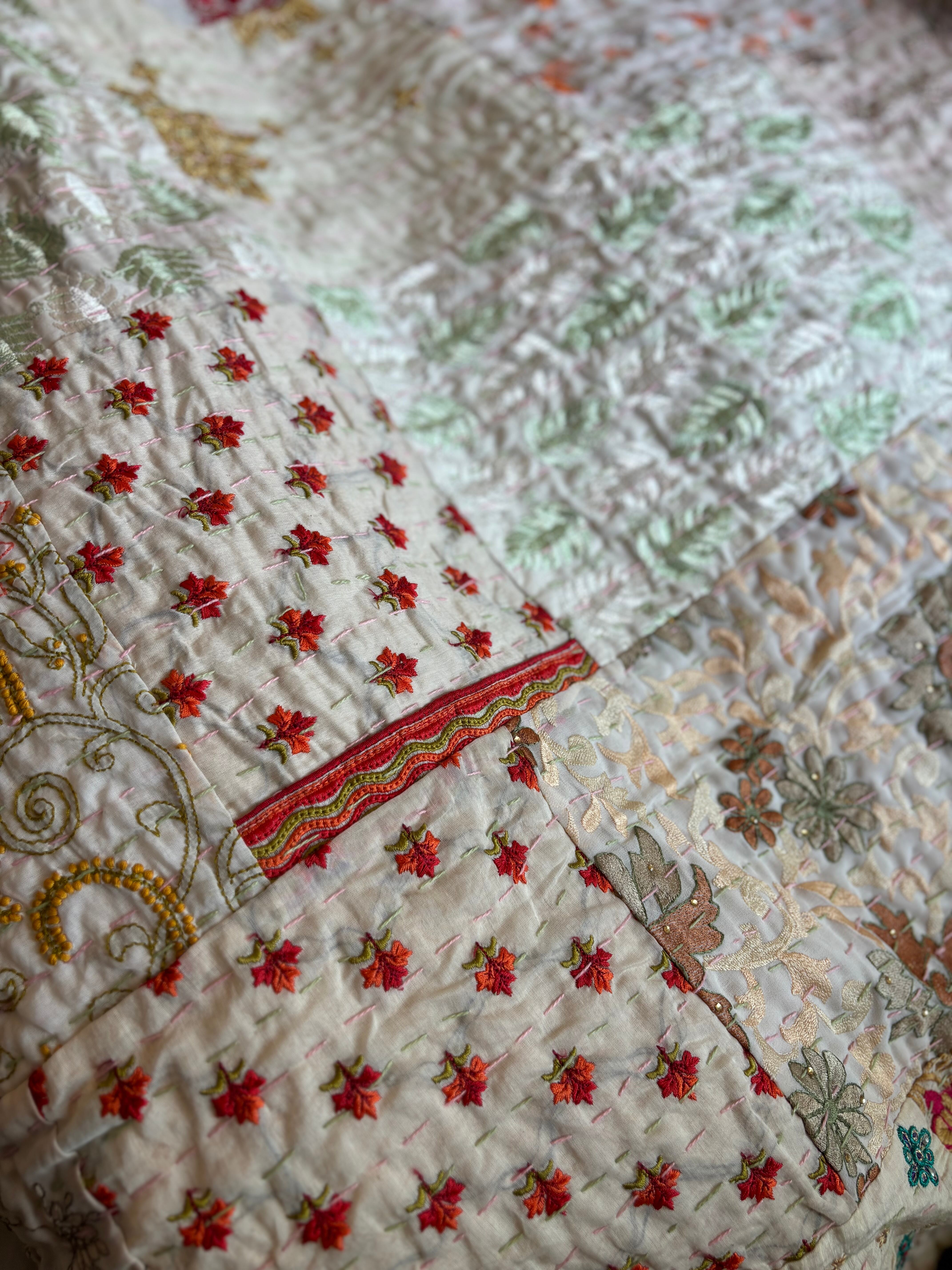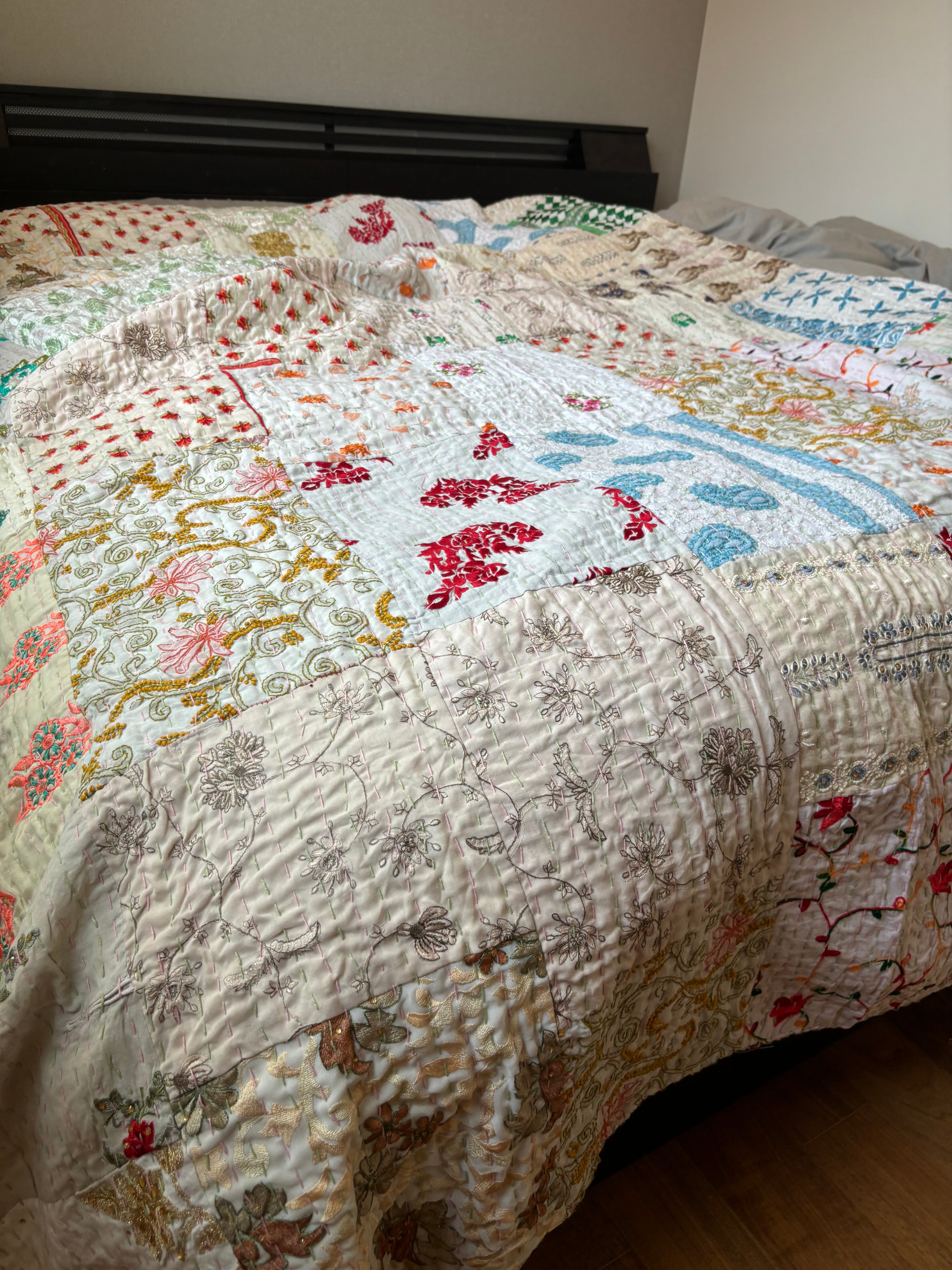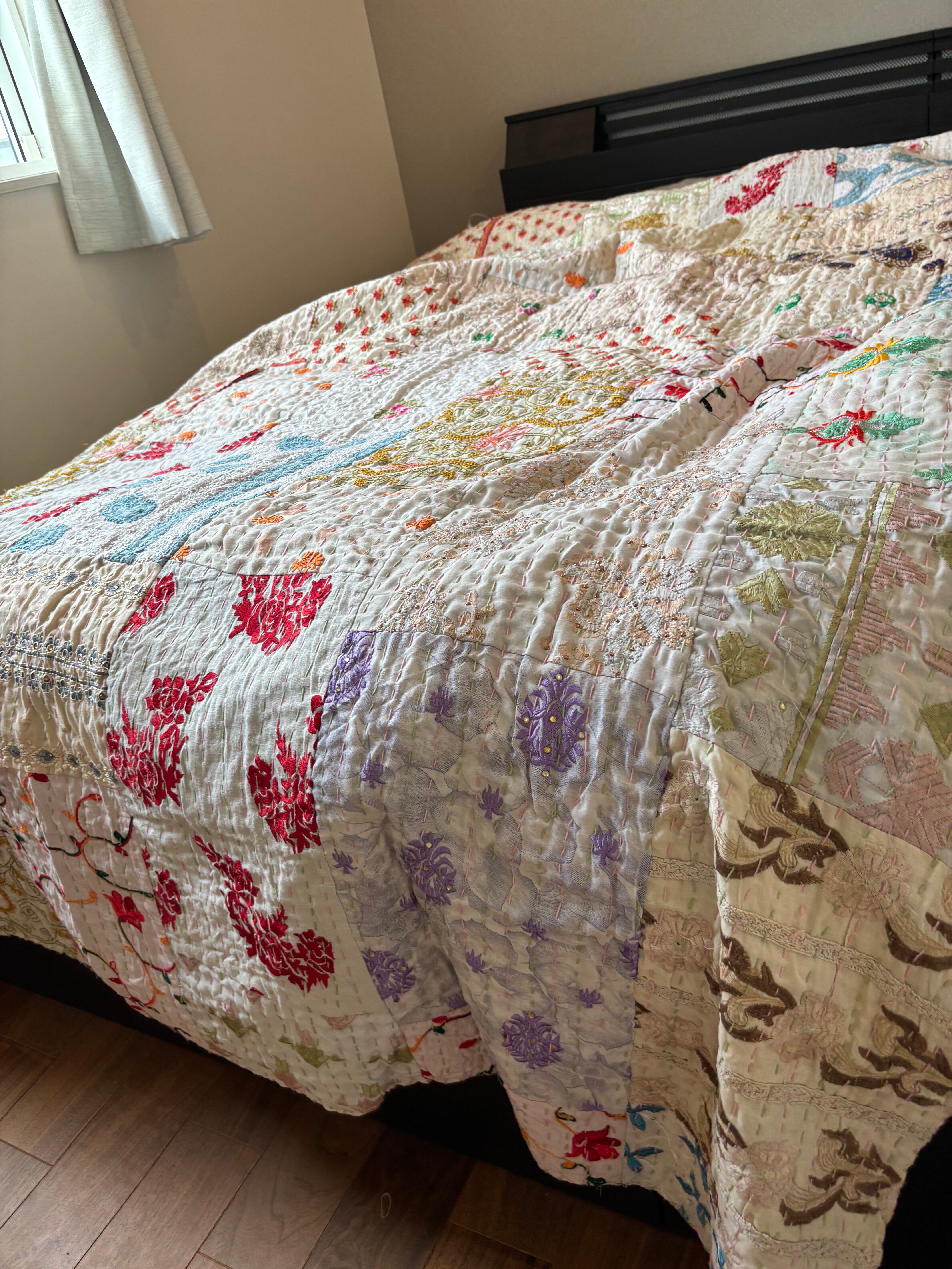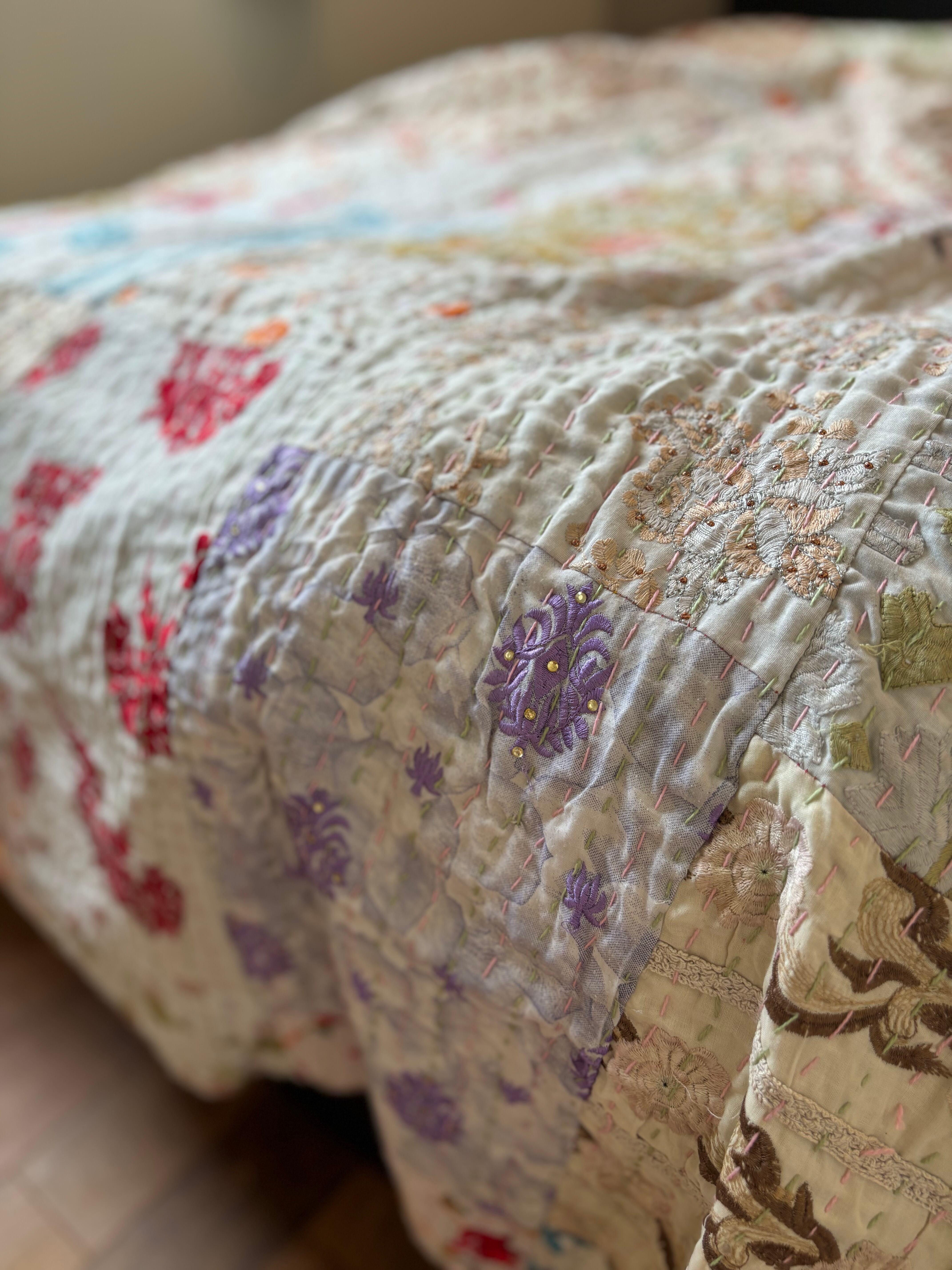 繋ぎ合わせたパッチワークキルトはとても華やか。