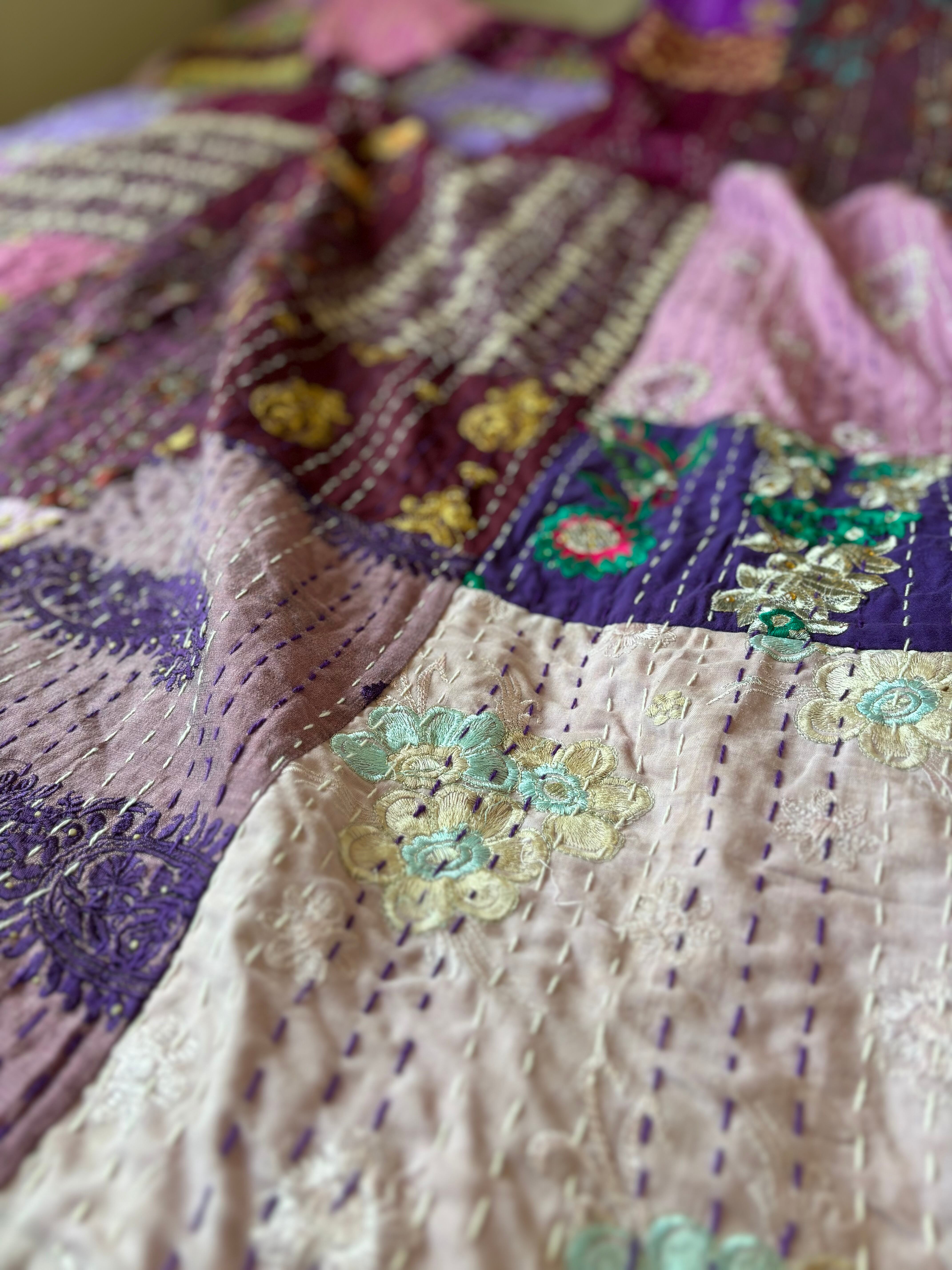 繋ぎ合わせたパッチワークキルトはとても華やか。