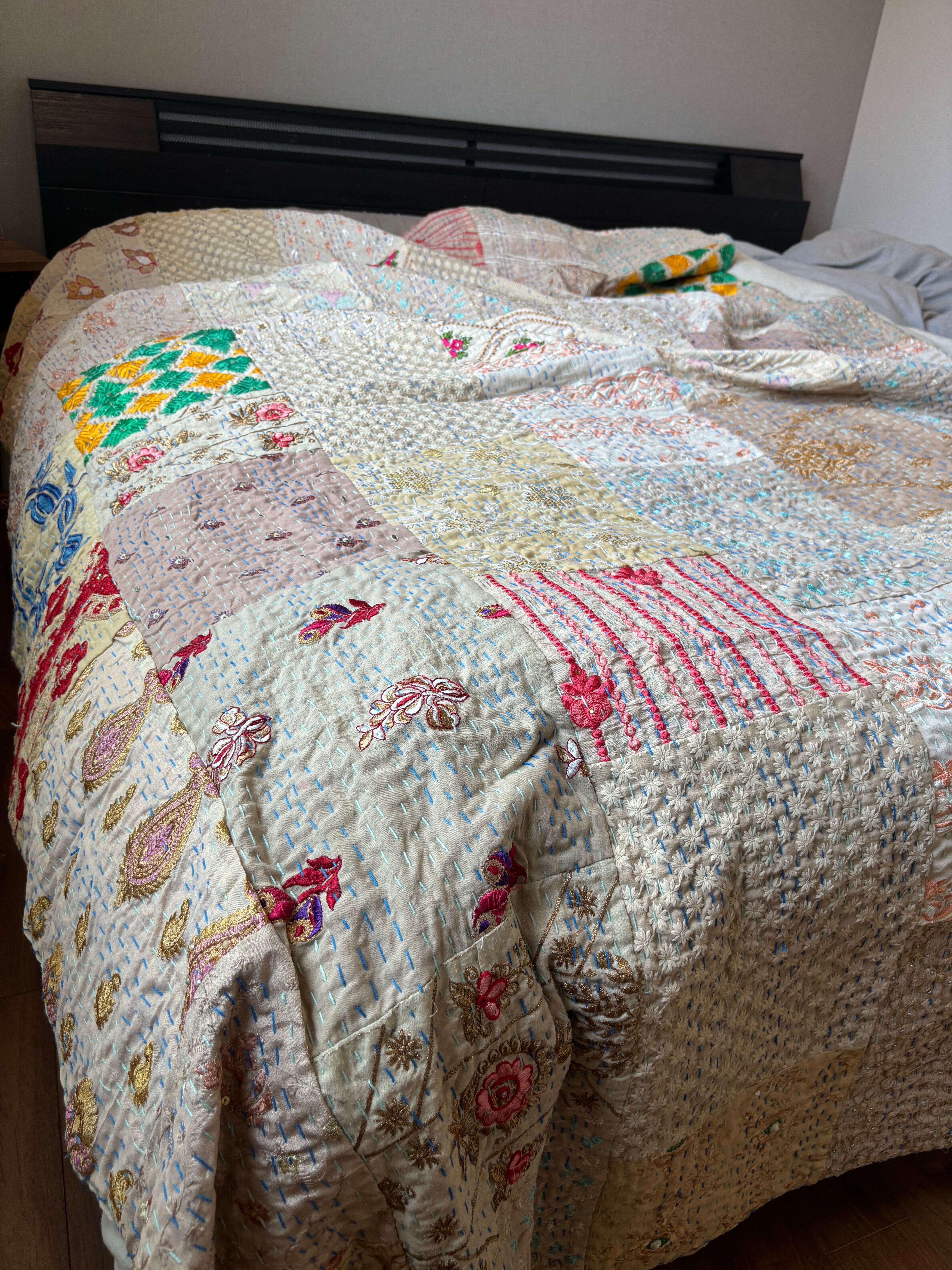 繋ぎ合わせたパッチワークキルトはとても華やか。