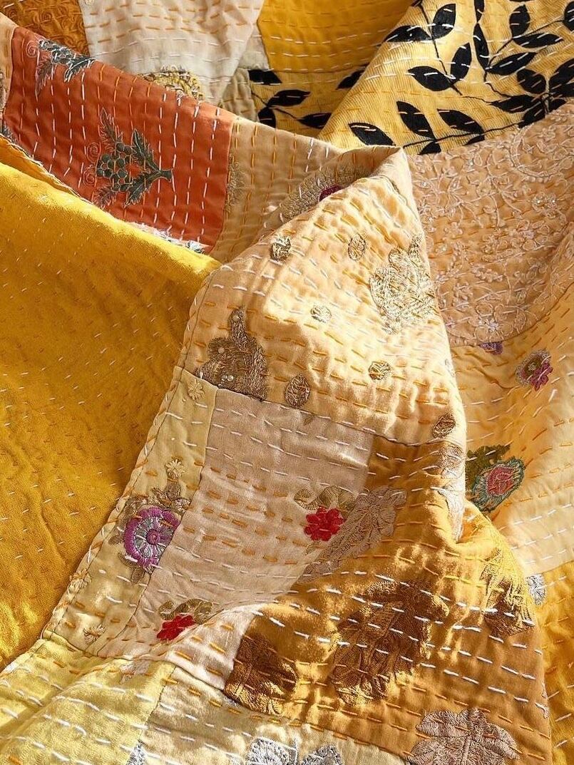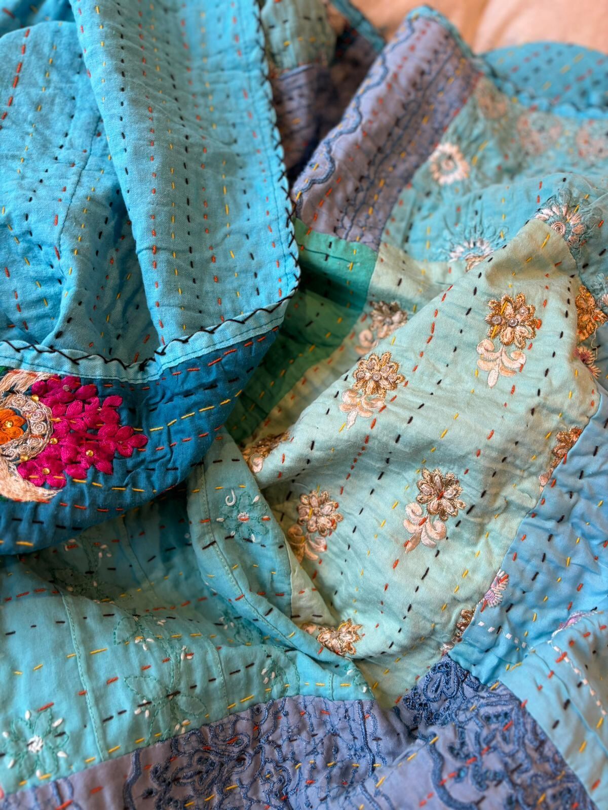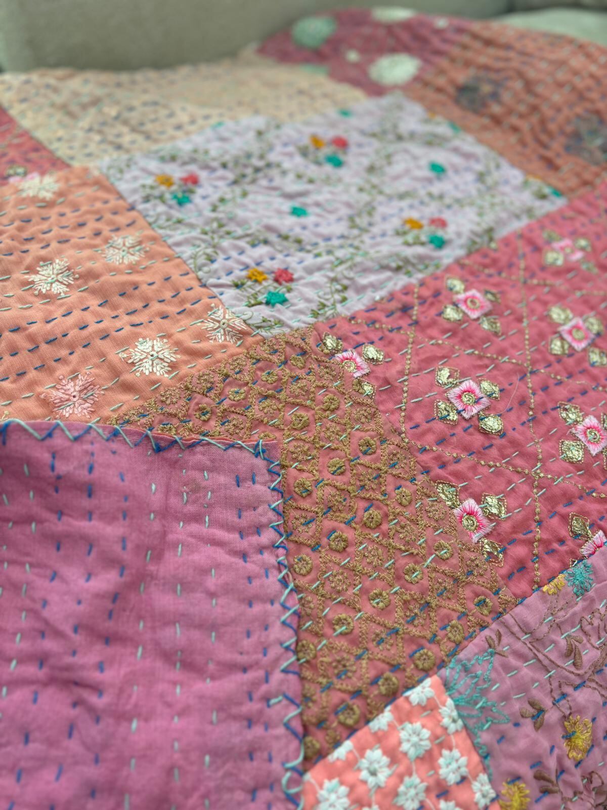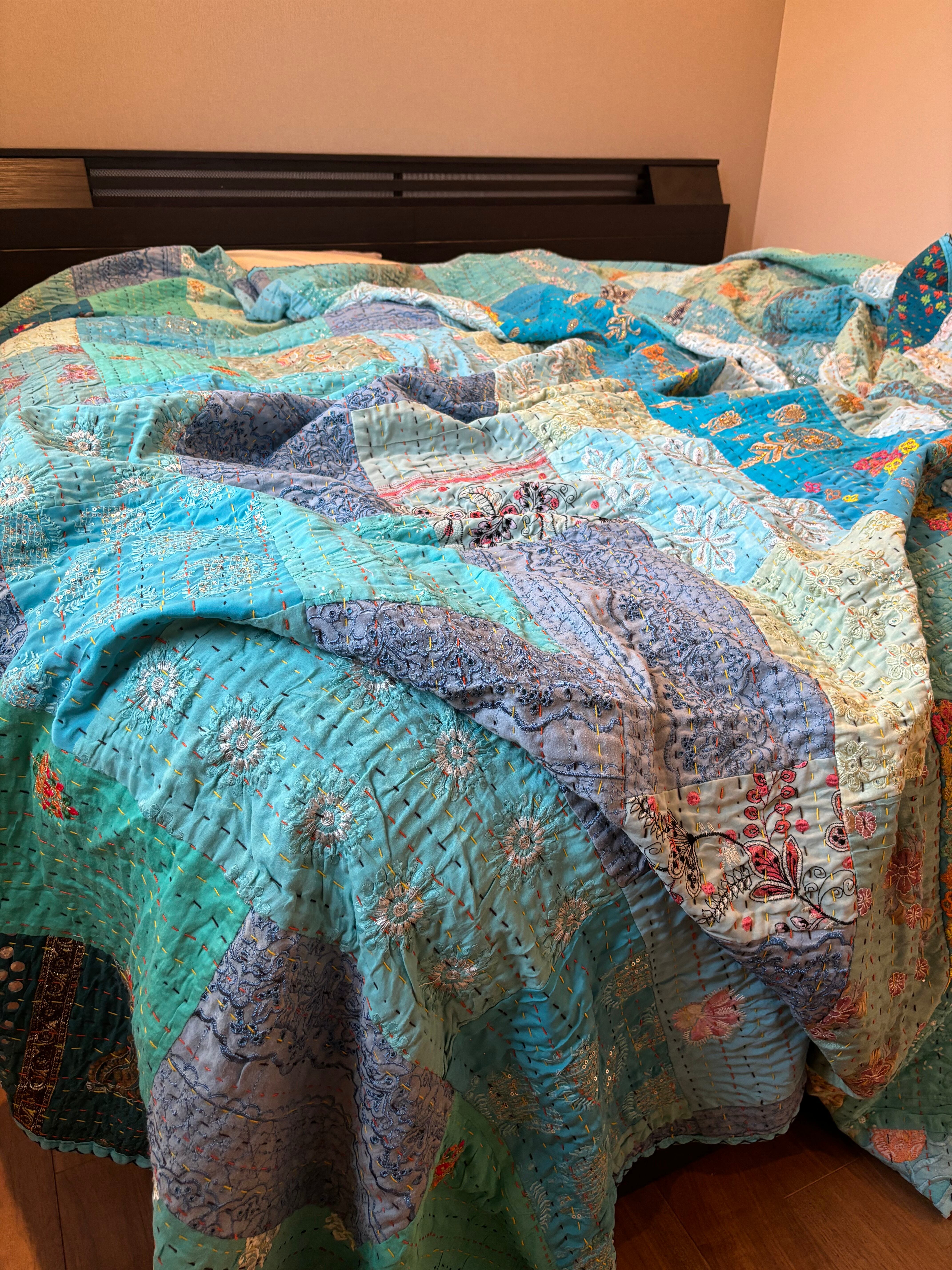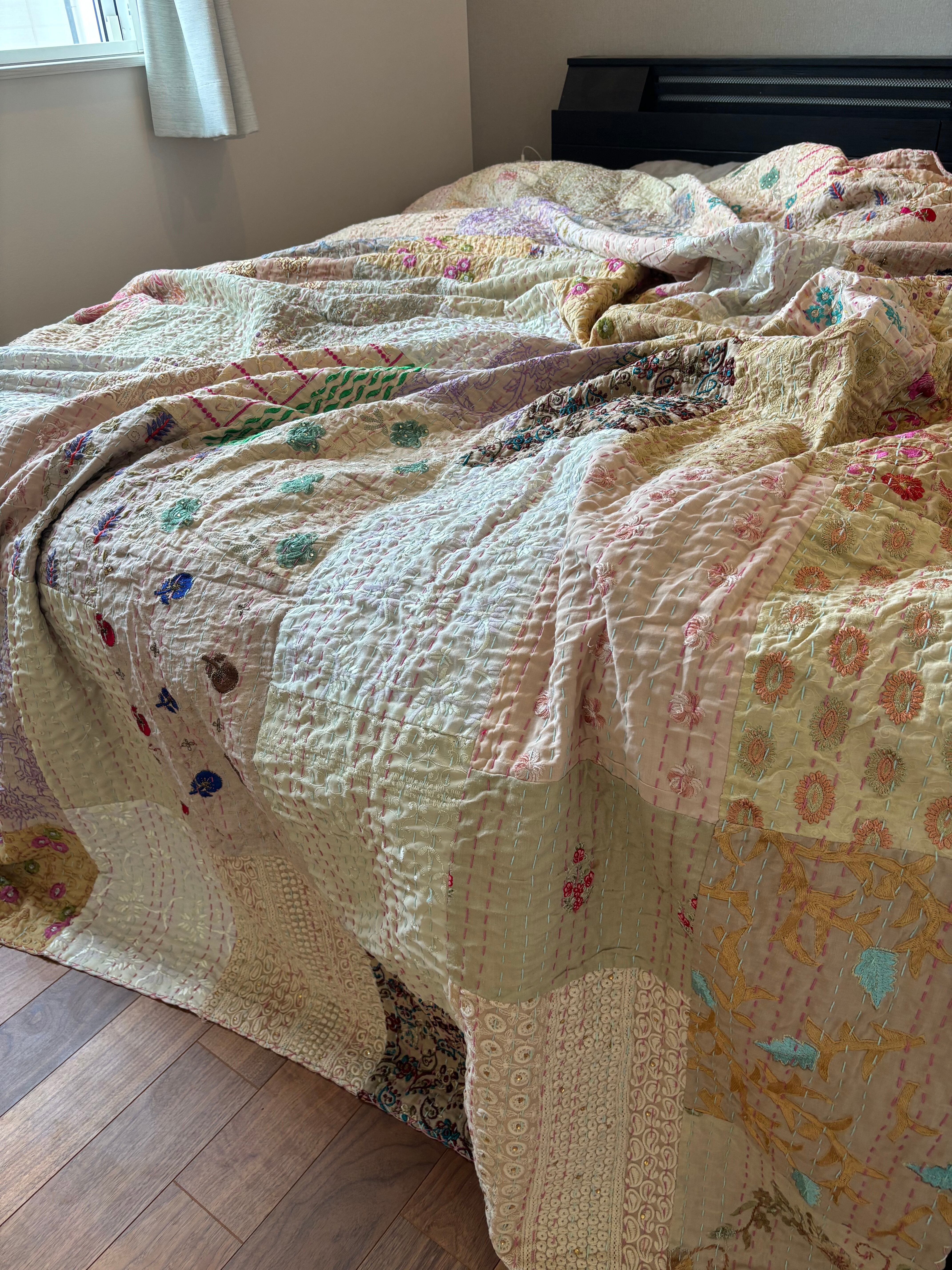 繋ぎ合わせたパッチワークキルトはとても華やか。