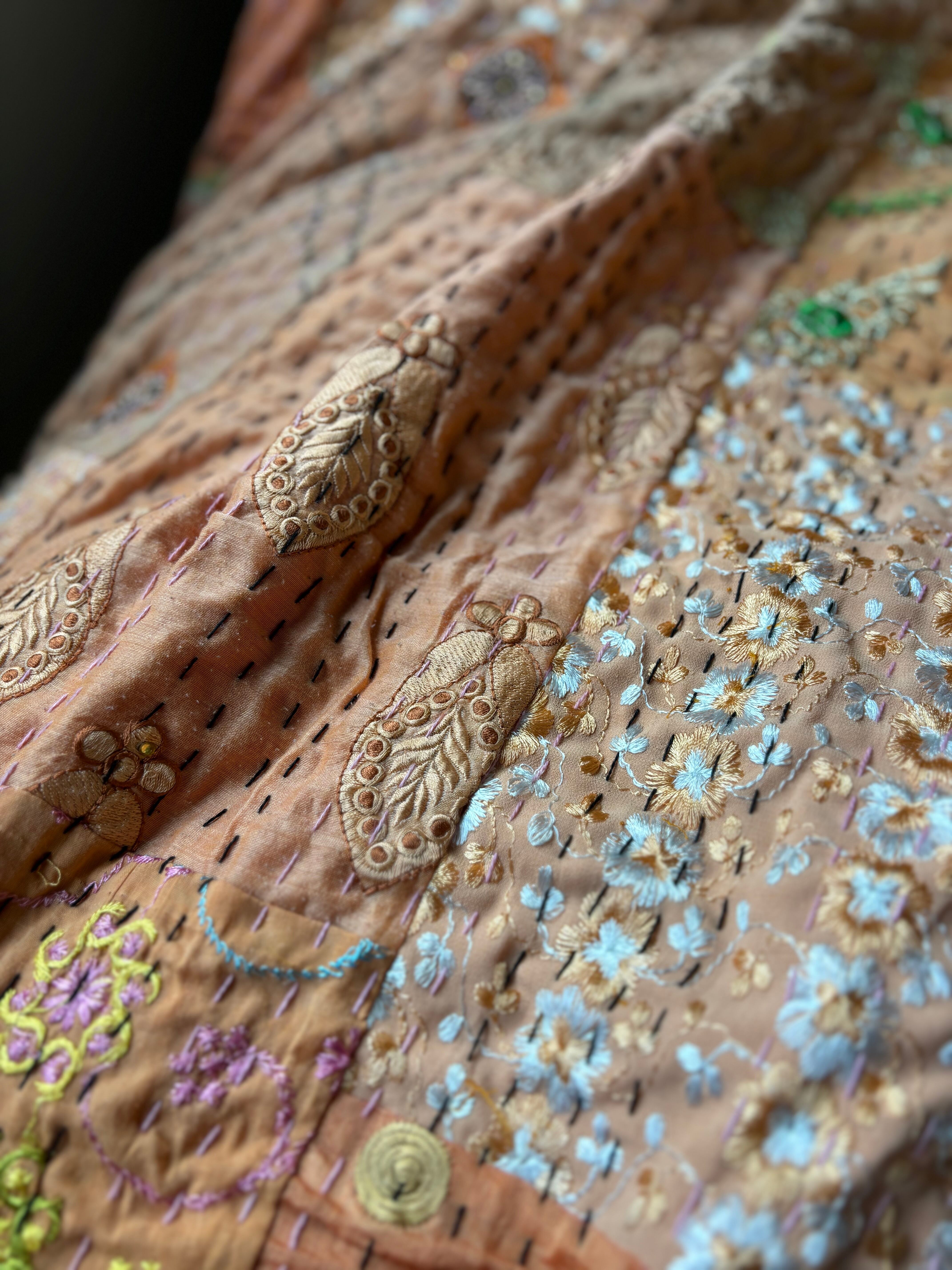 繋ぎ合わせたパッチワークキルトはとても華やか。