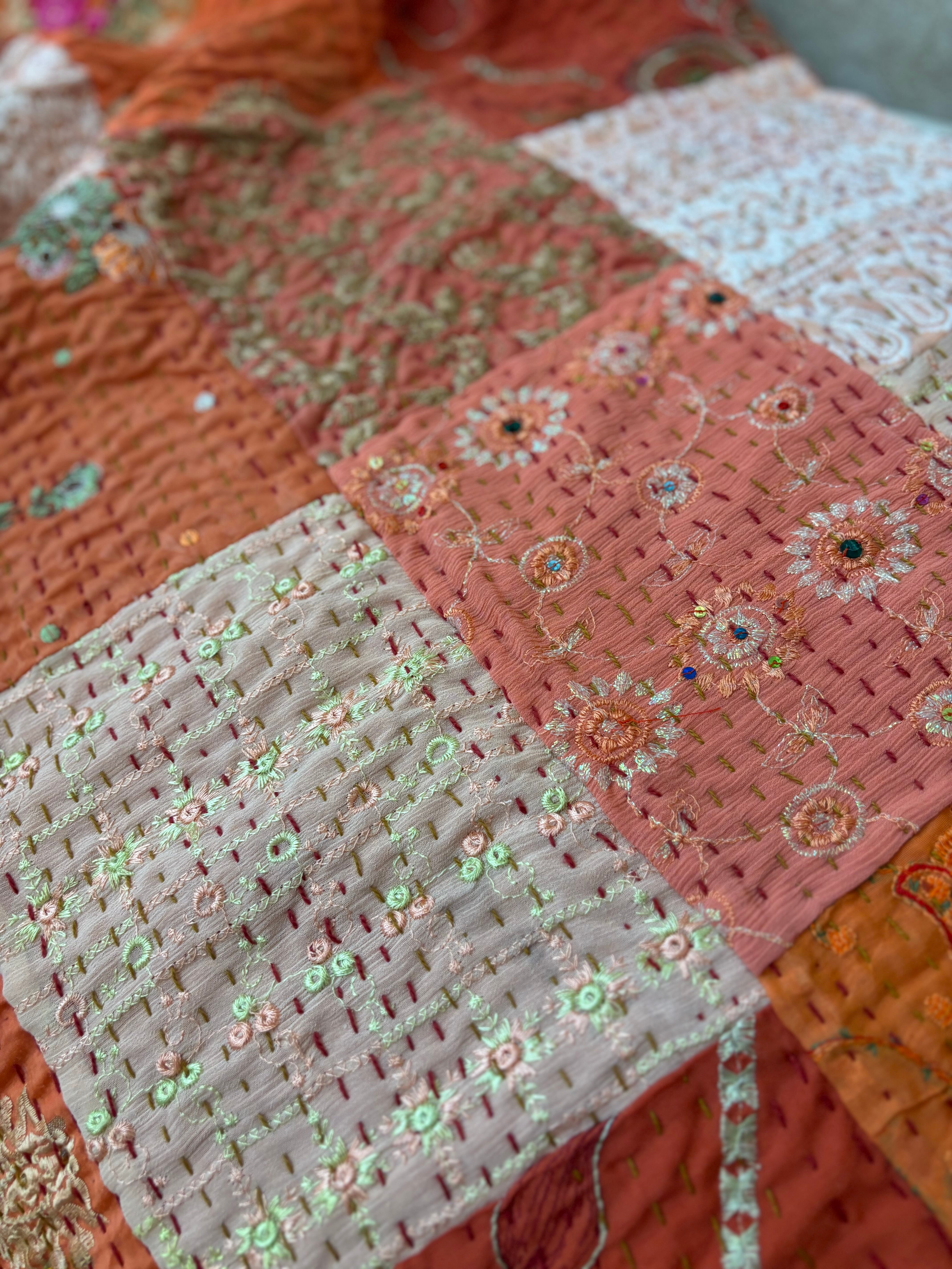 繋ぎ合わせたパッチワークキルトはとても華やか。