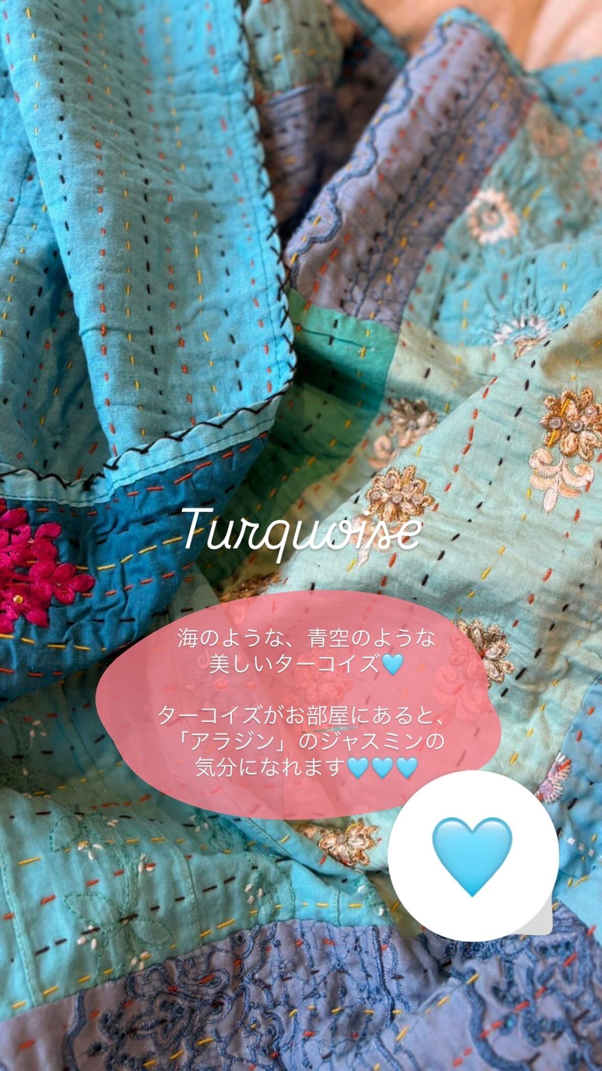 繋ぎ合わせたパッチワークキルトはとても華やか。