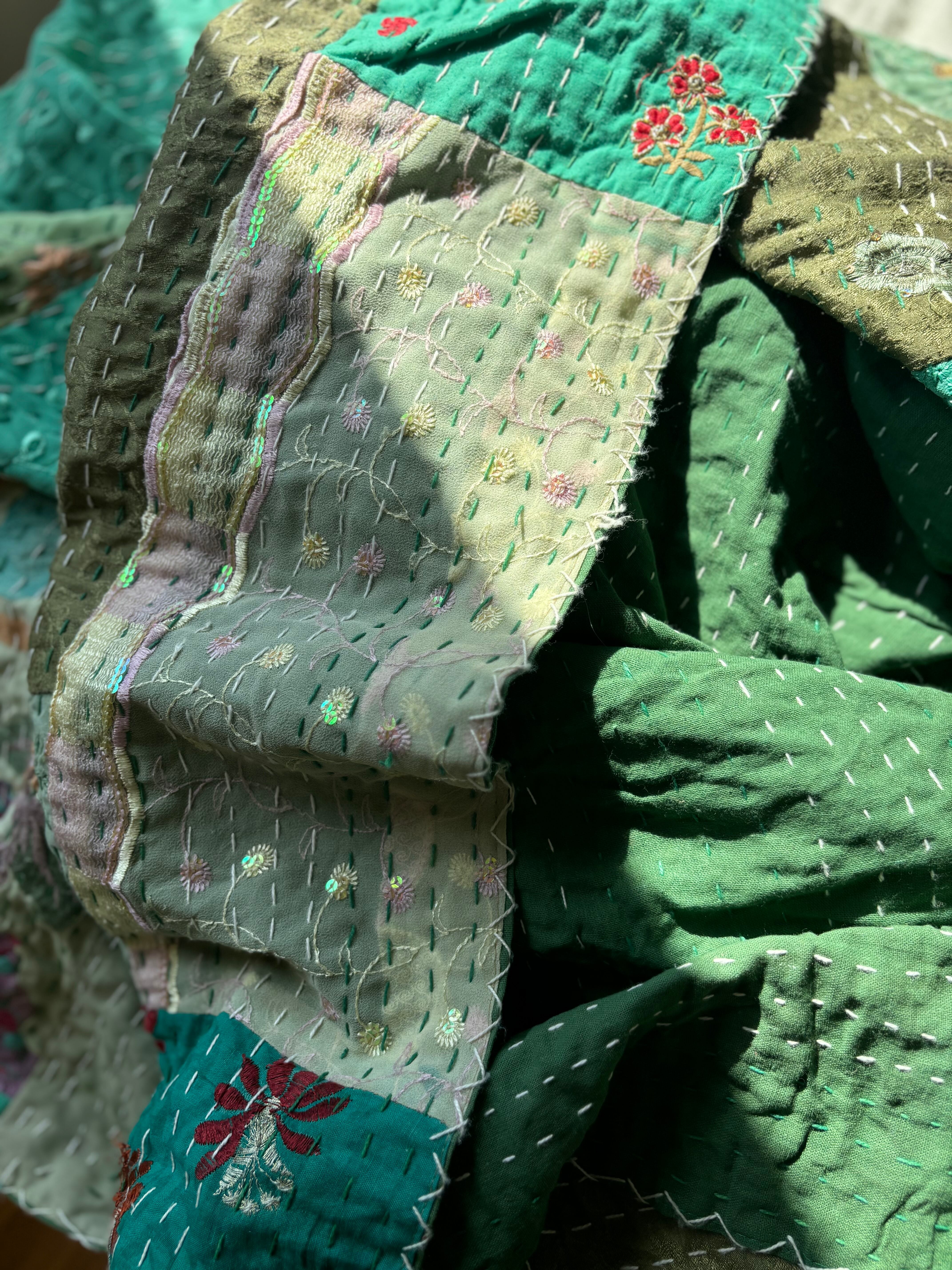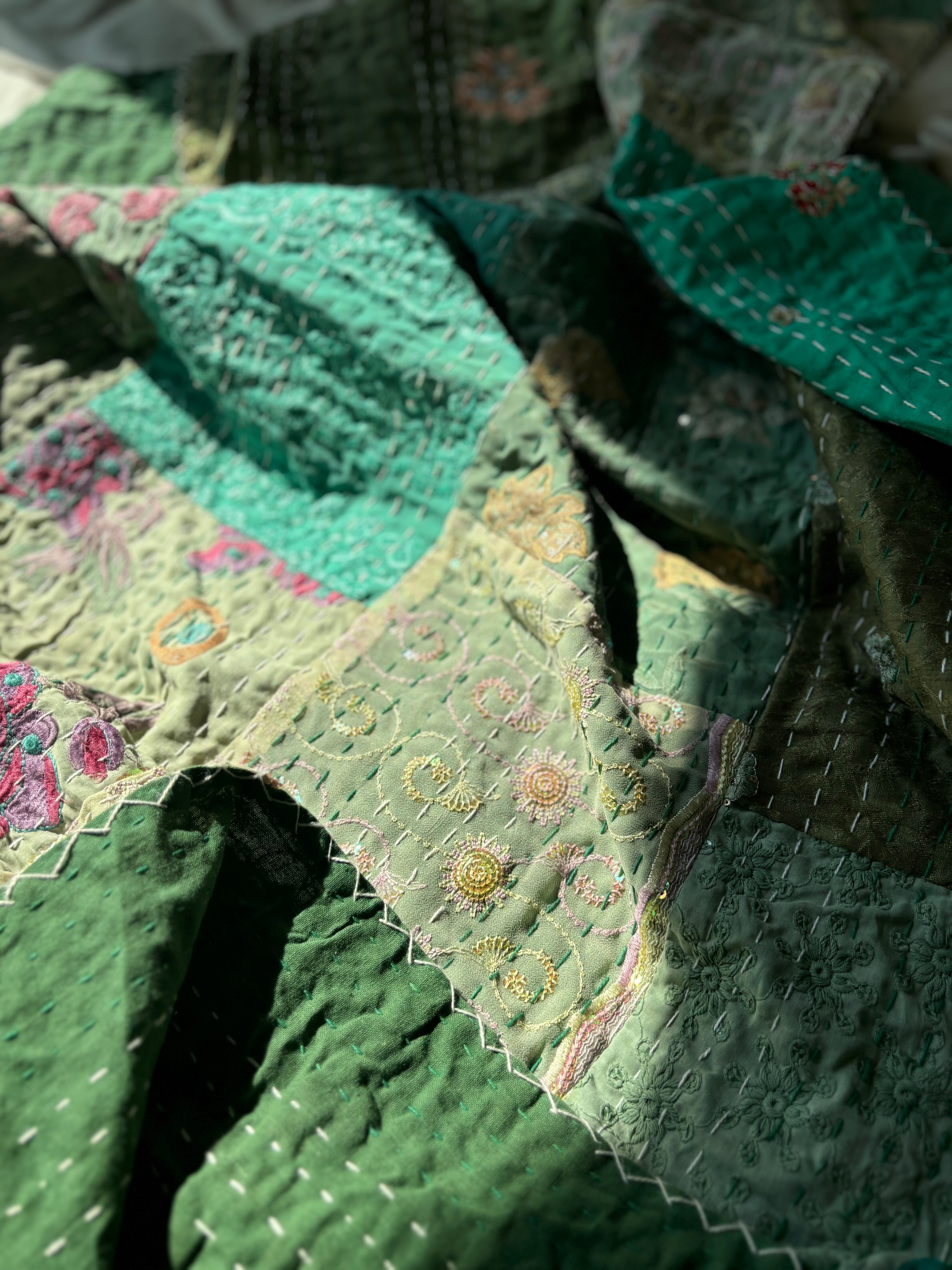 繋ぎ合わせたパッチワークキルトはとても華やか。