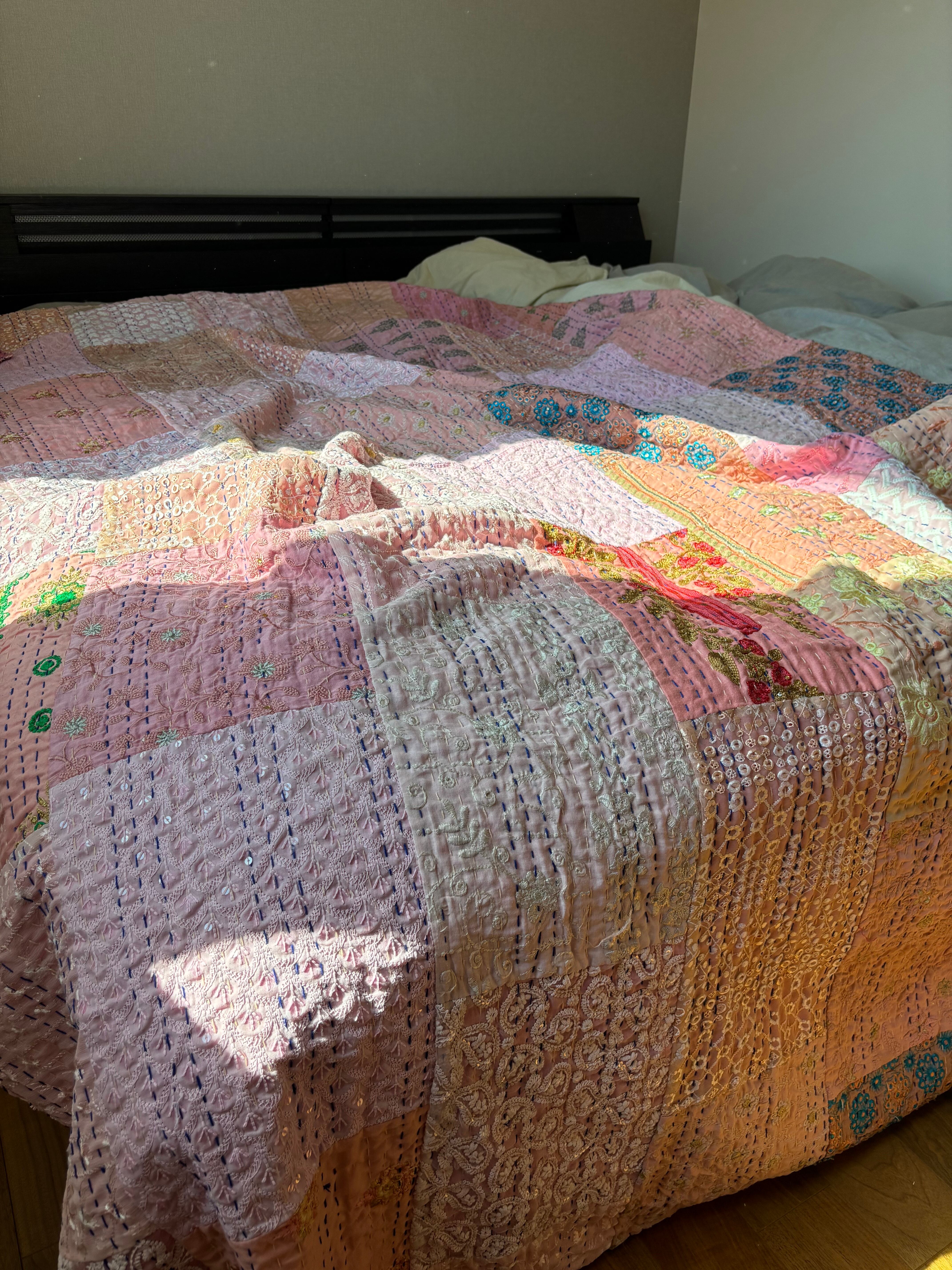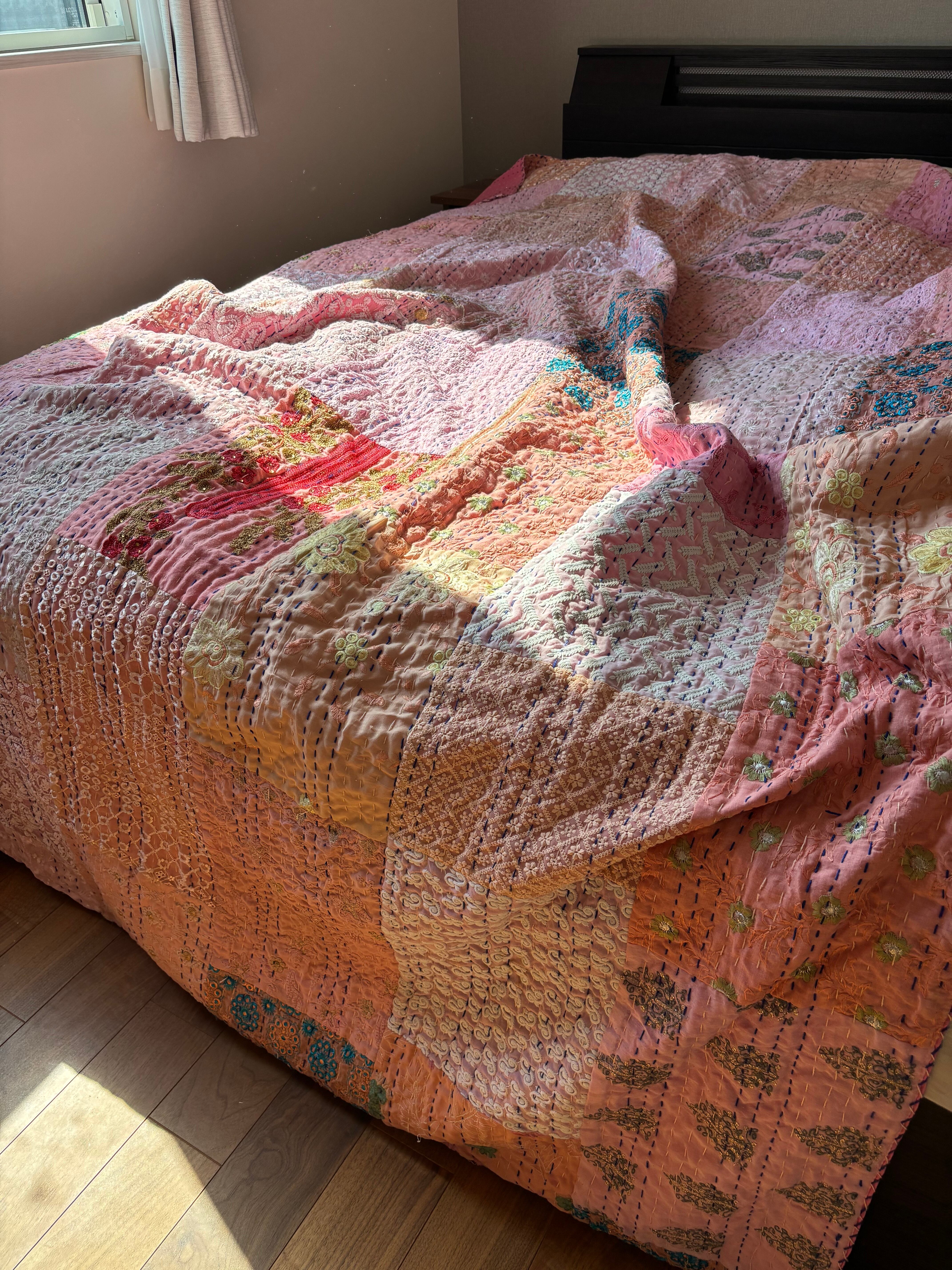 繋ぎ合わせたパッチワークキルトはとても華やか。