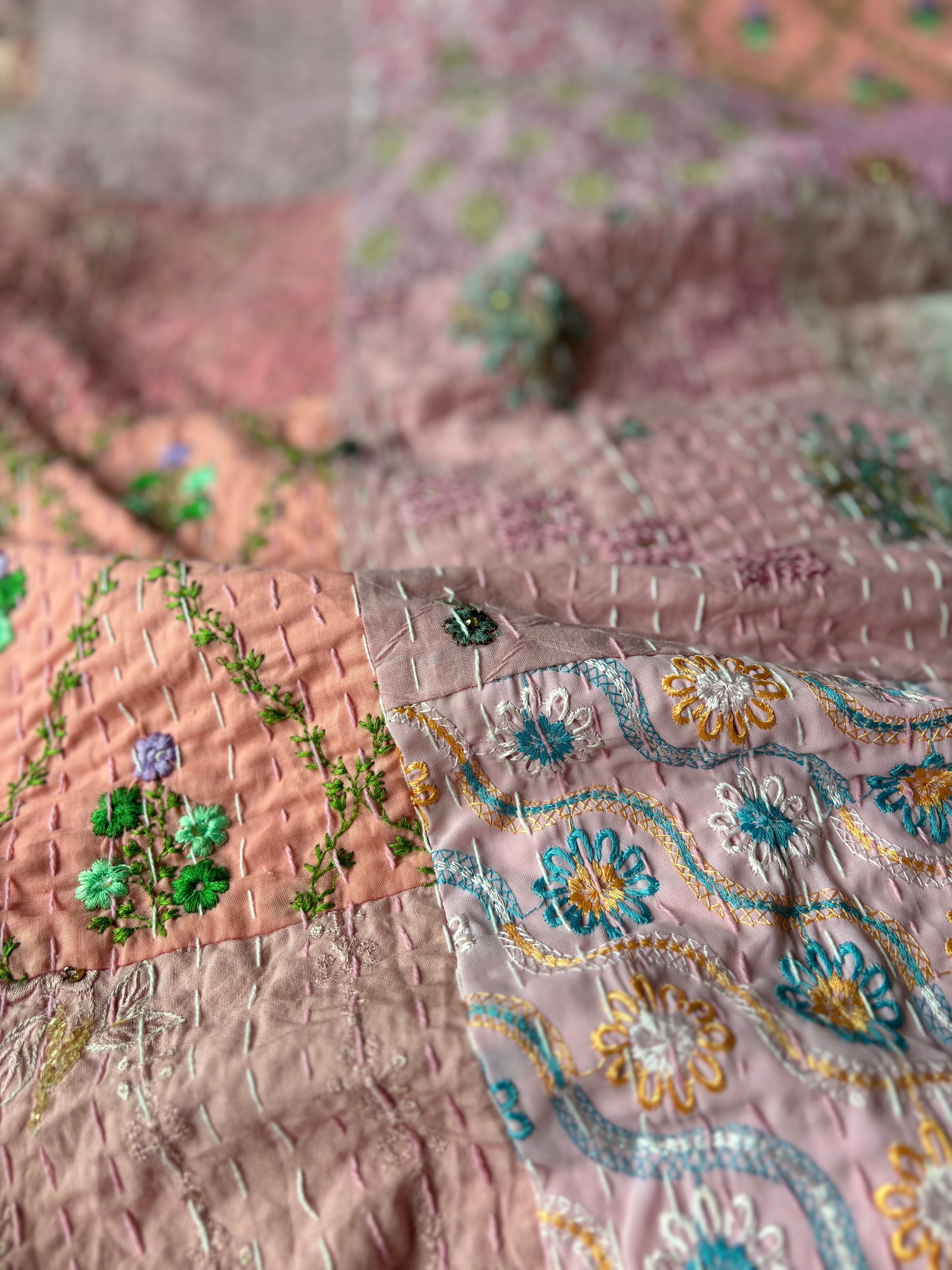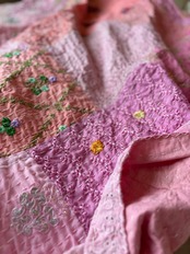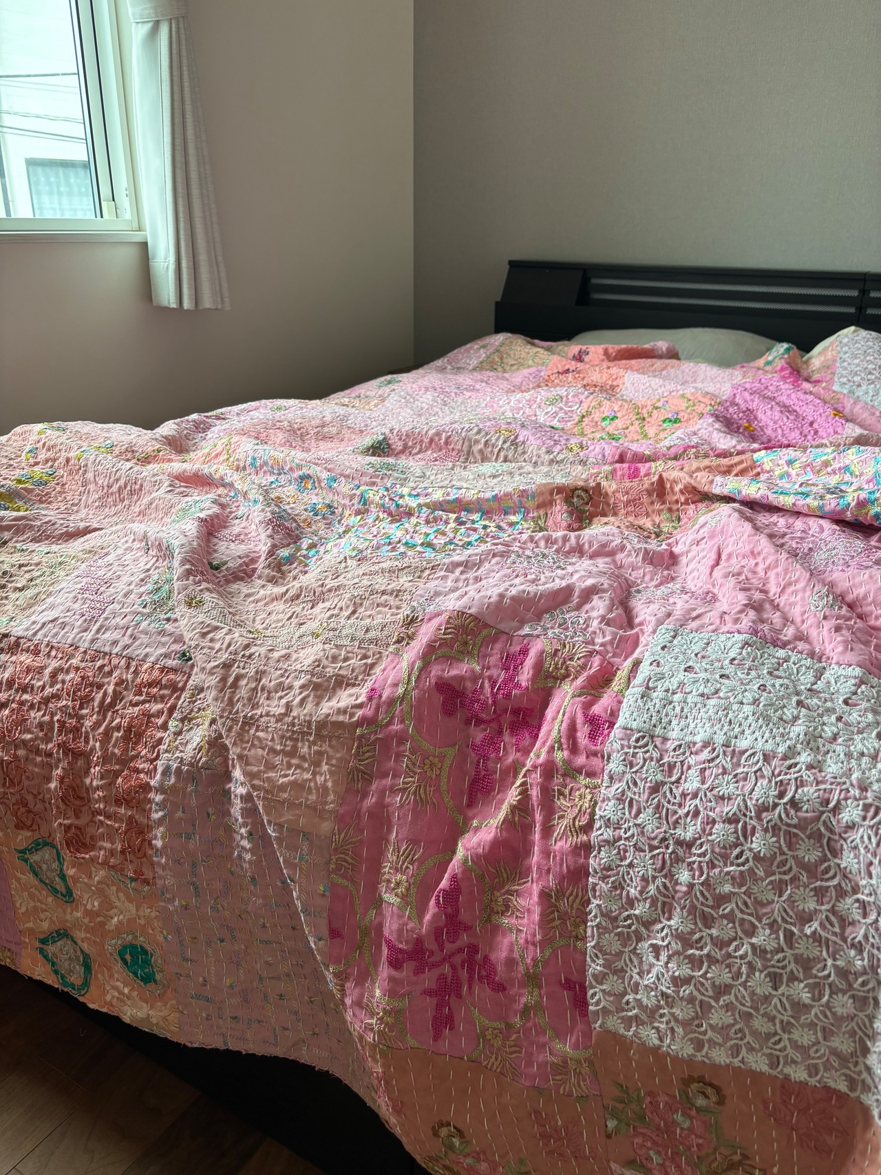 繋ぎ合わせたパッチワークキルトはとても華やか。