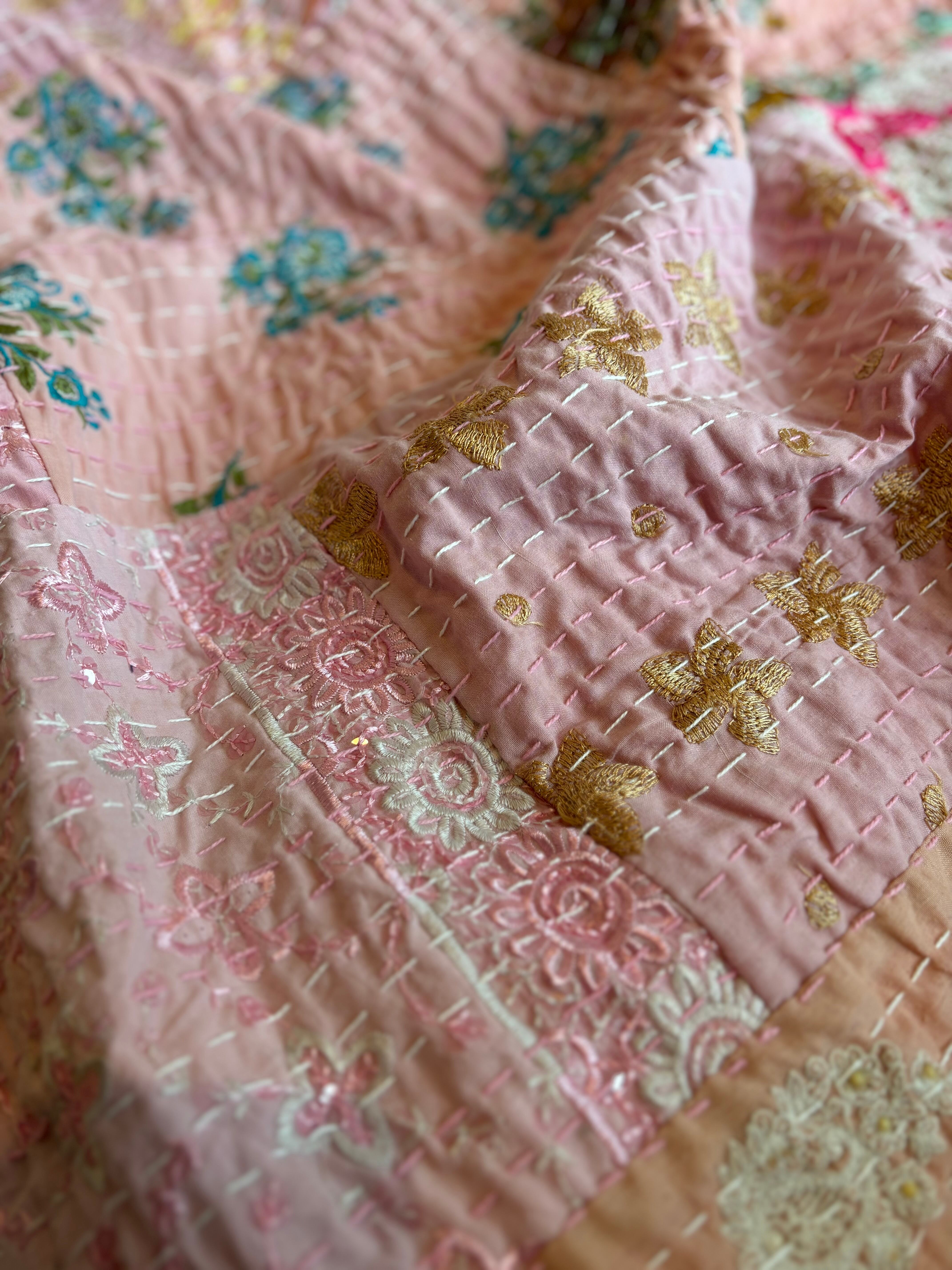 繋ぎ合わせたパッチワークキルトはとても華やか。