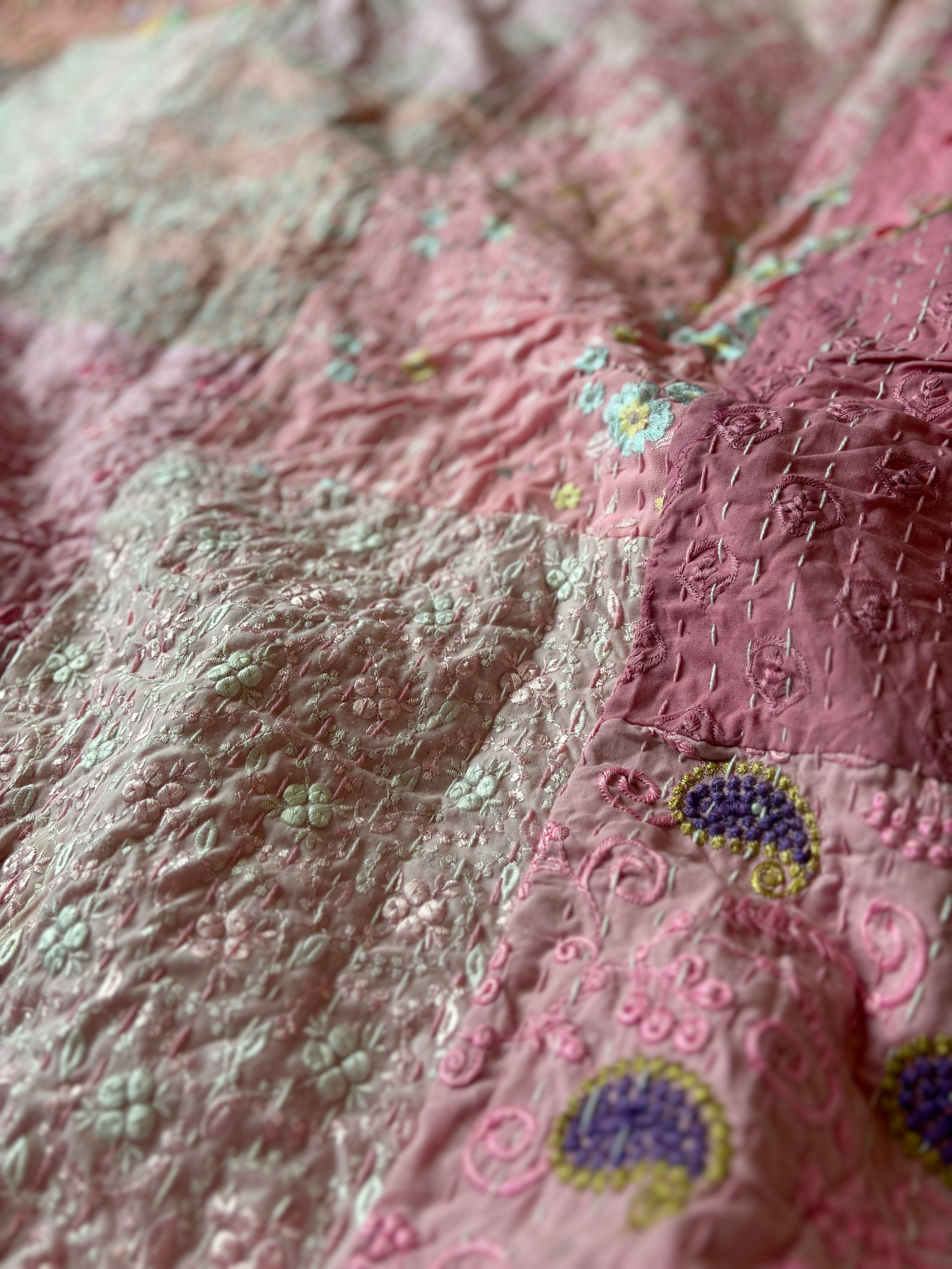 繋ぎ合わせたパッチワークキルトはとても華やか。