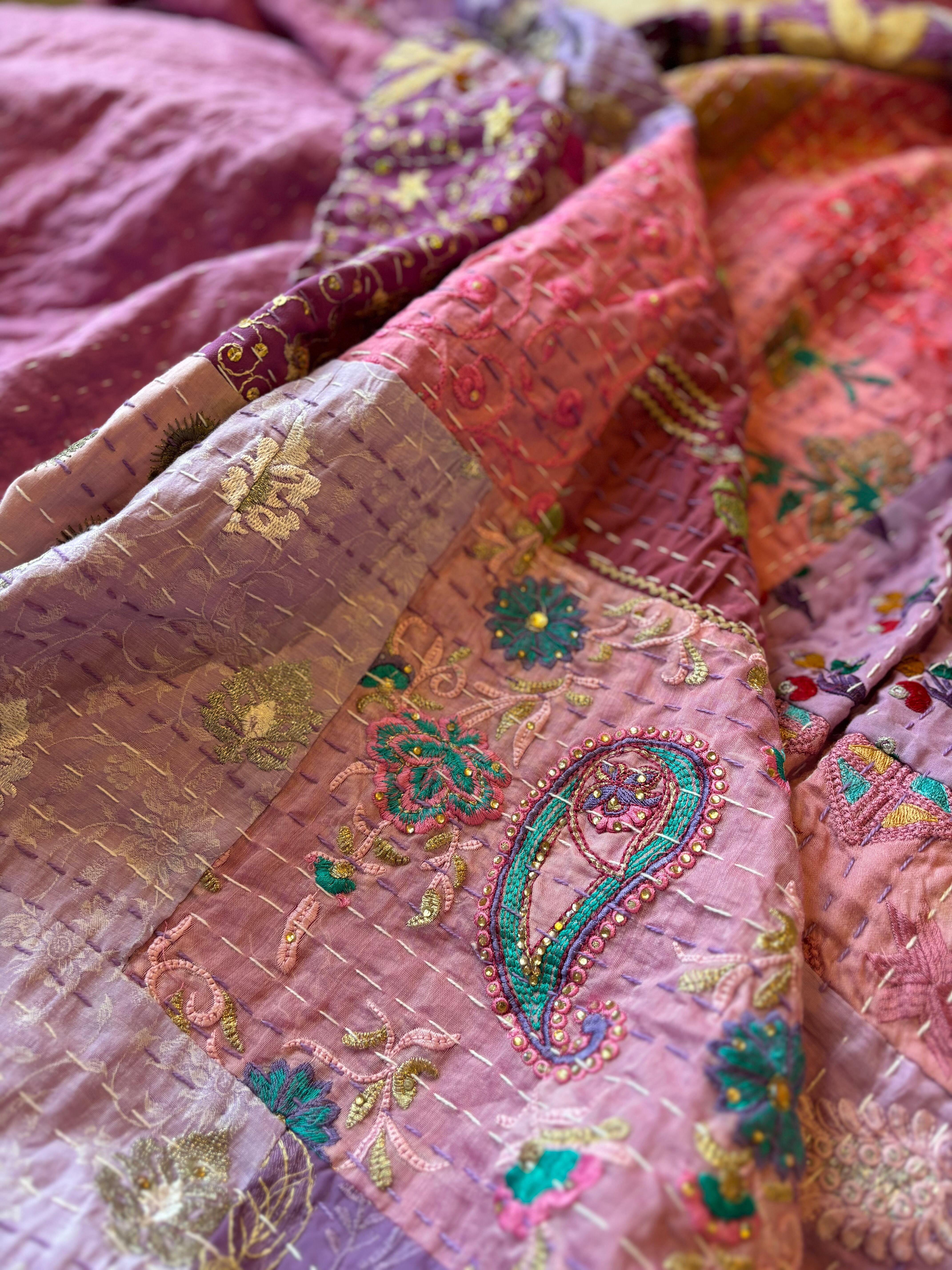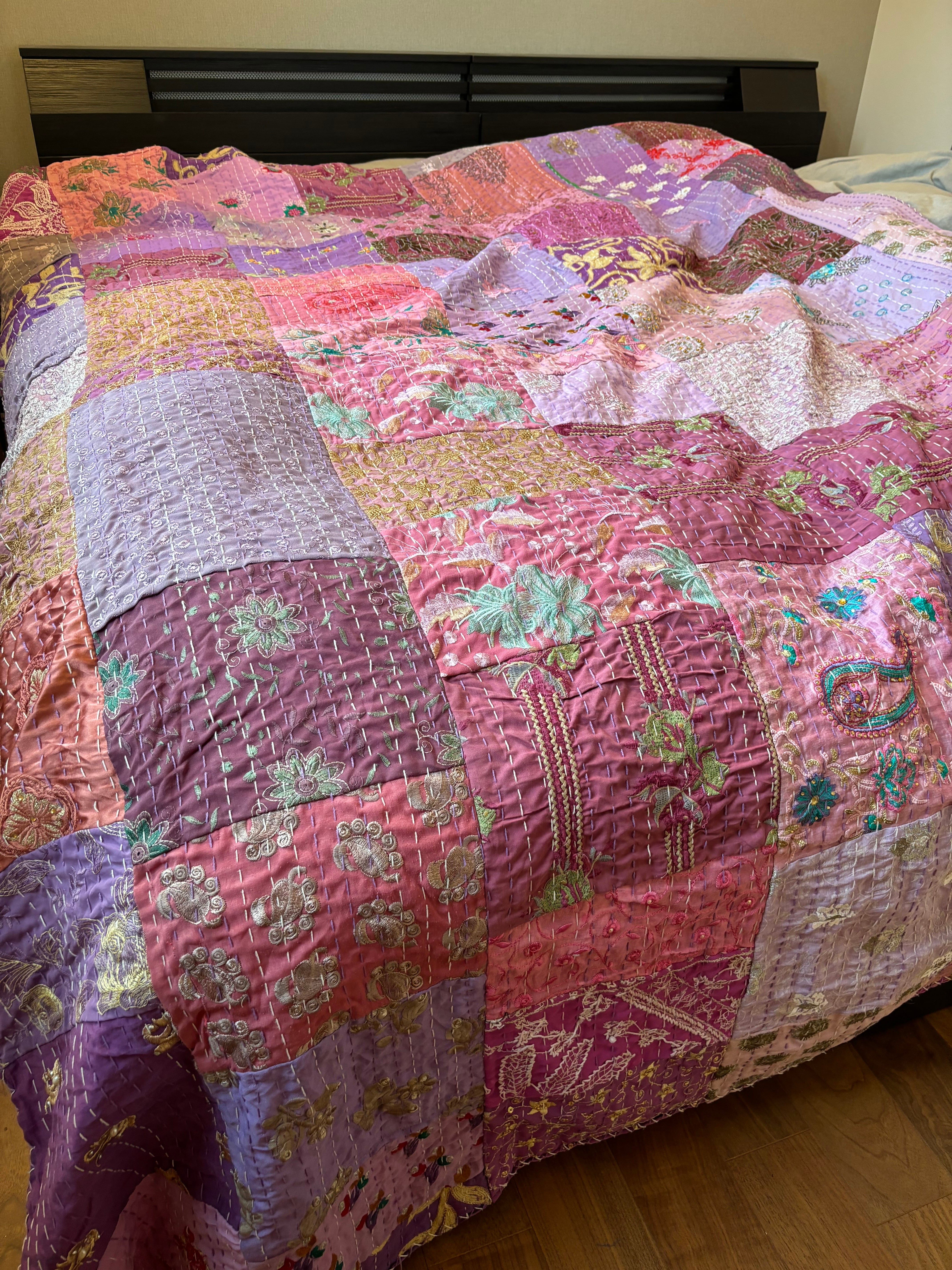 繋ぎ合わせたパッチワークキルトはとても華やか。