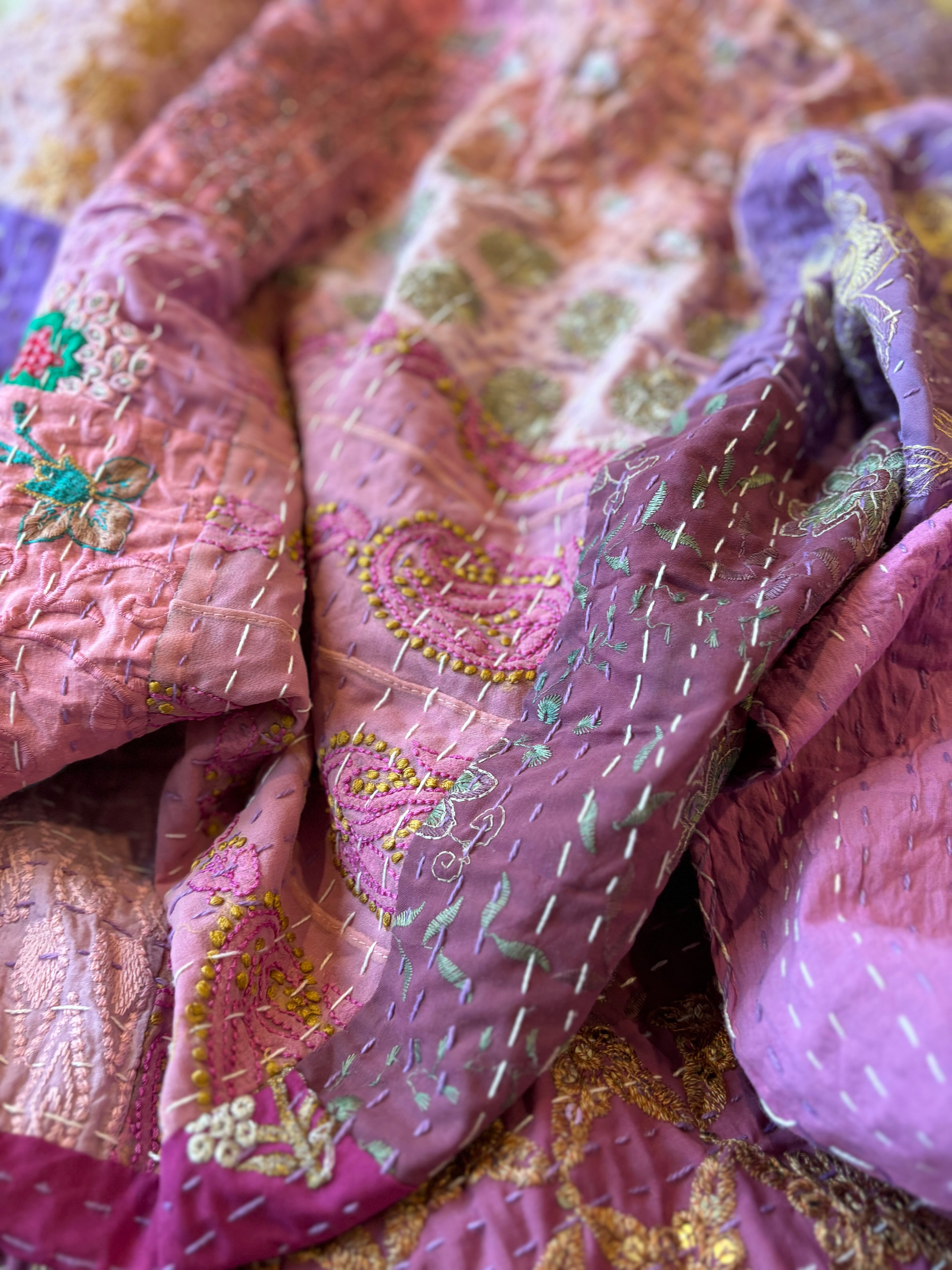 繋ぎ合わせたパッチワークキルトはとても華やか。