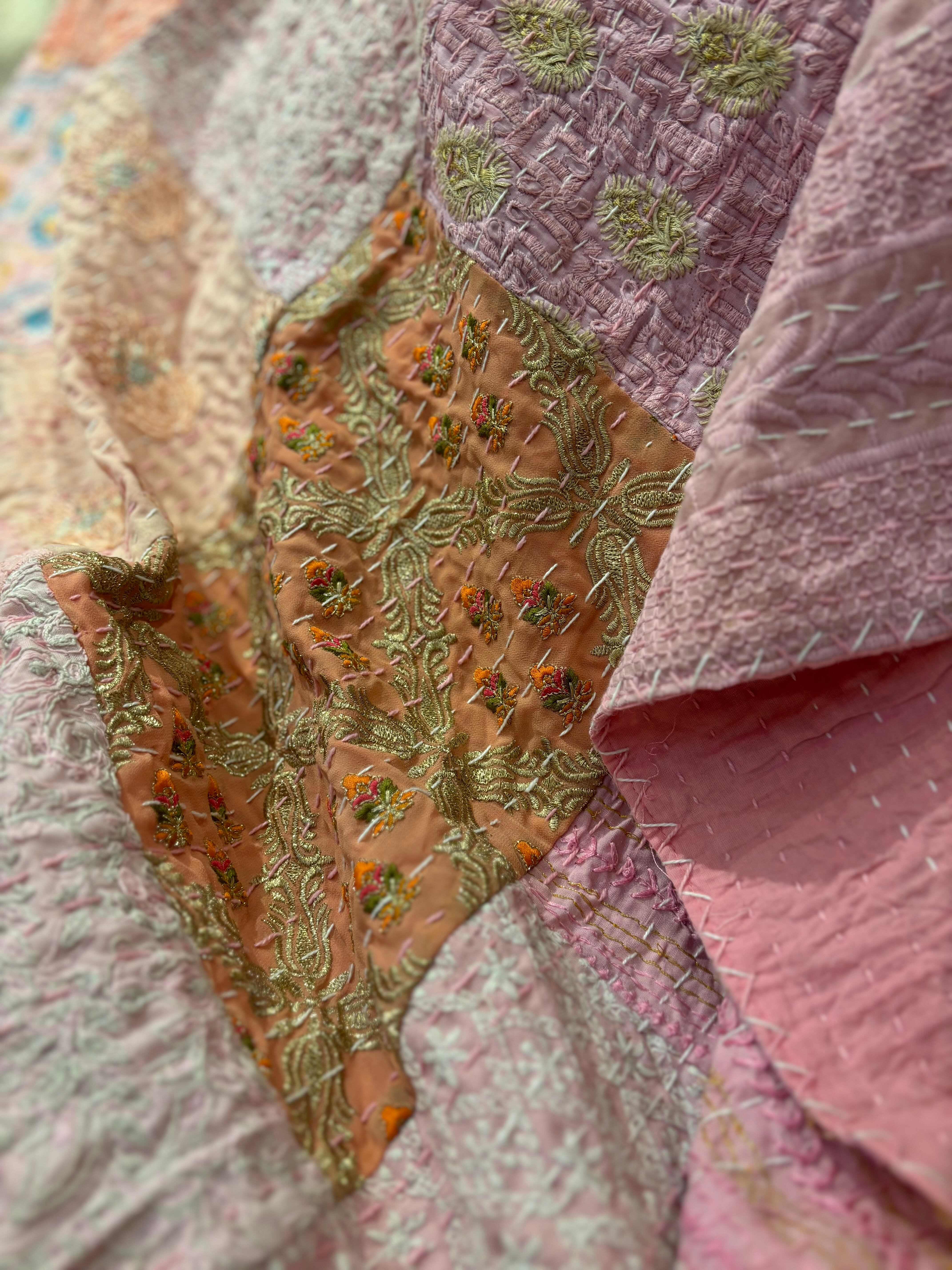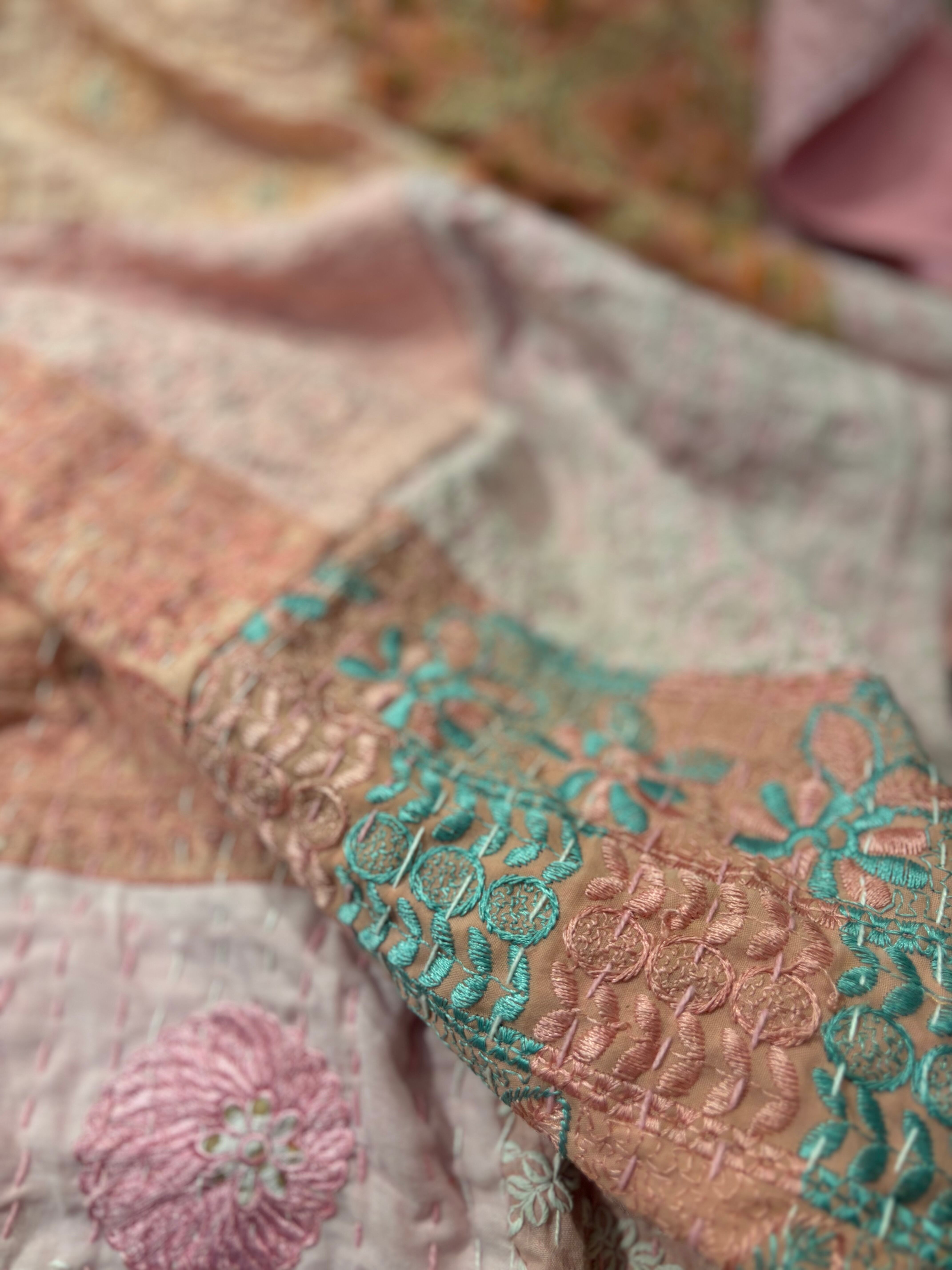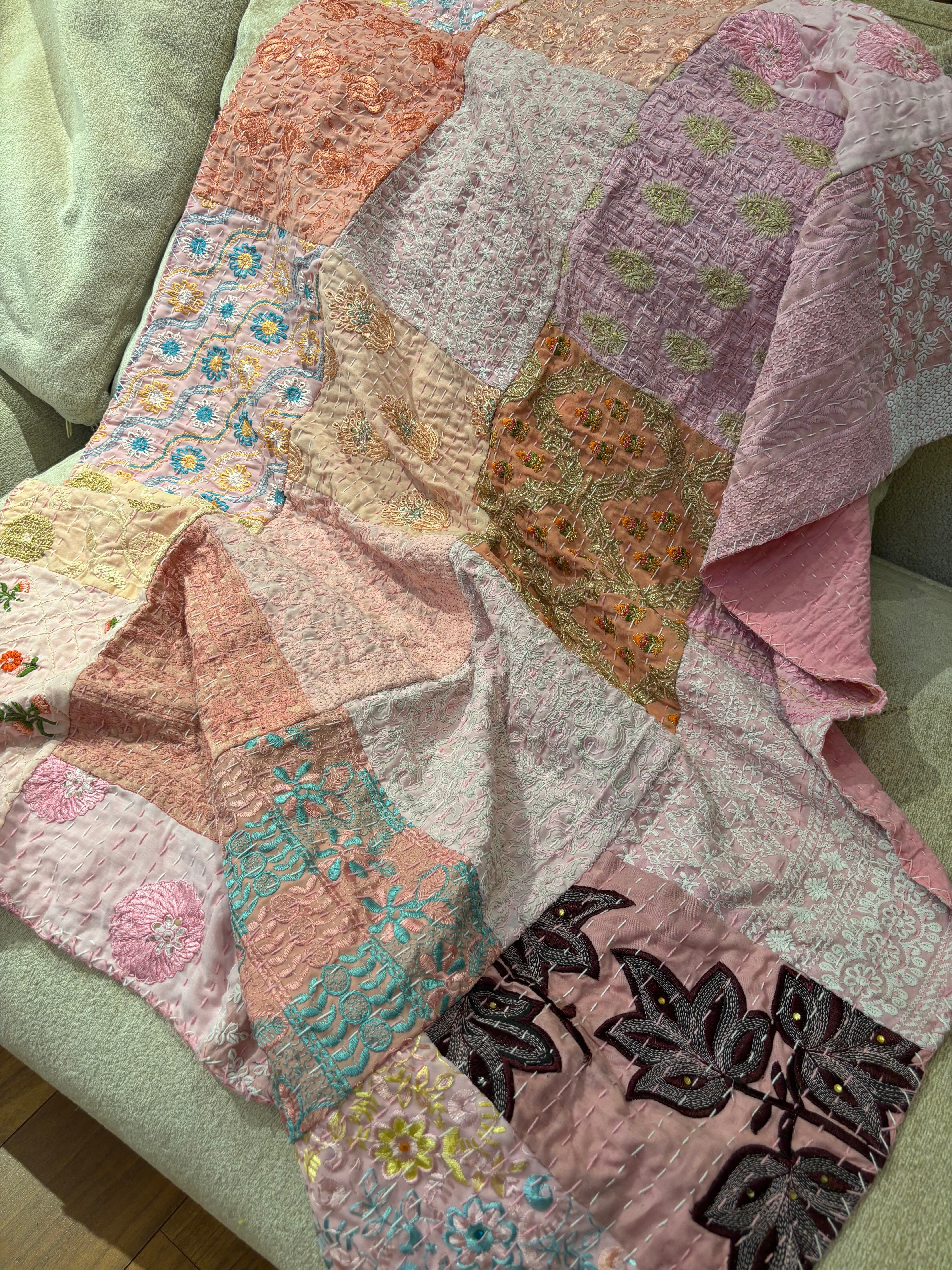 繋ぎ合わせたパッチワークキルトはとても華やか。