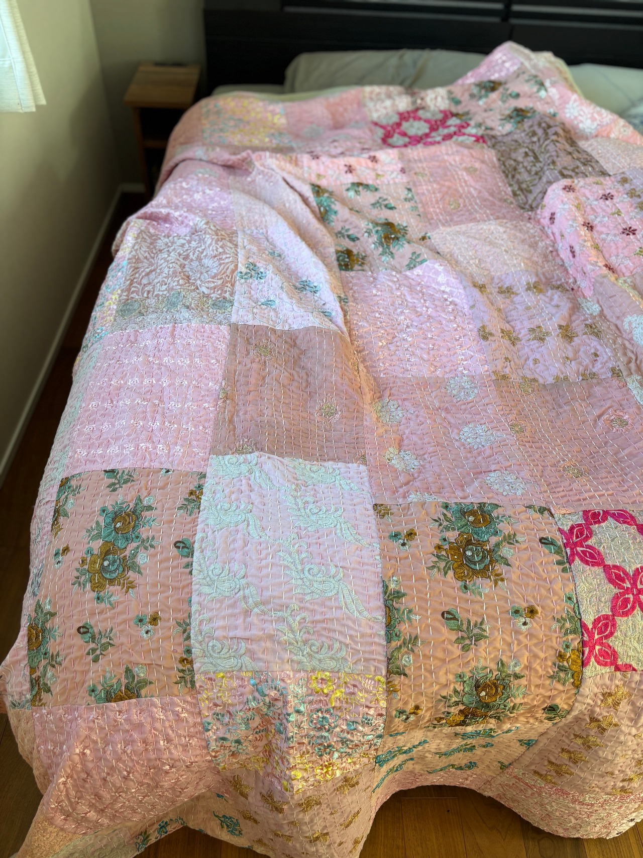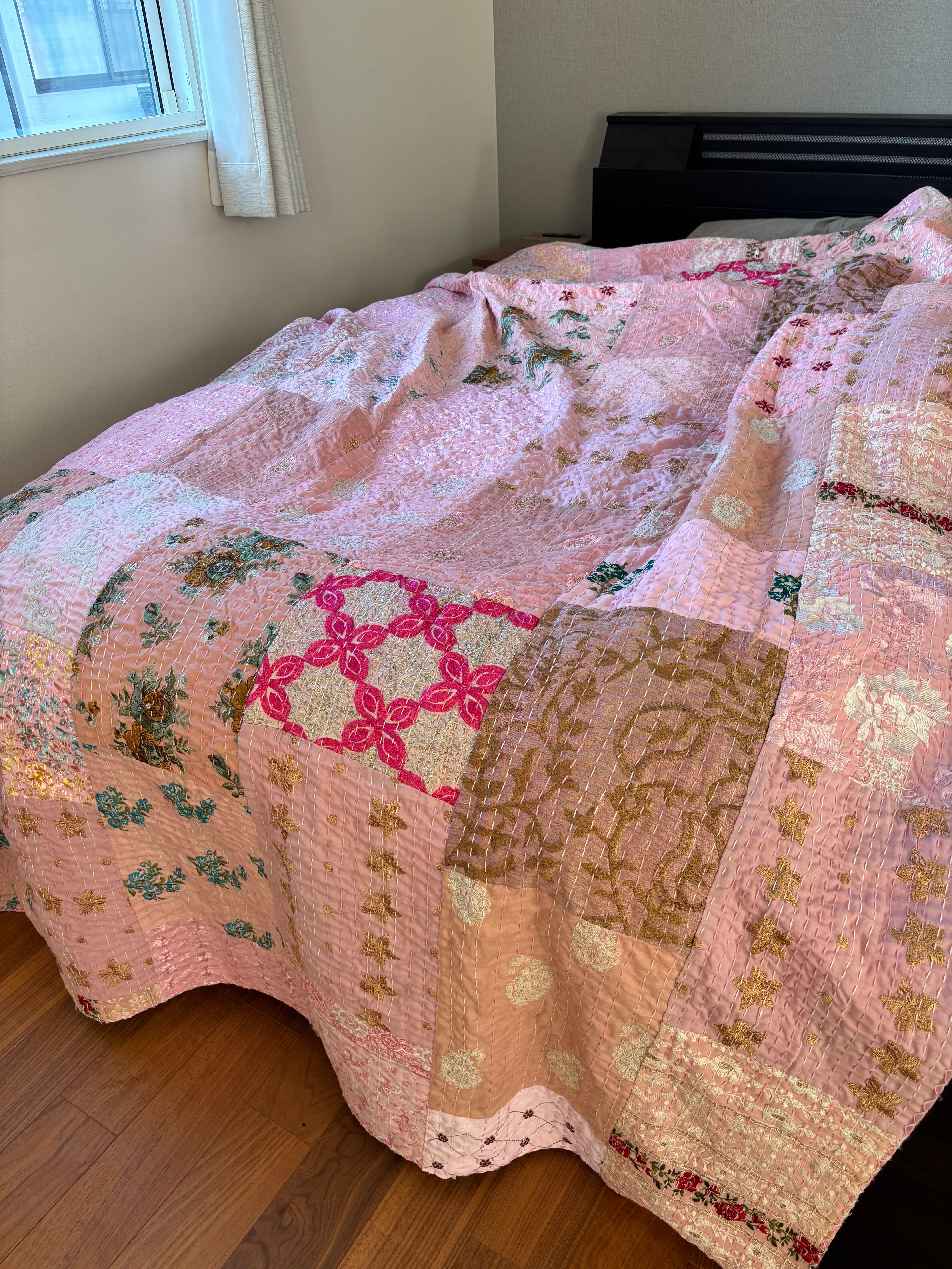 繋ぎ合わせたパッチワークキルトはとても華やか。
