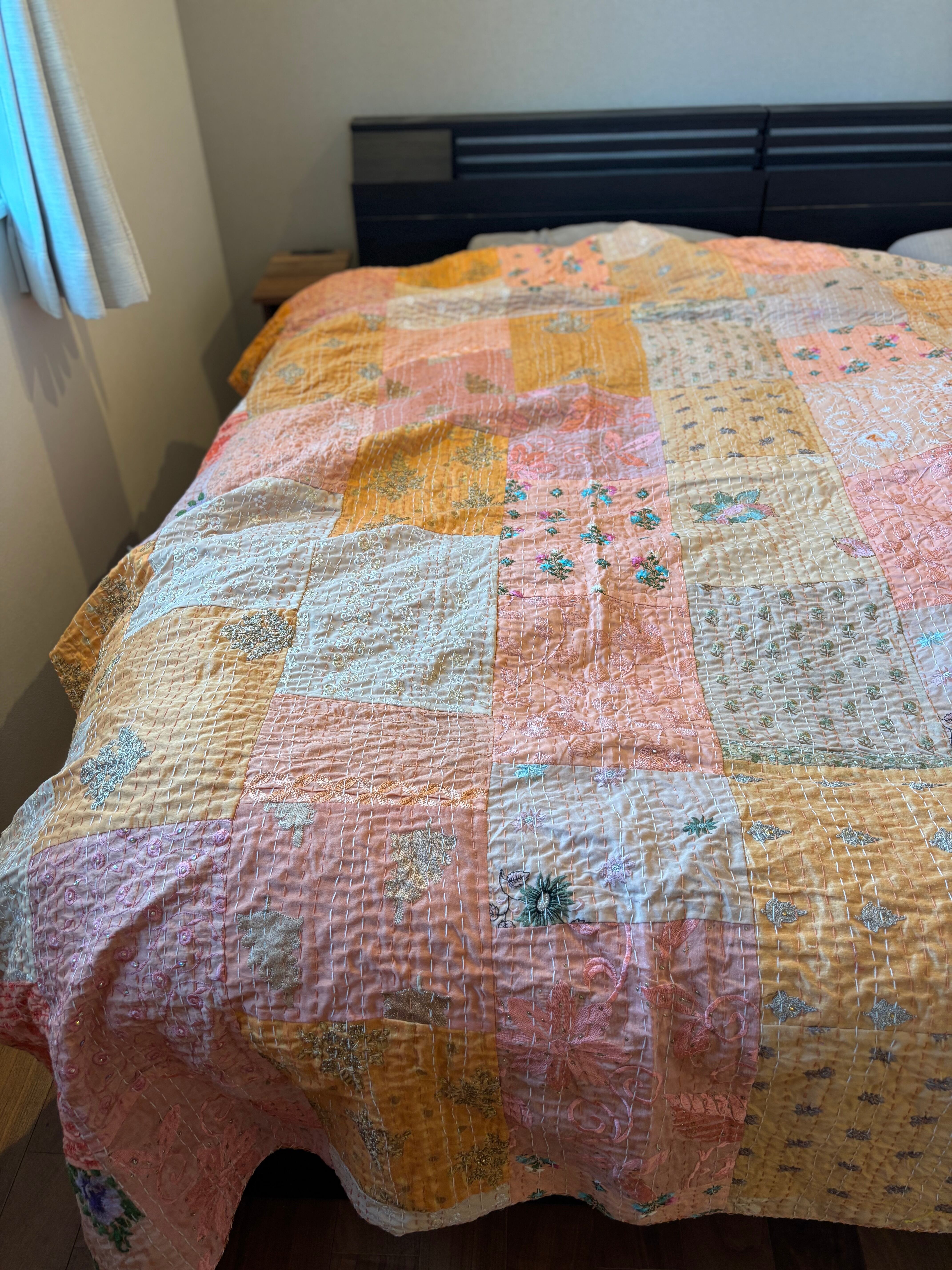 繋ぎ合わせたパッチワークキルトはとても華やか。