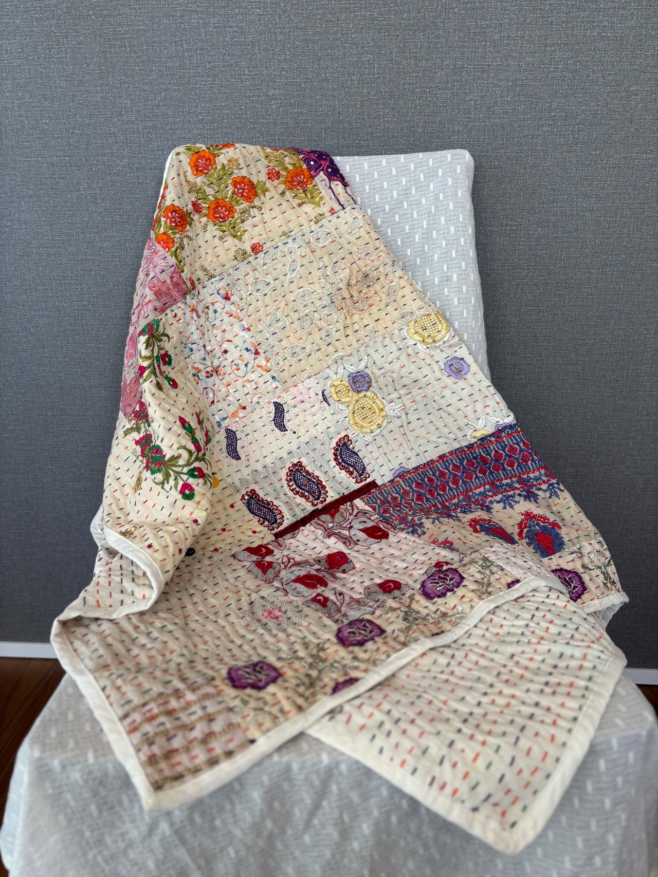 繋ぎ合わせたパッチワークキルトはとても華やか。