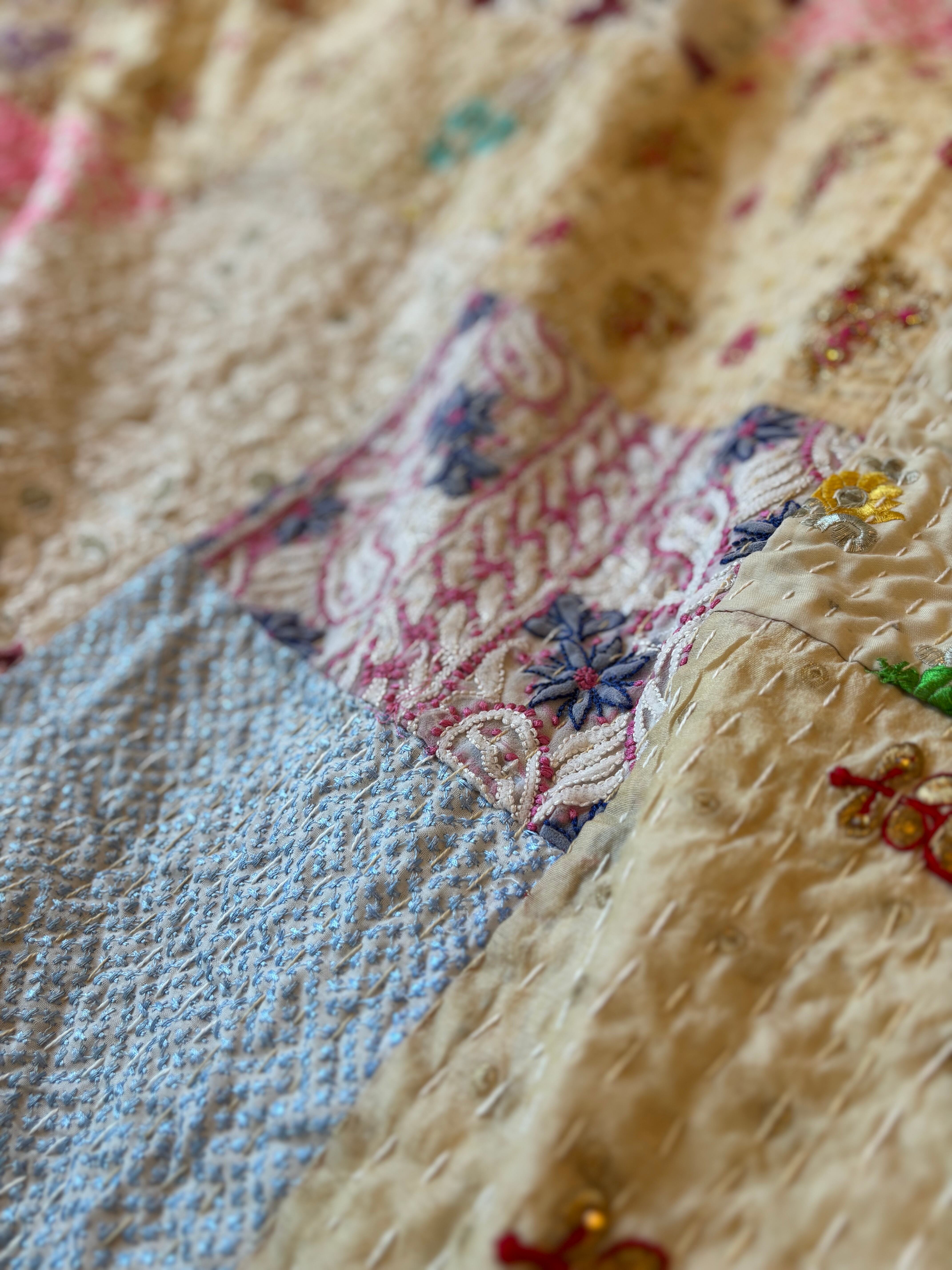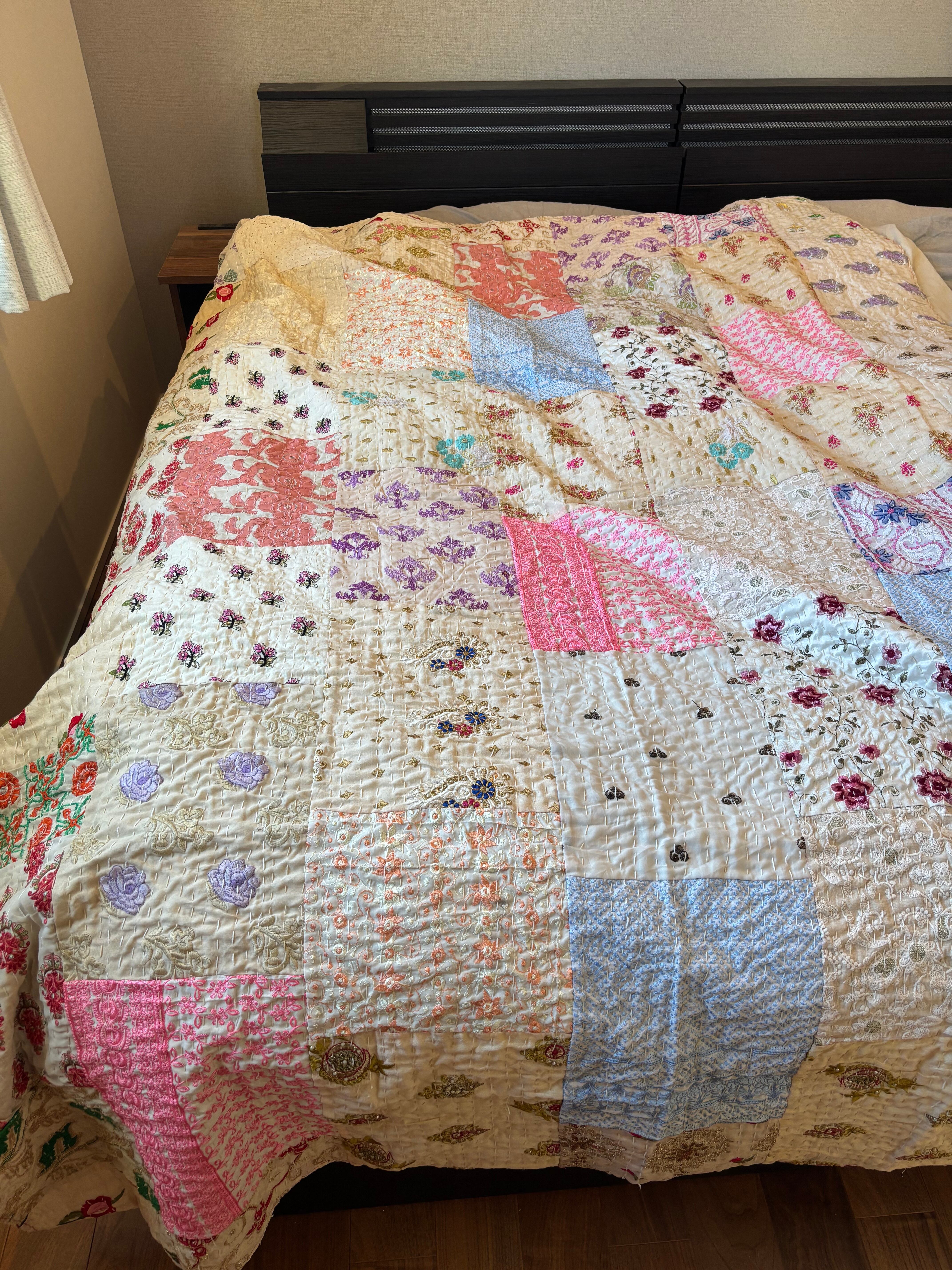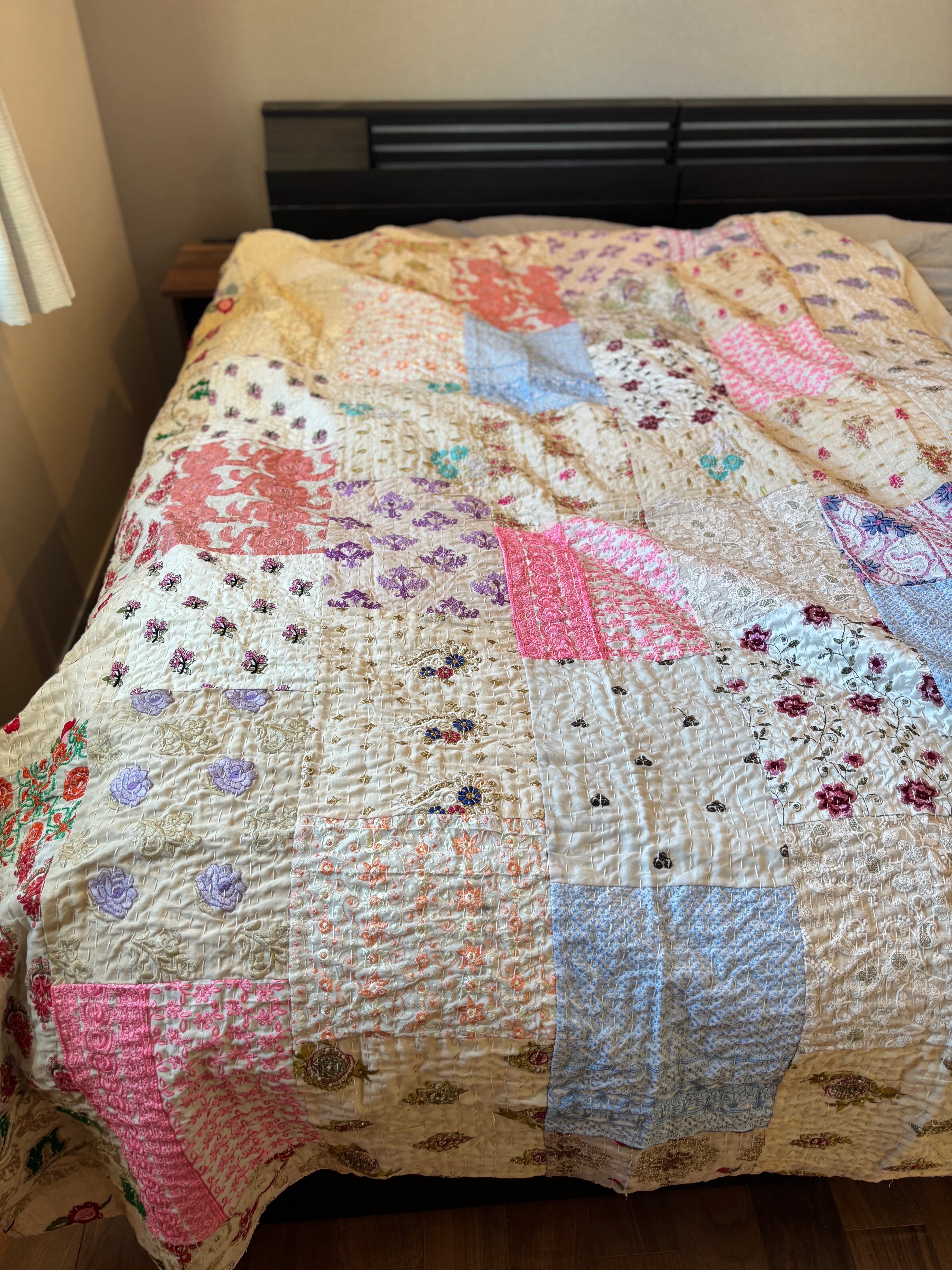 繋ぎ合わせたパッチワークキルトはとても華やか。