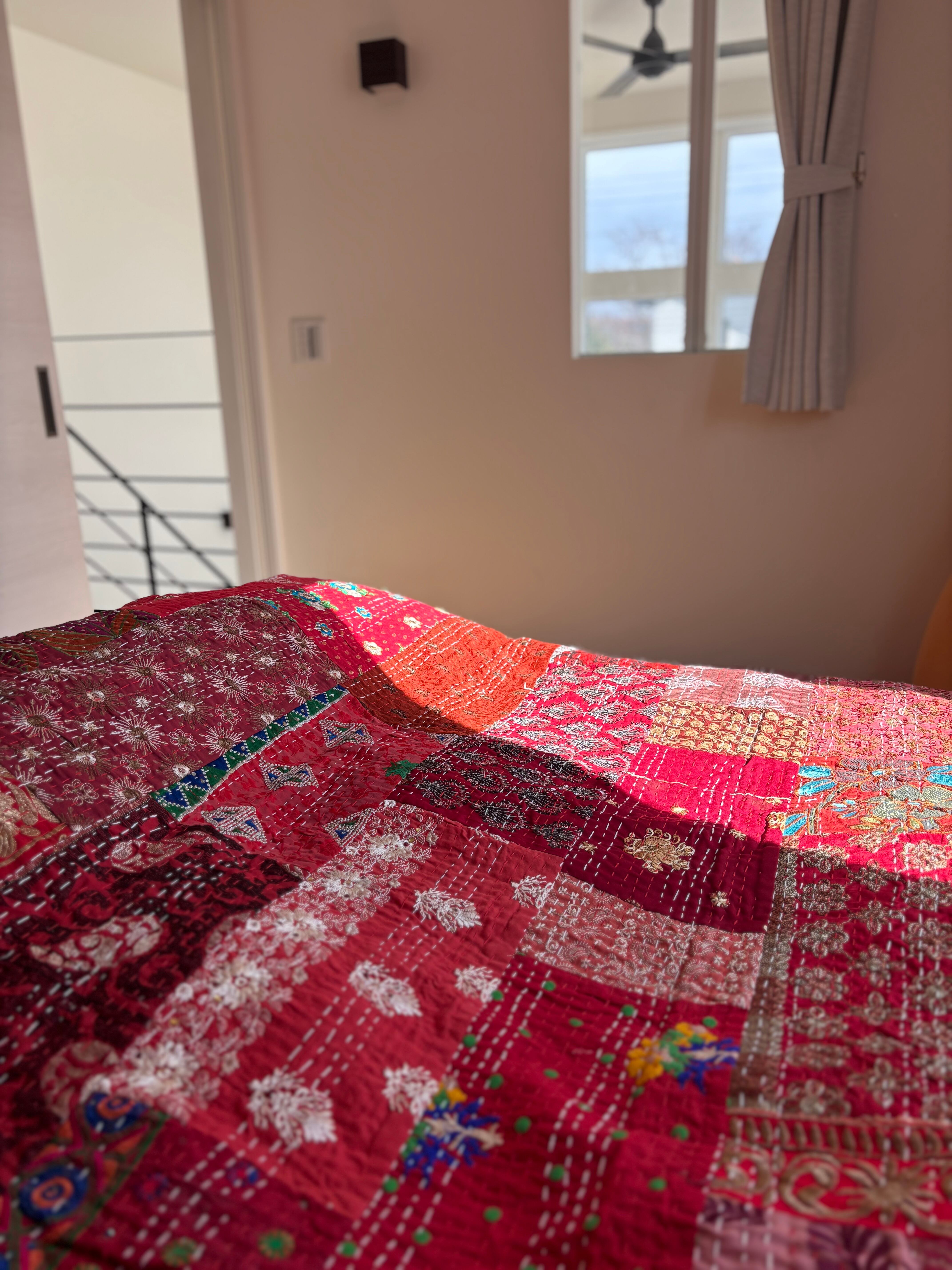 繋ぎ合わせたパッチワークキルトはとても華やか。
