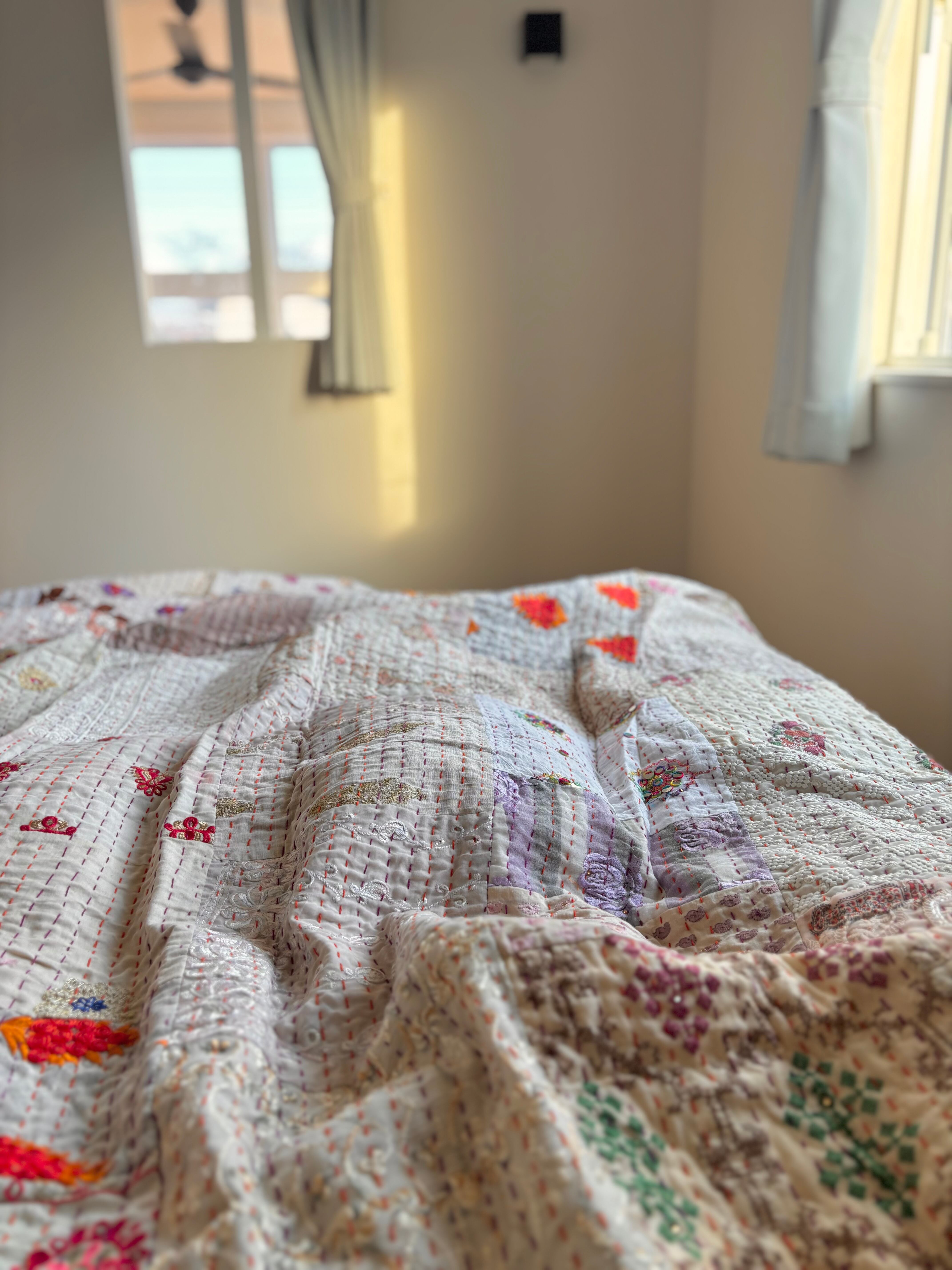 繋ぎ合わせたパッチワークキルトはとても華やか。
