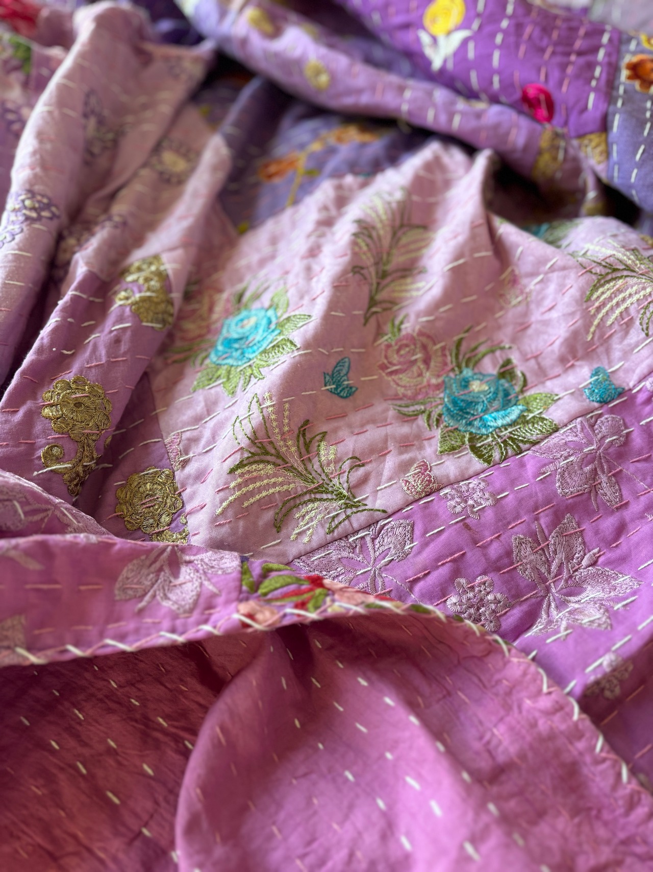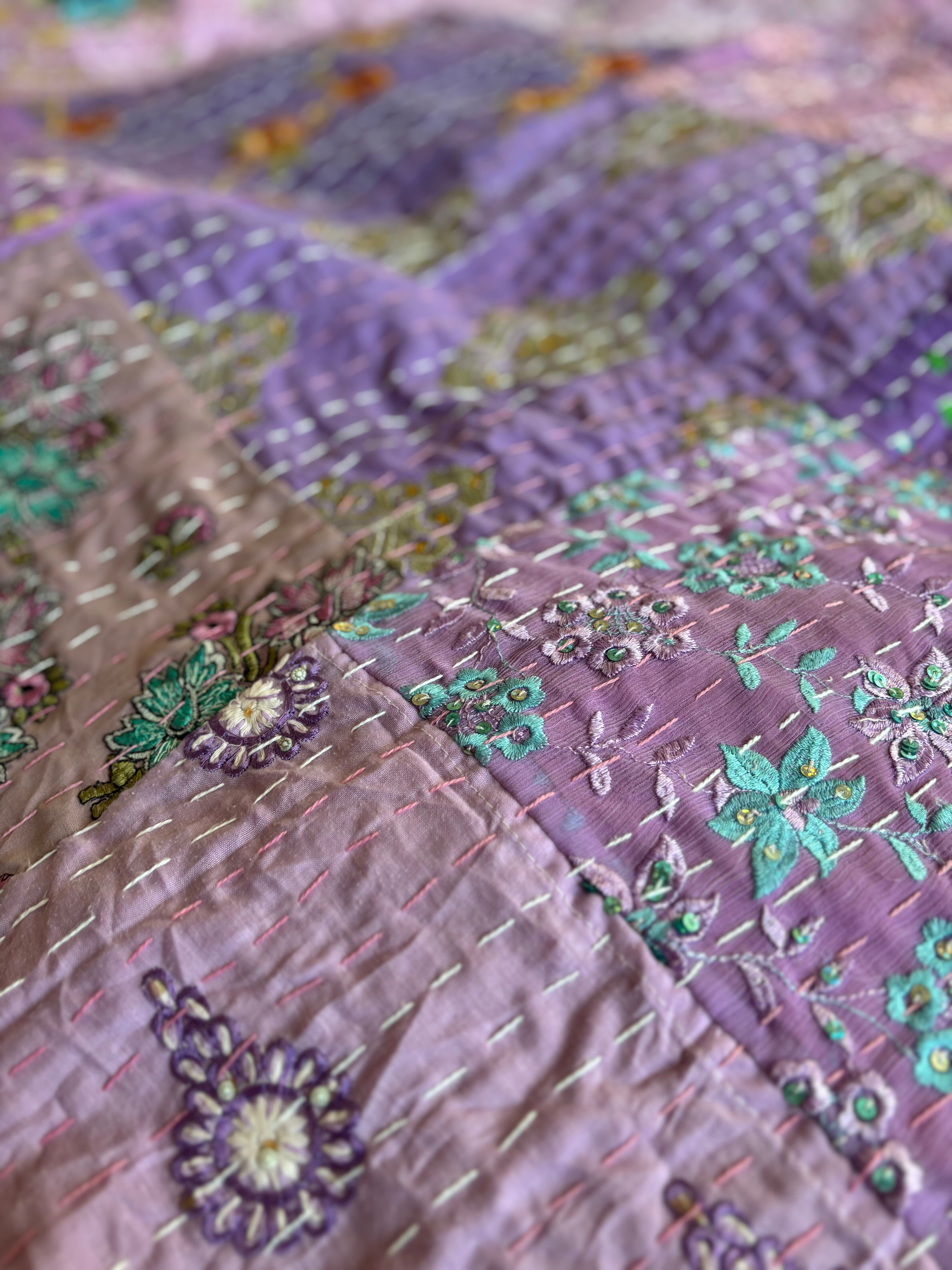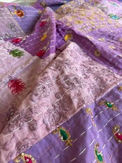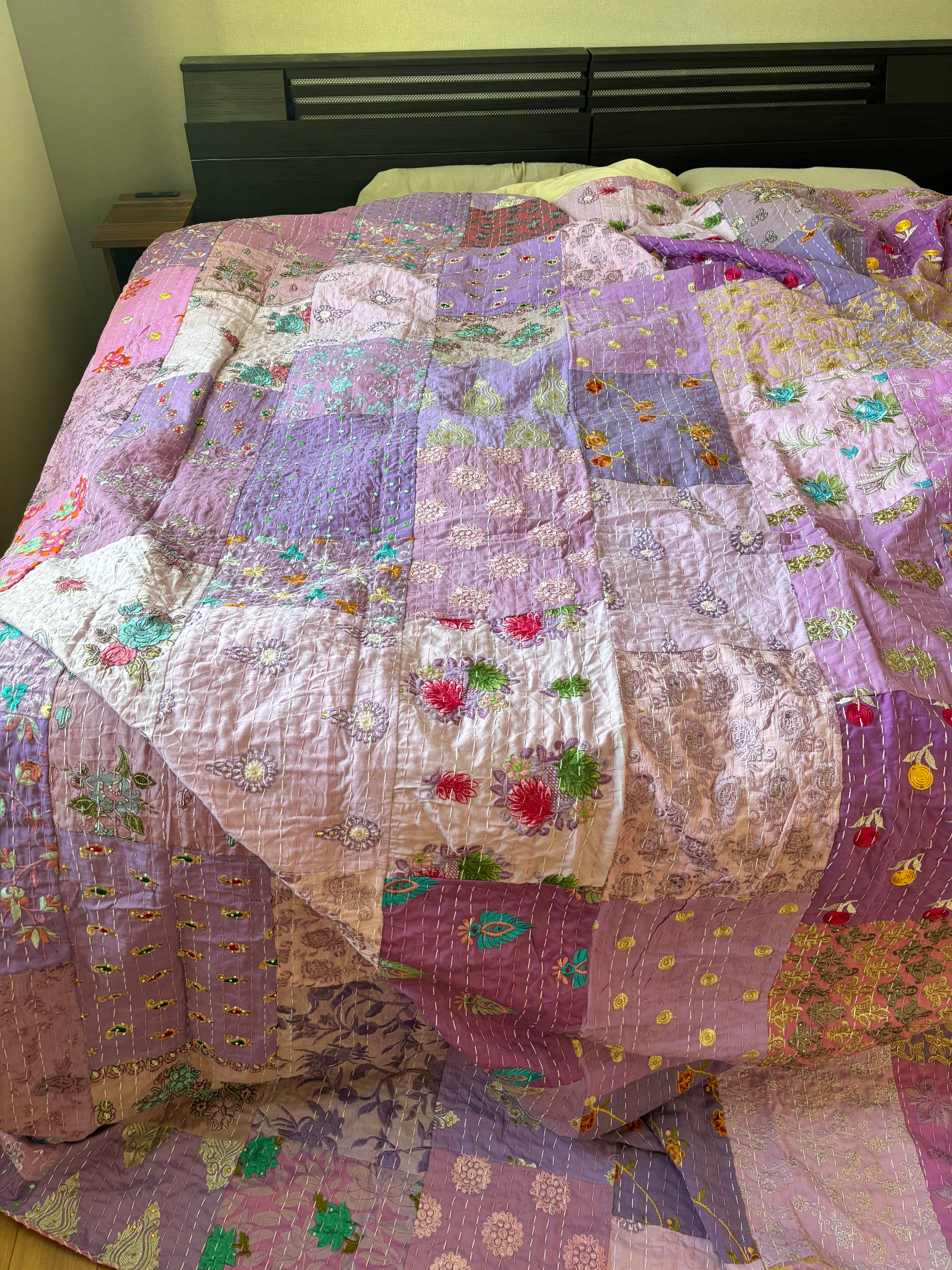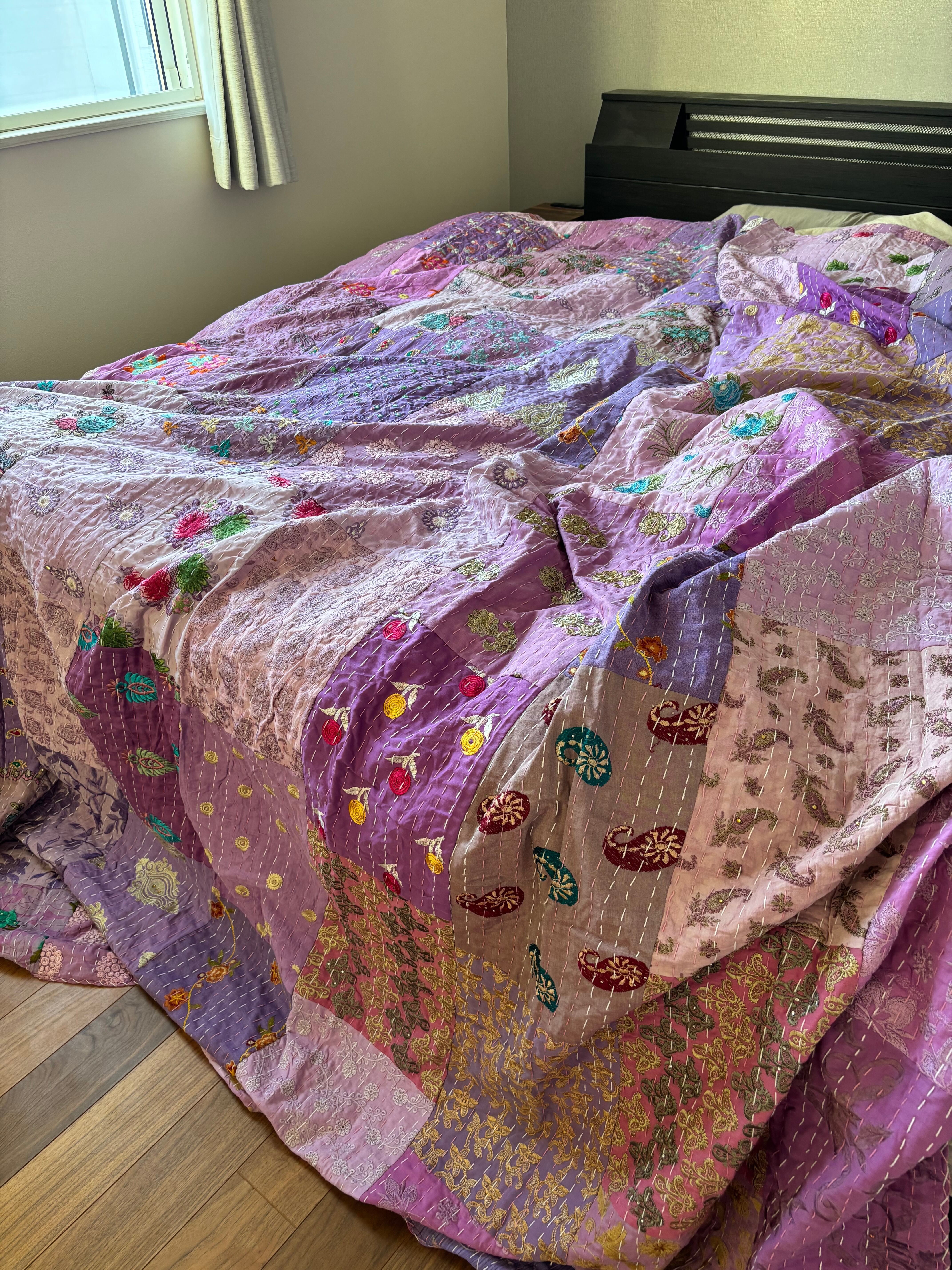 繋ぎ合わせたパッチワークキルトはとても華やか。