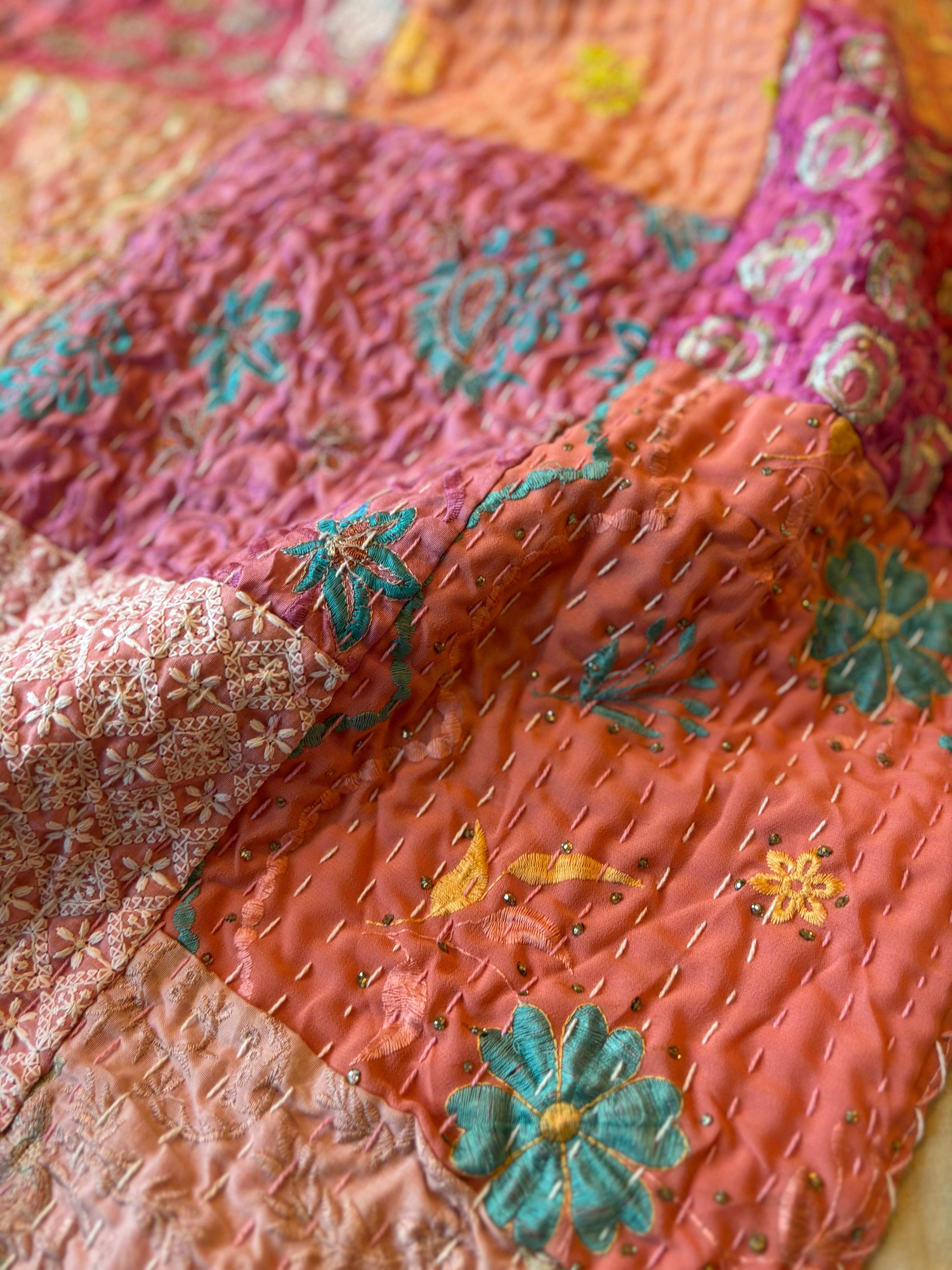 繋ぎ合わせたパッチワークキルトはとても華やか。