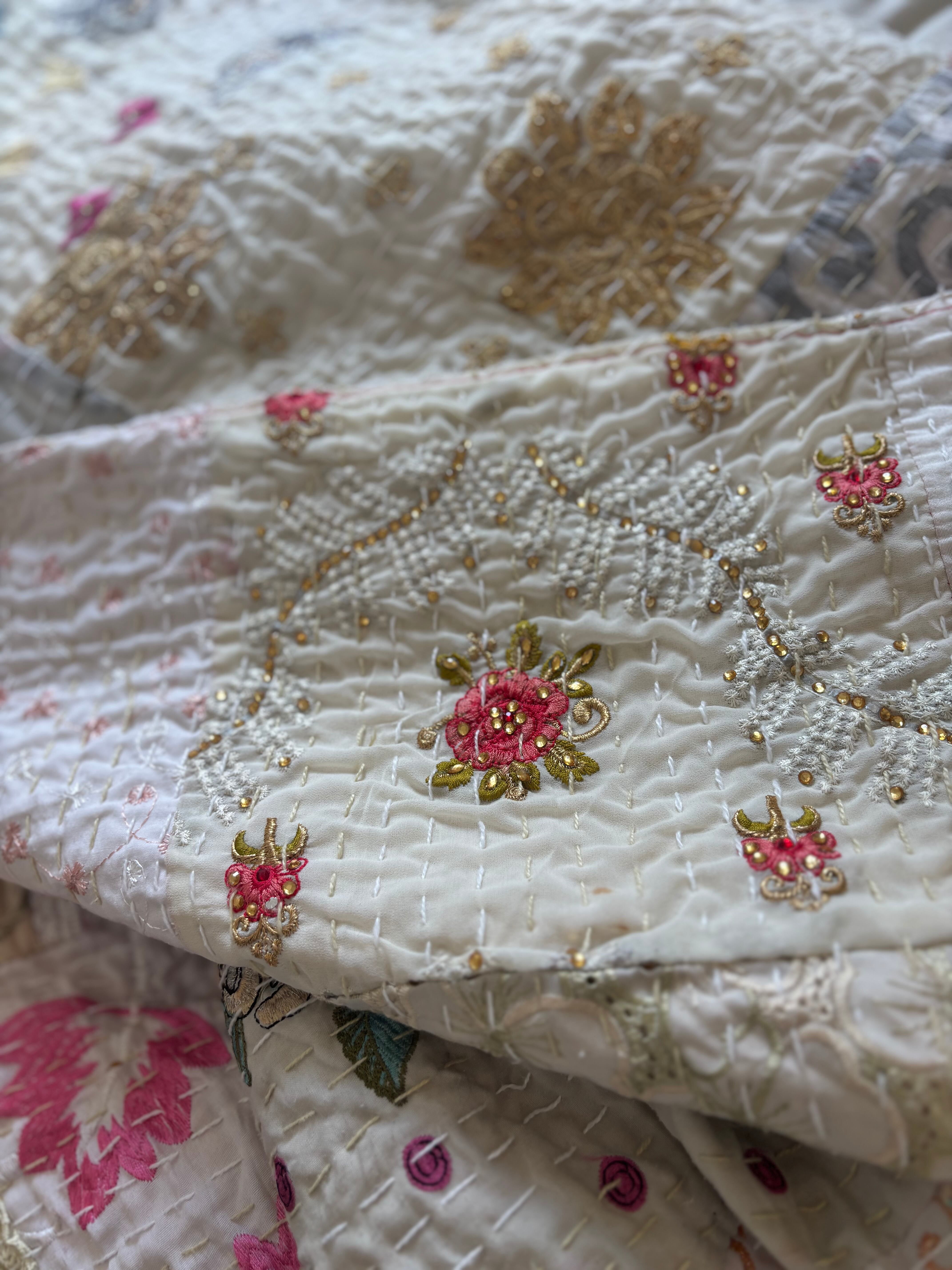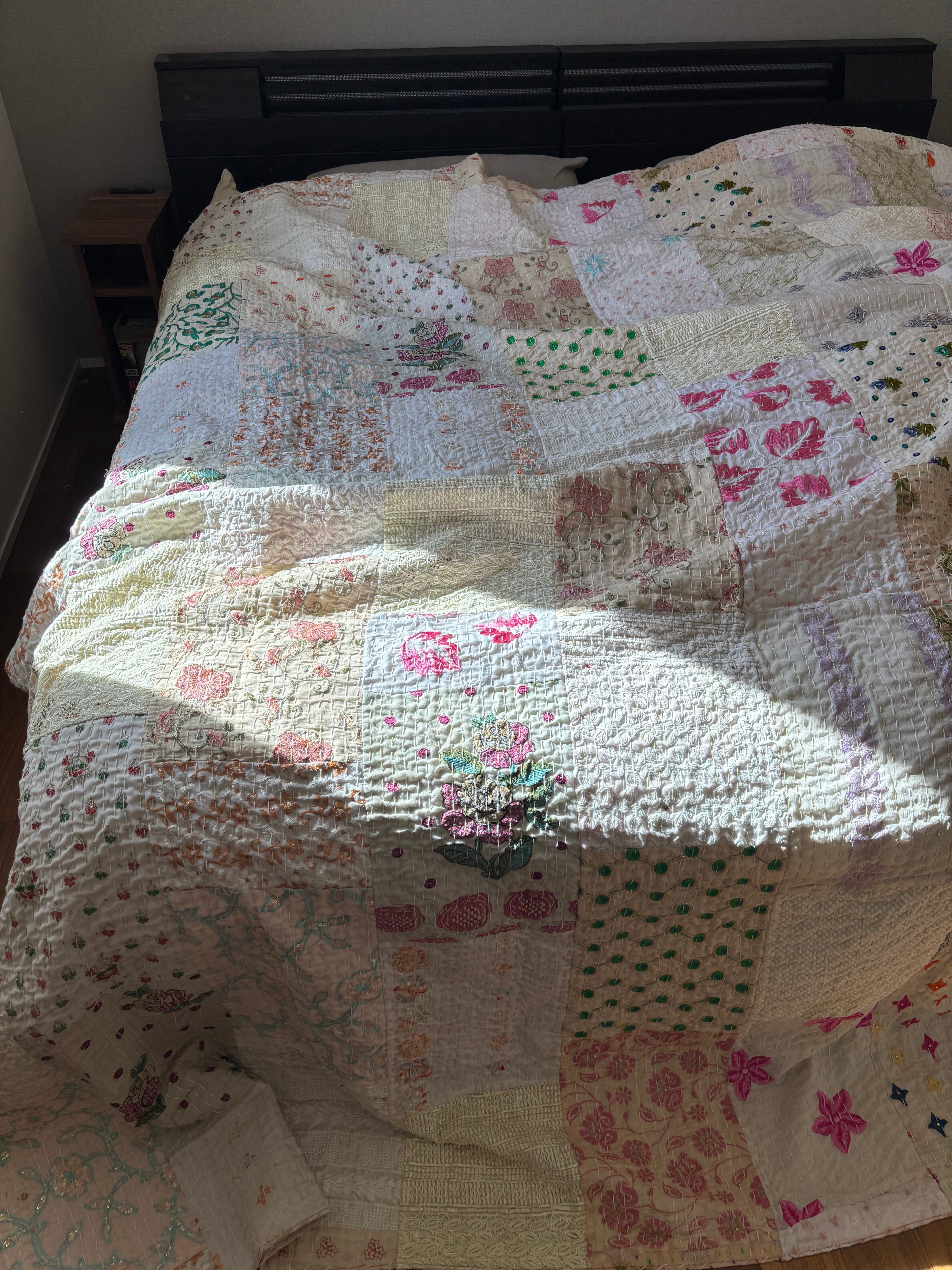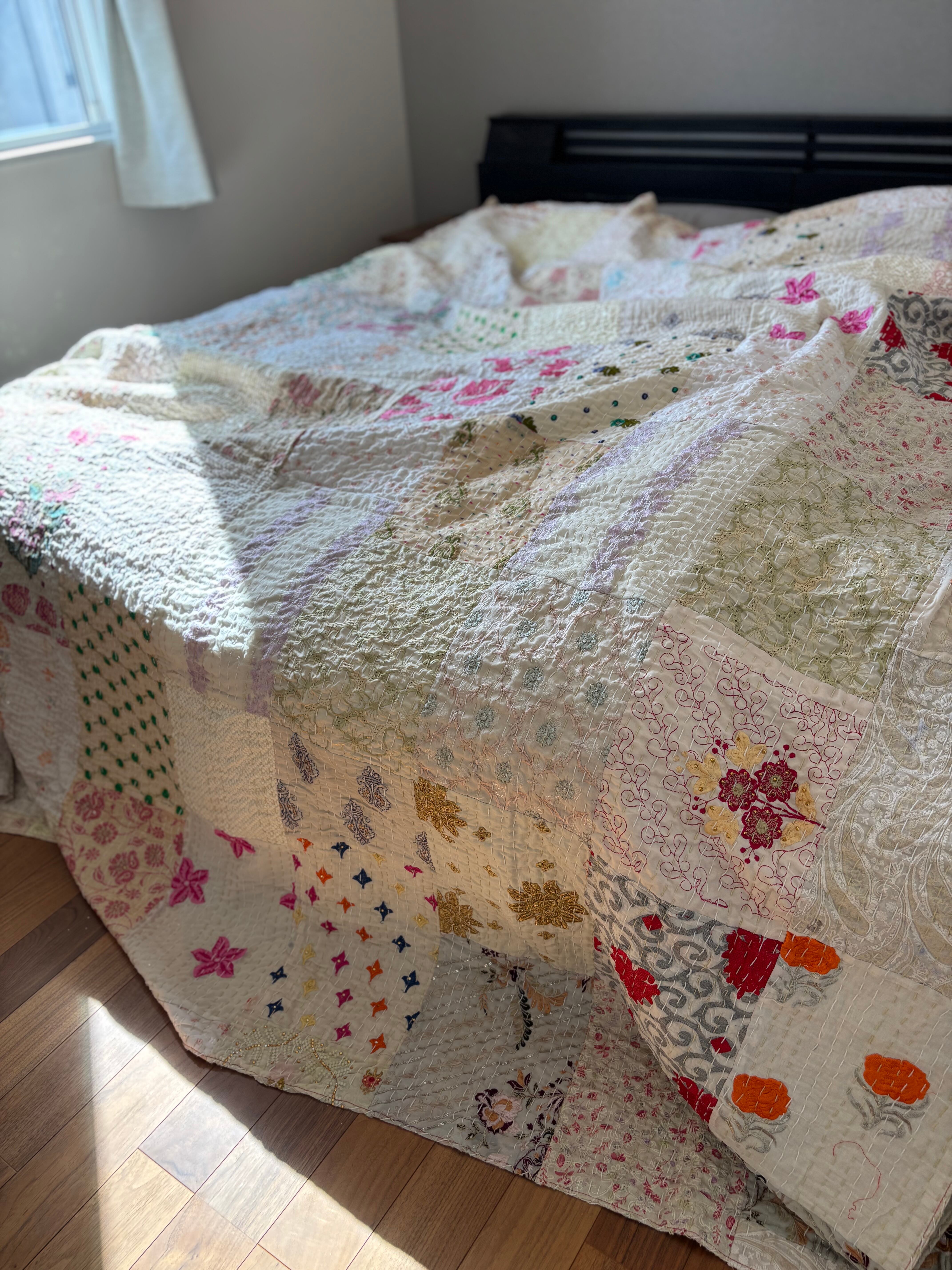 繋ぎ合わせたパッチワークキルトはとても華やか。