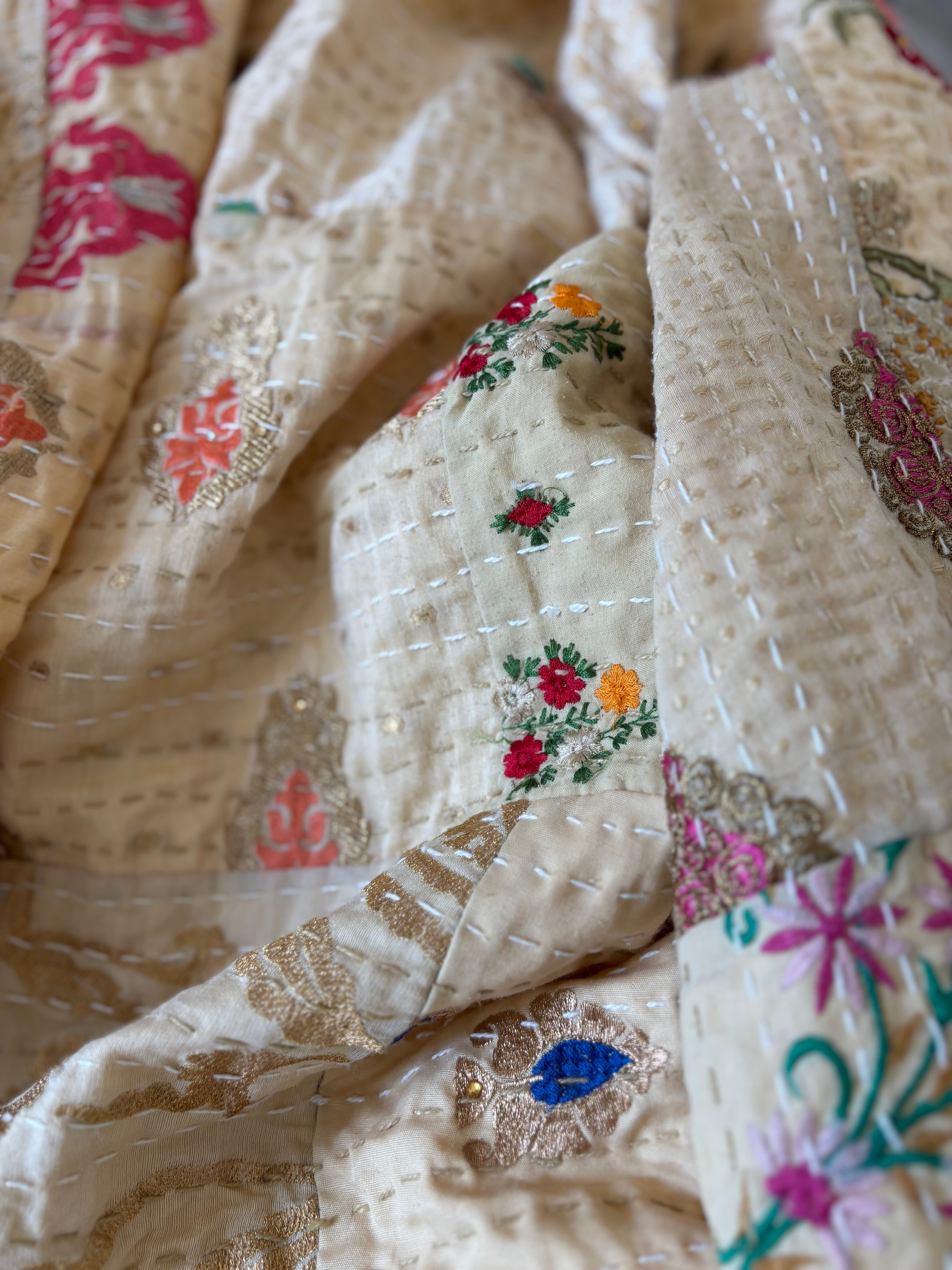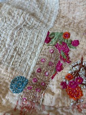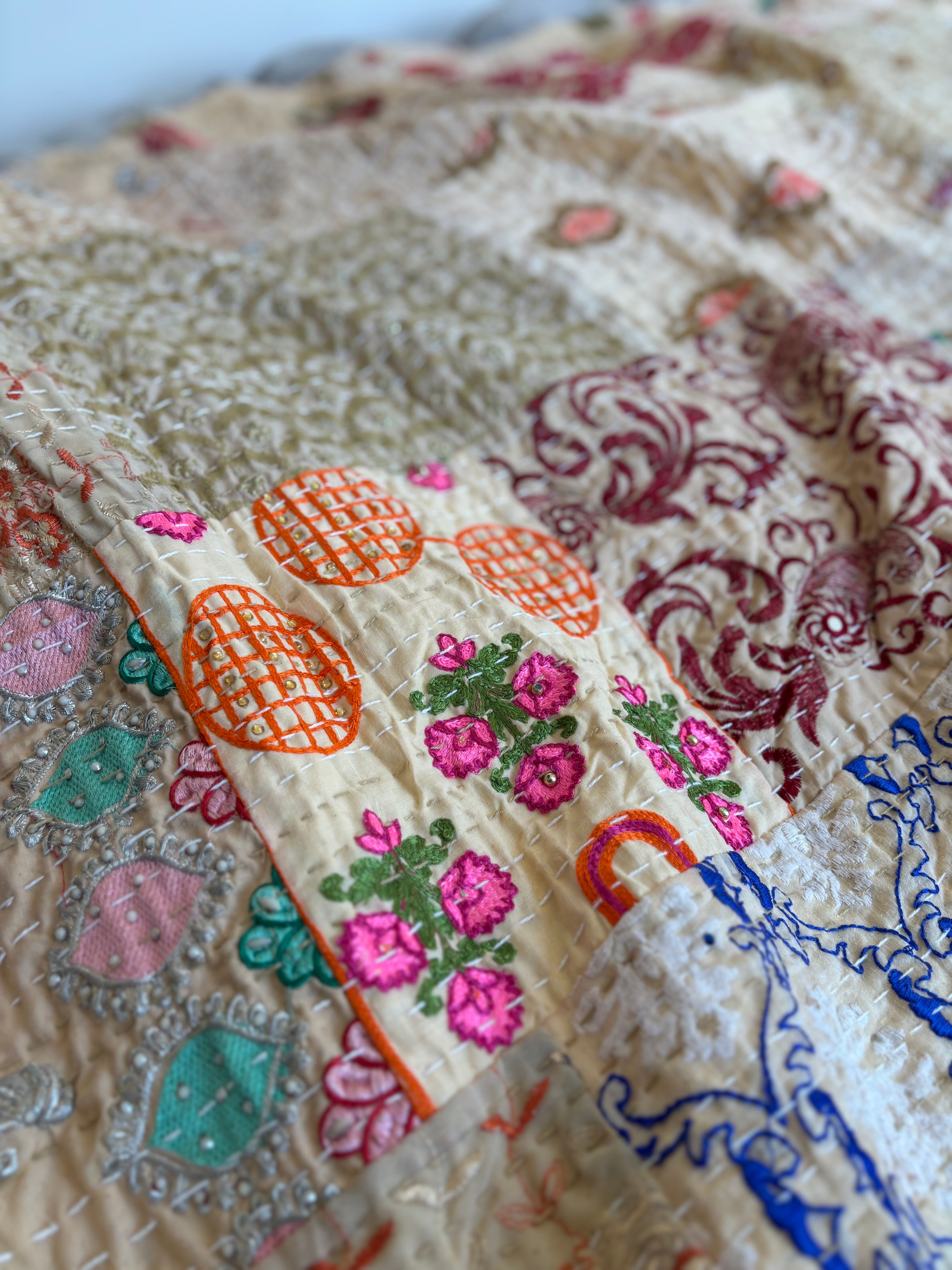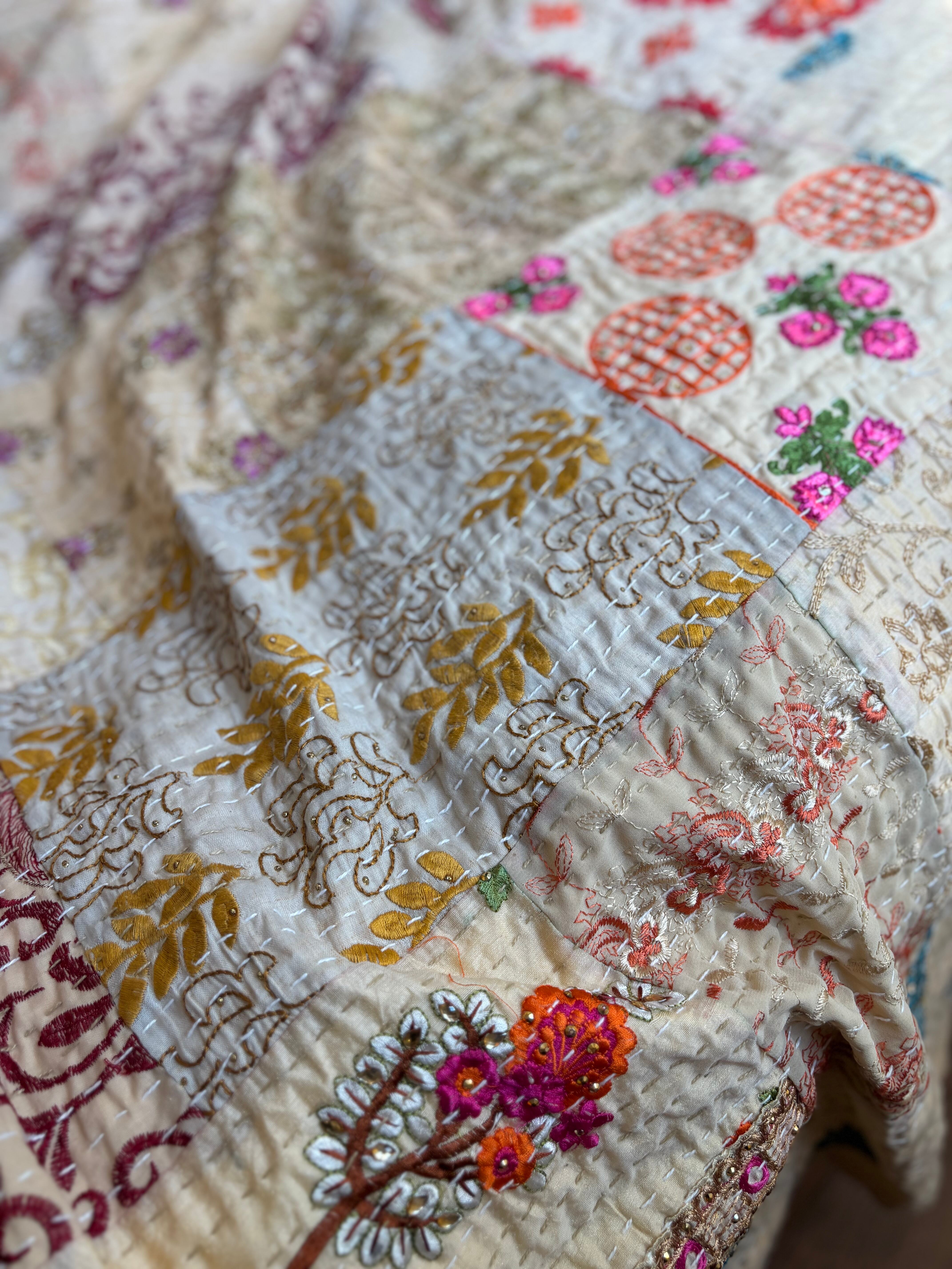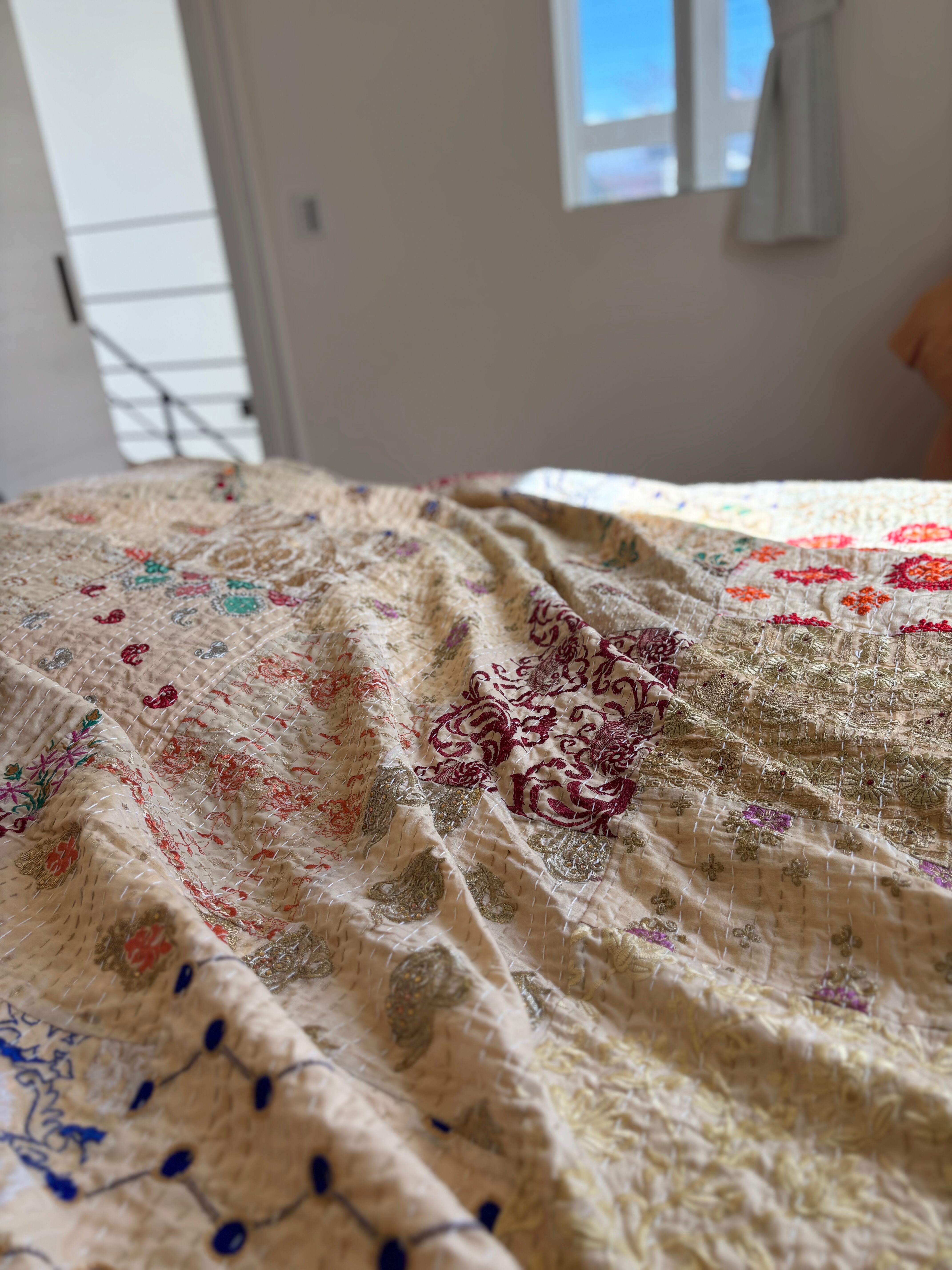 繋ぎ合わせたパッチワークキルトはとても華やか。