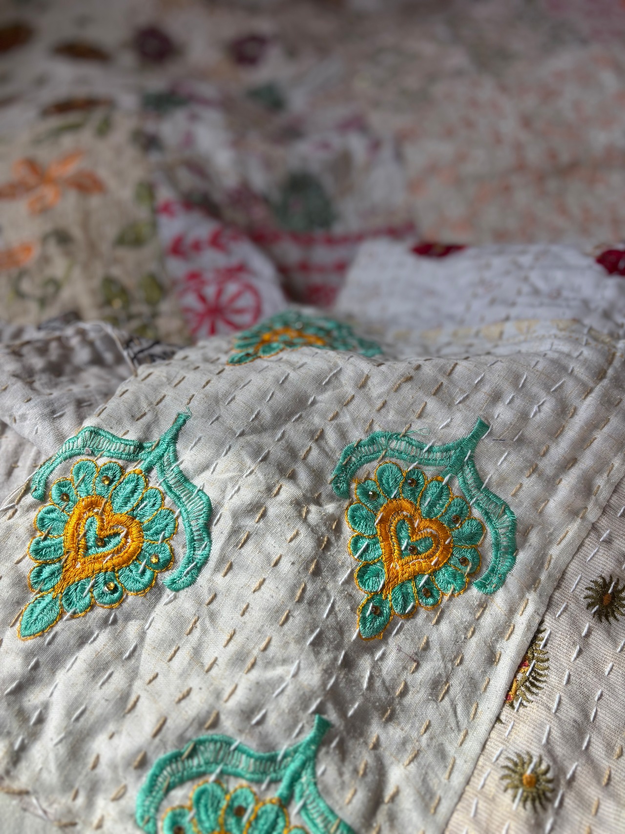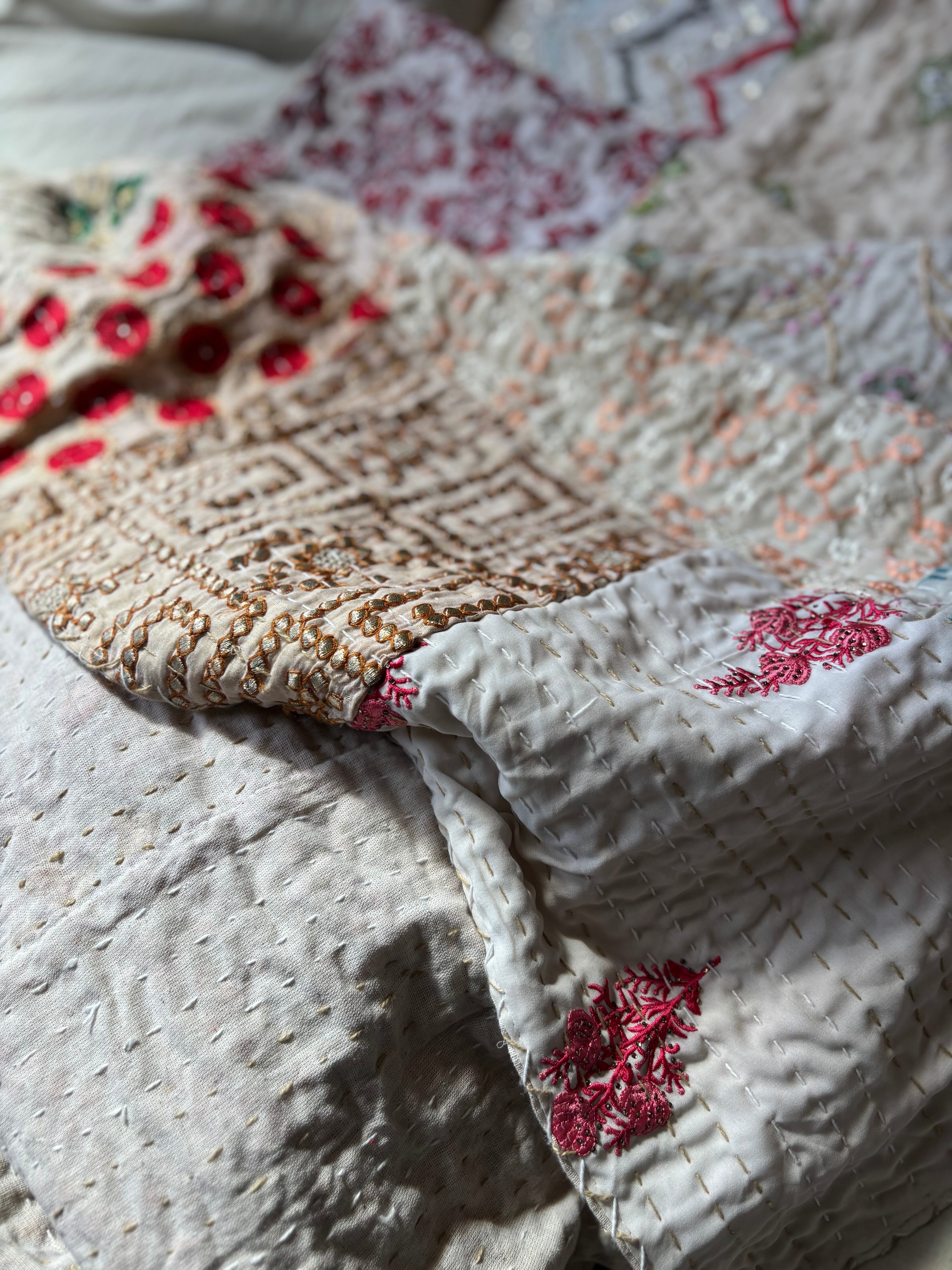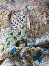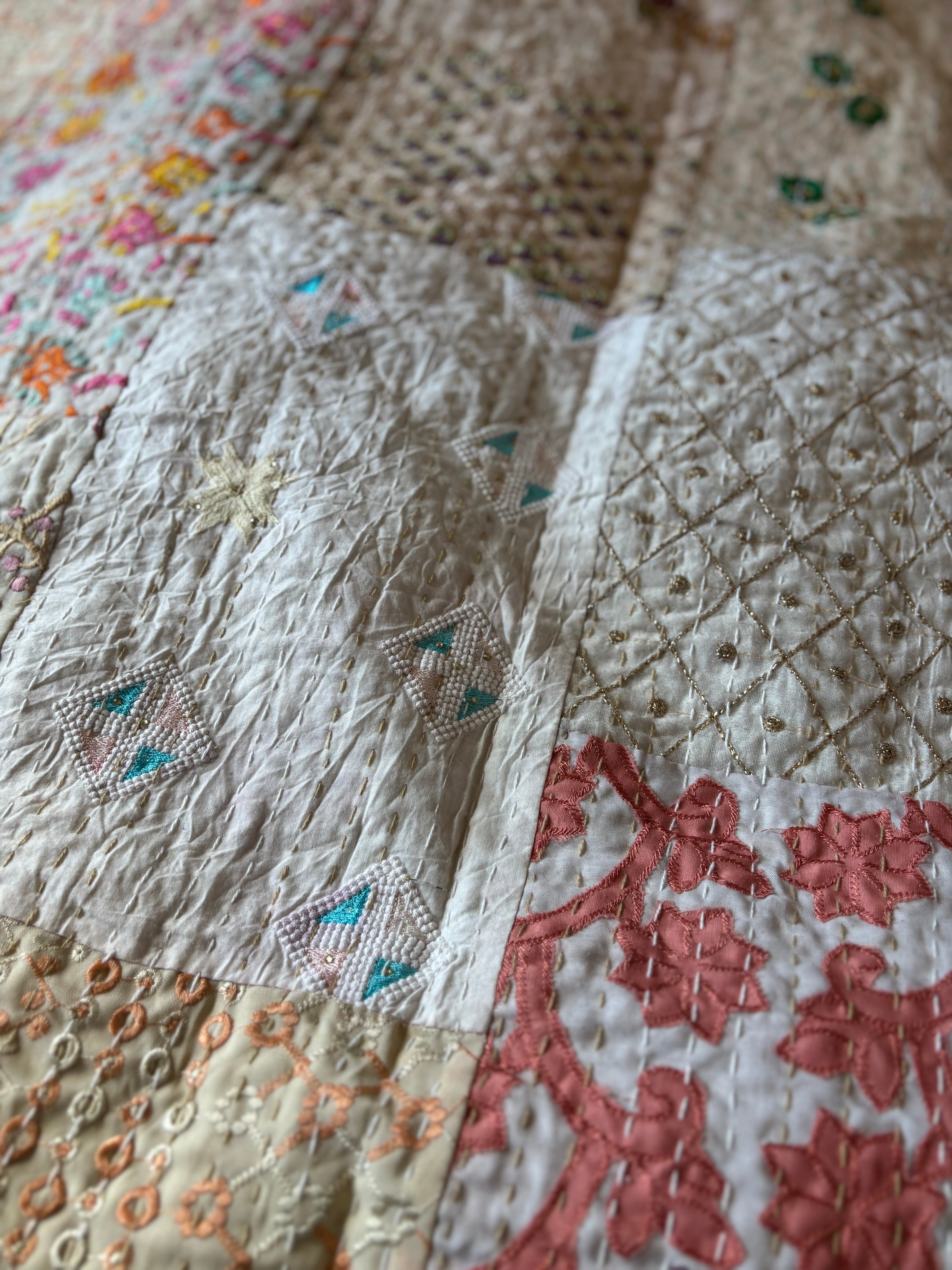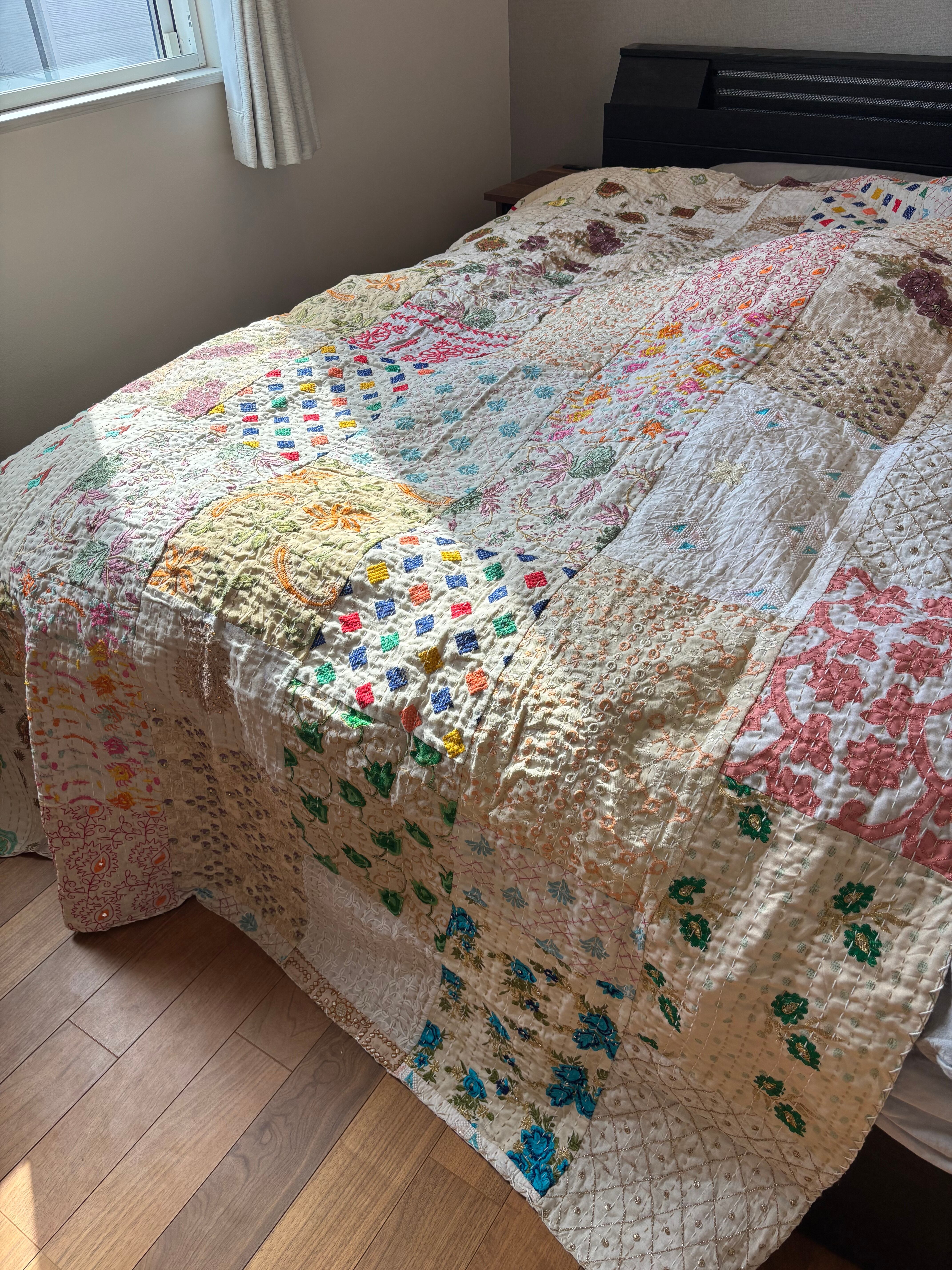 繋ぎ合わせたパッチワークキルトはとても華やか。